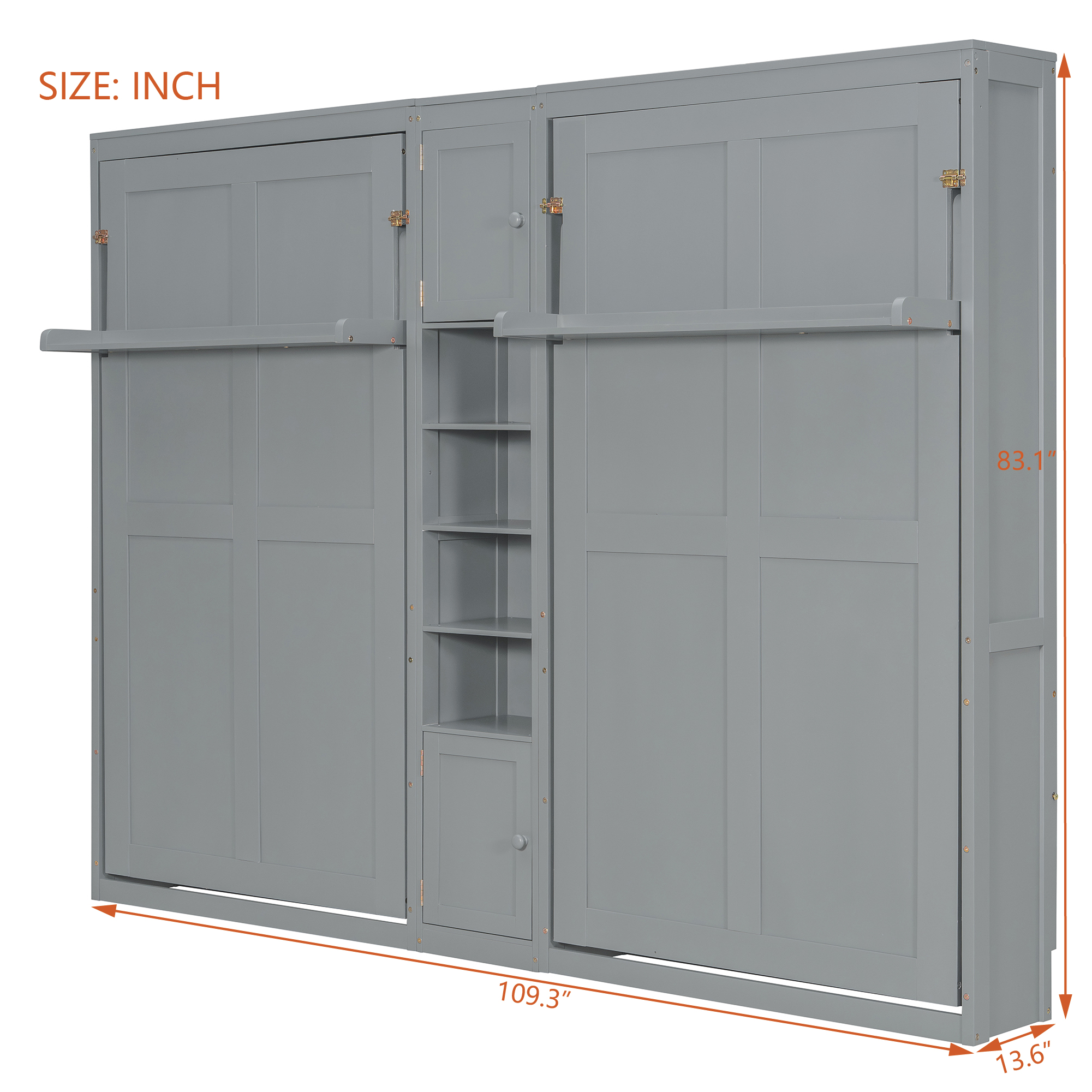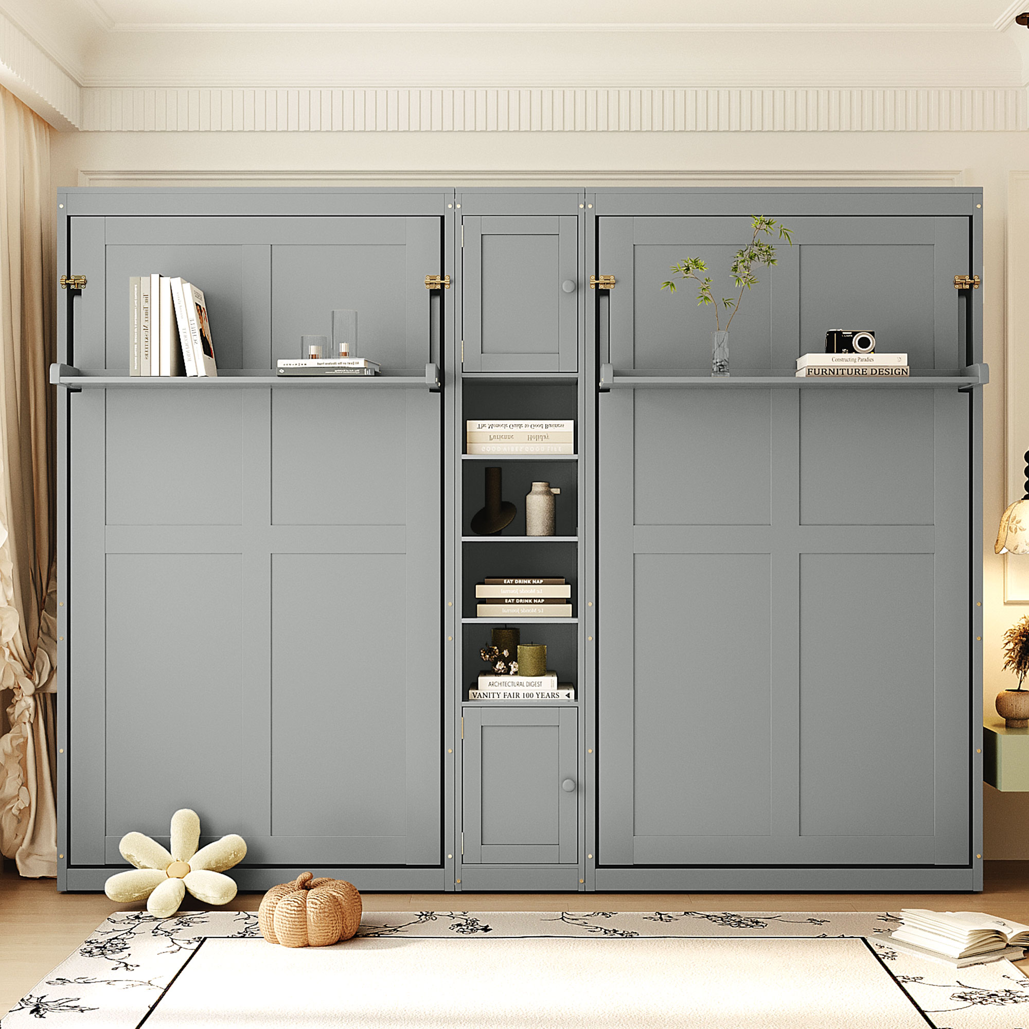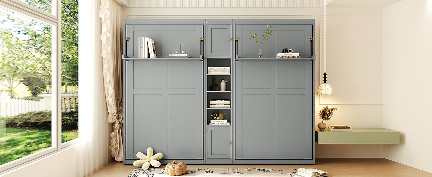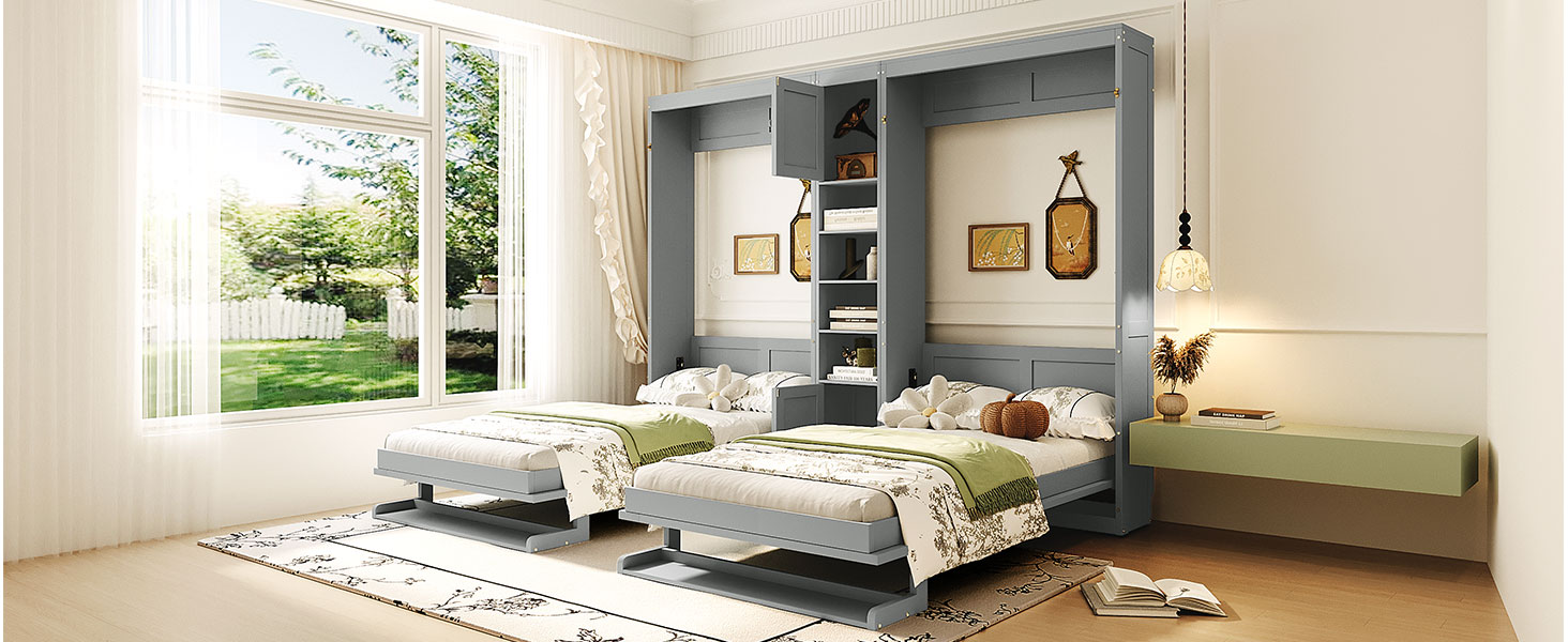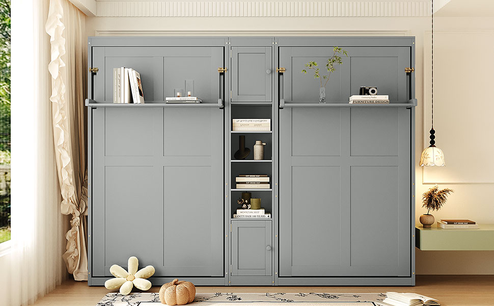 Maximize your space with this Dual Twin Size Murphy Beds Unit — a smart, stylish solution for shared rooms, guest areas, or multifunctional spaces. This innovative design features two twin-size wall murphy beds, each with a shelf that serves as display space when closed and transforms into a sturdy support leg when the bed is in use. Between the two beds are two spacious cabinets and four open storage shelves, offering ample room to organize books, décor, or daily essentials. With clean lines and a compact footprint, this Murphy bed unit combines comfort, storage, and practicality in one space-saving centerpiece.