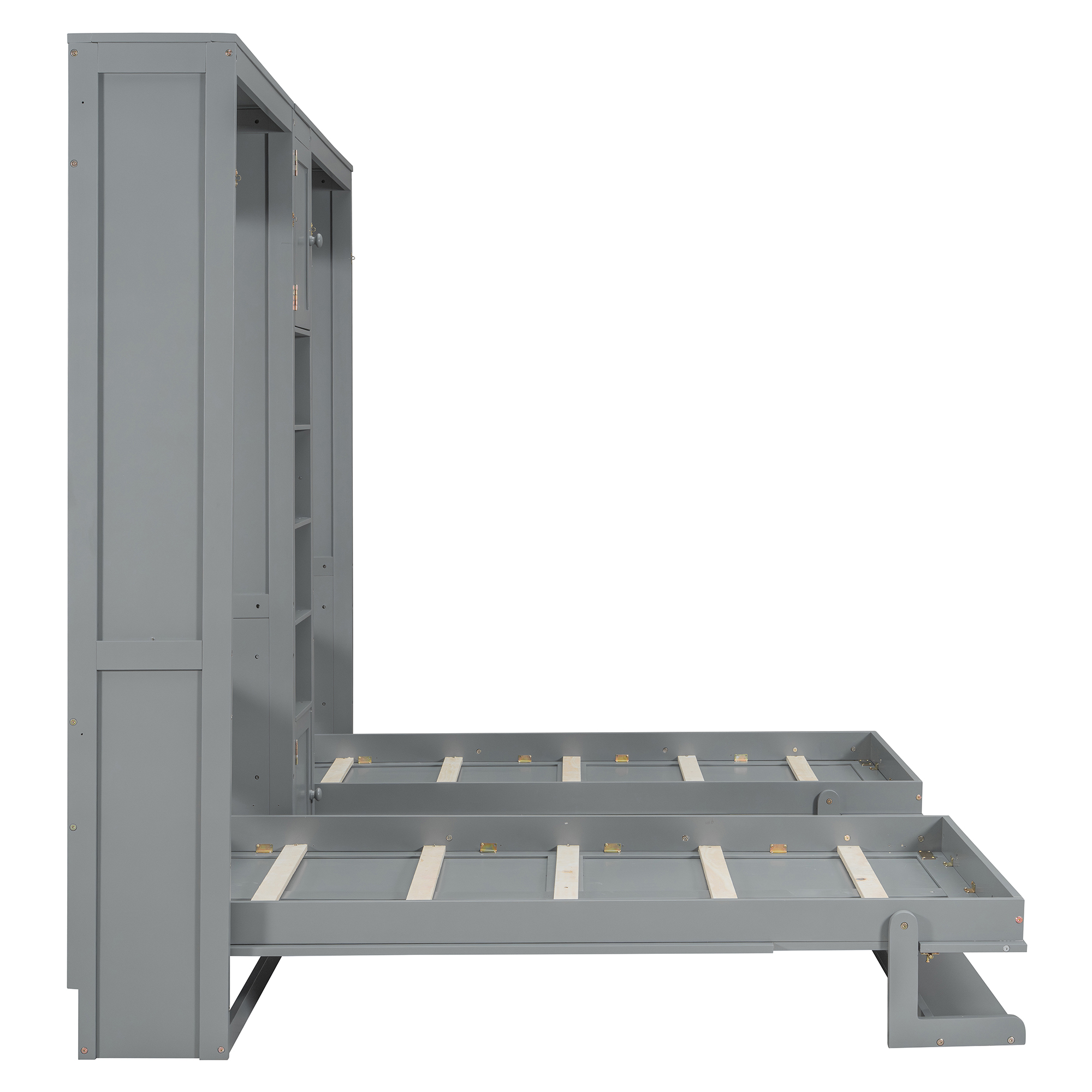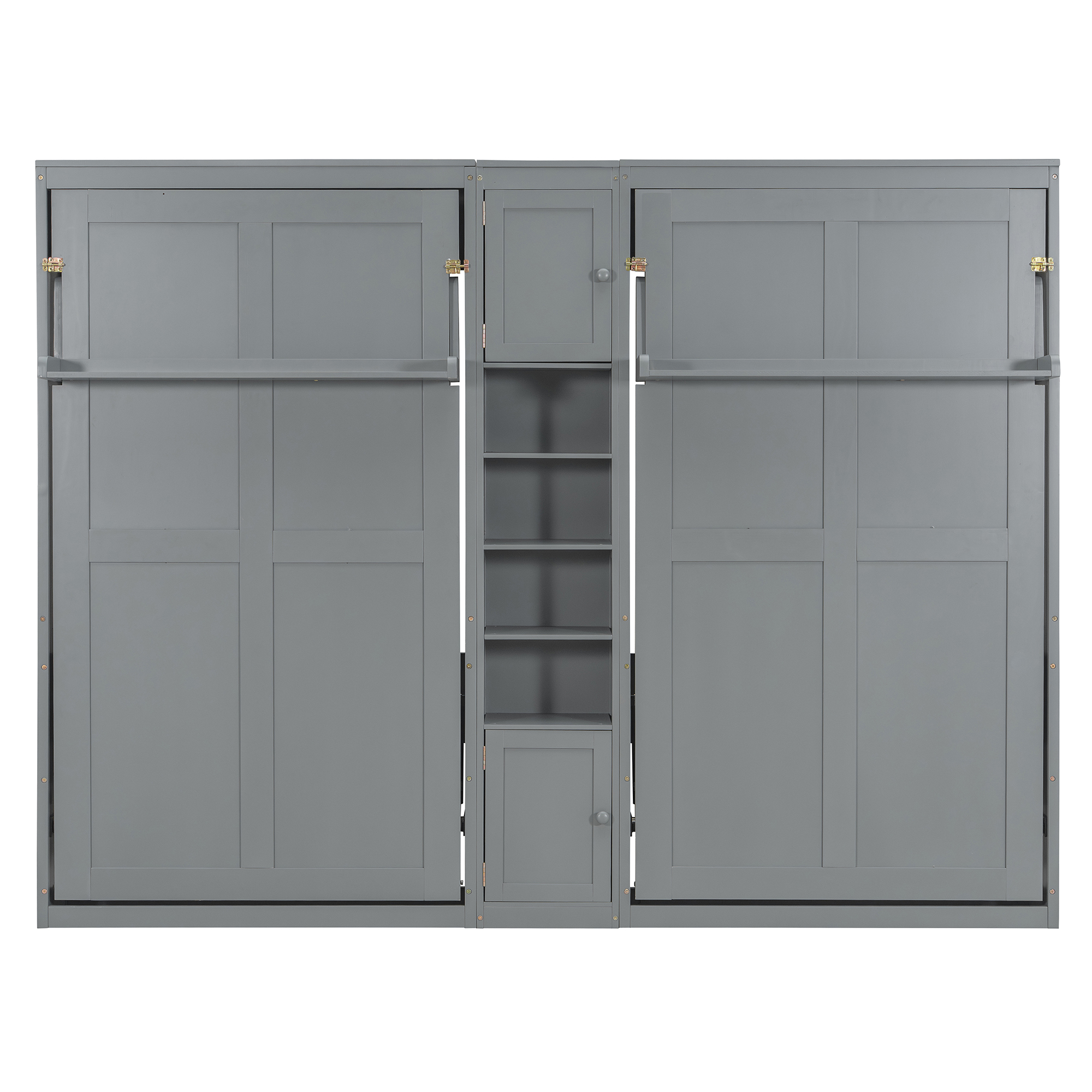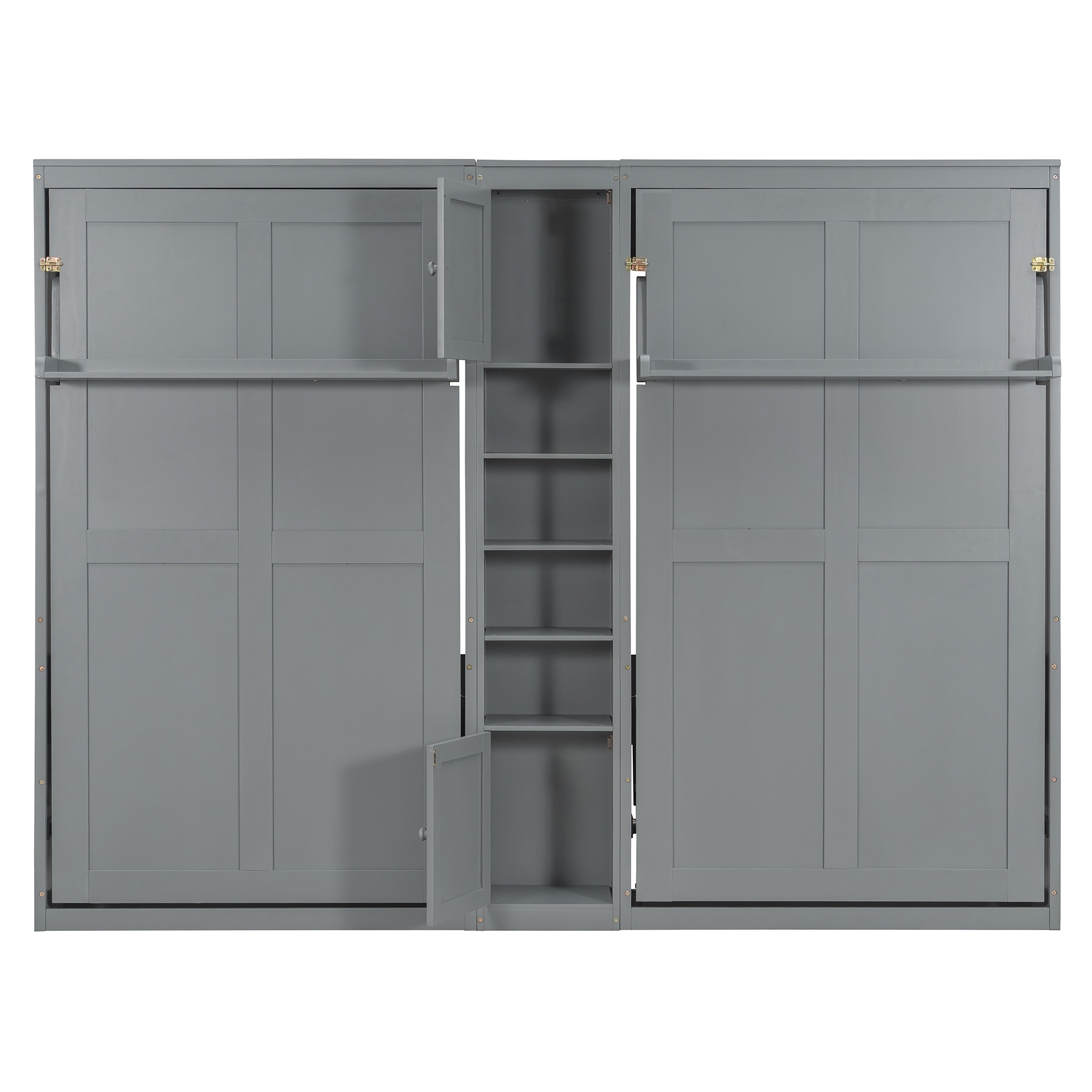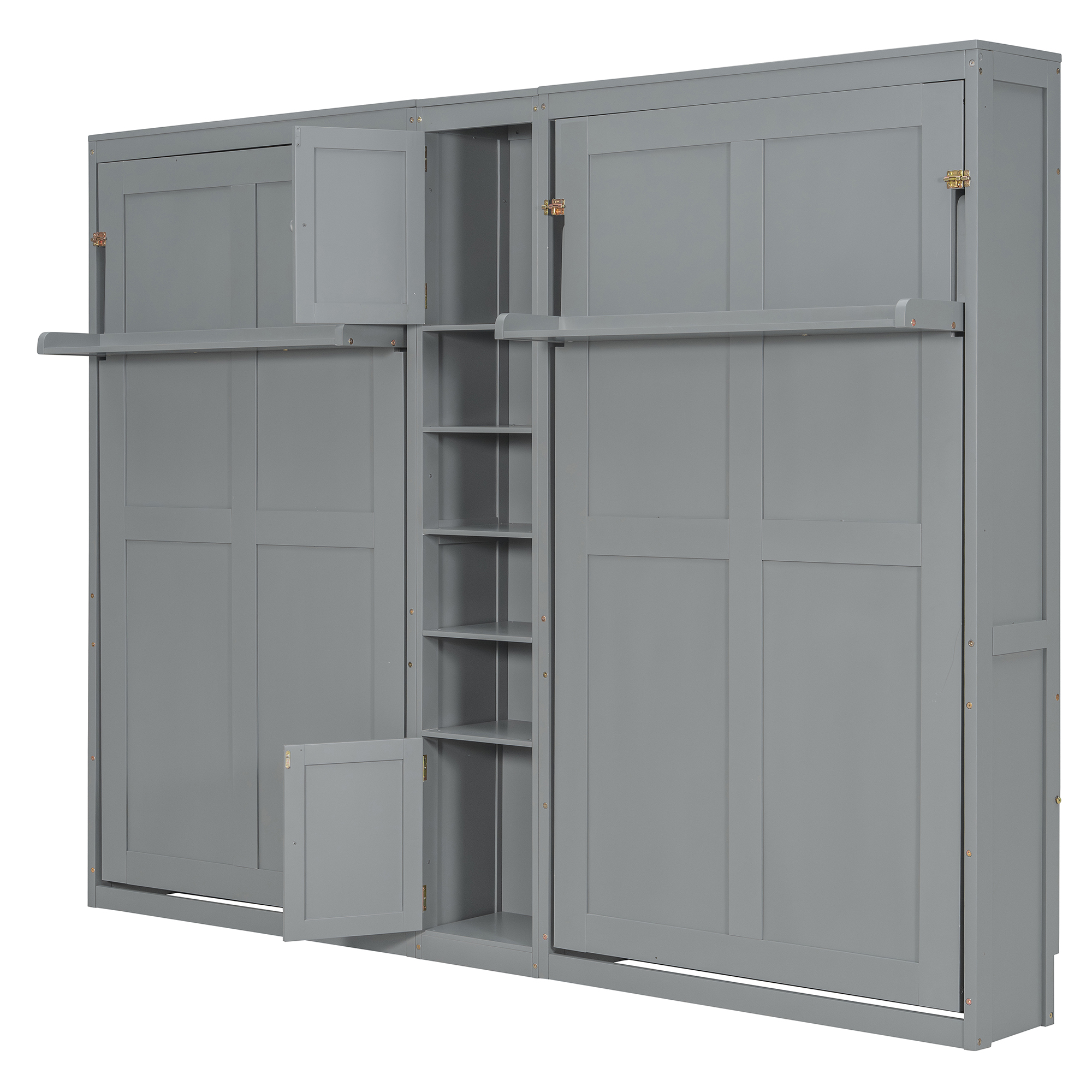 Maximize your space with this Dual Twin Size Murphy Beds Unit — a smart, stylish solution for shared rooms, guest areas, or multifunctional spaces. This innovative design features two twin-size wall murphy beds, each with a shelf that serves as display space when closed and transforms into a sturdy support leg when the bed is in use. Between the two beds are two spacious cabinets and four open storage shelves, offering ample room to organize books, décor, or daily essentials. With clean lines and a compact footprint, this Murphy bed unit combines comfort, storage, and practicality in one space-saving centerpiece.