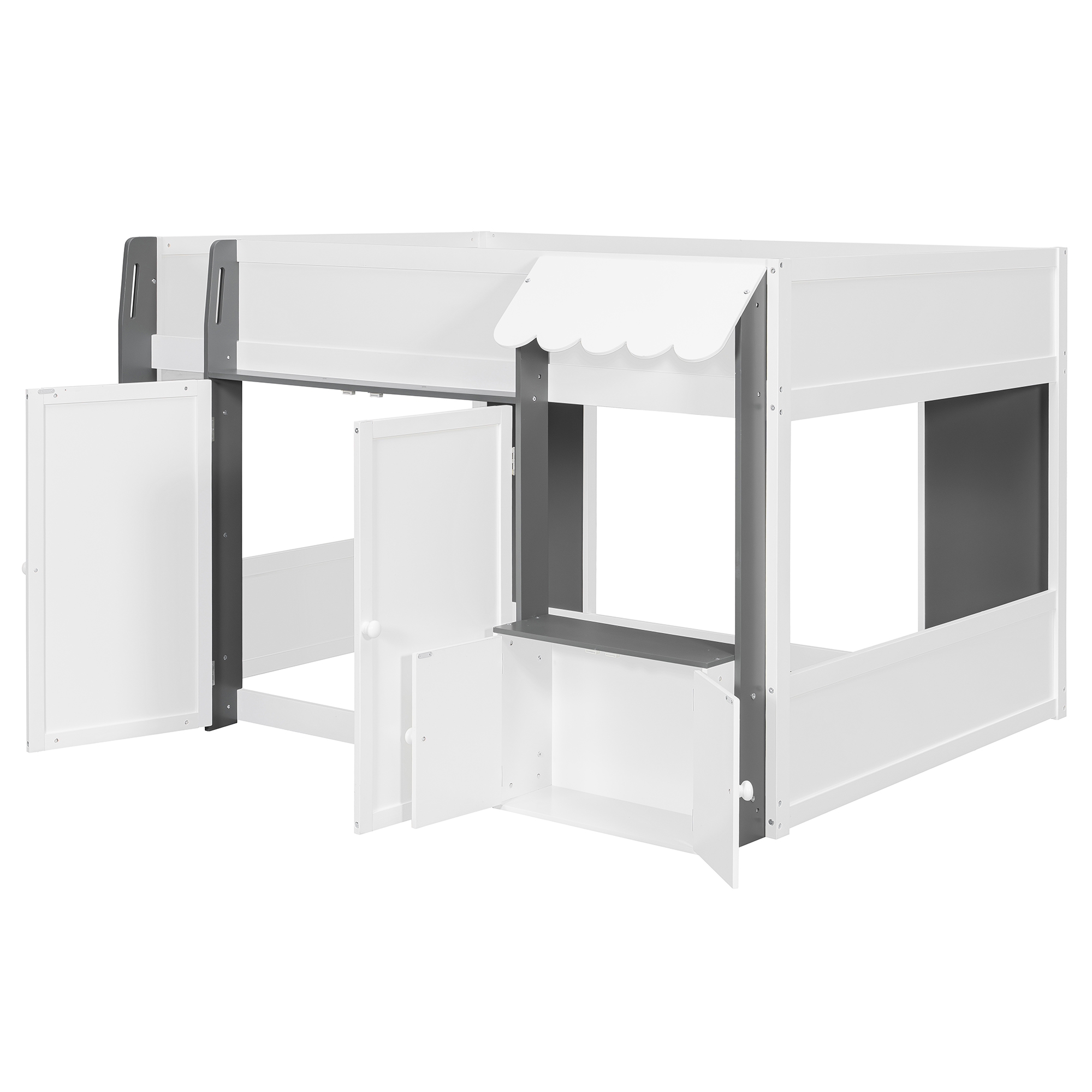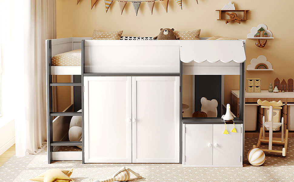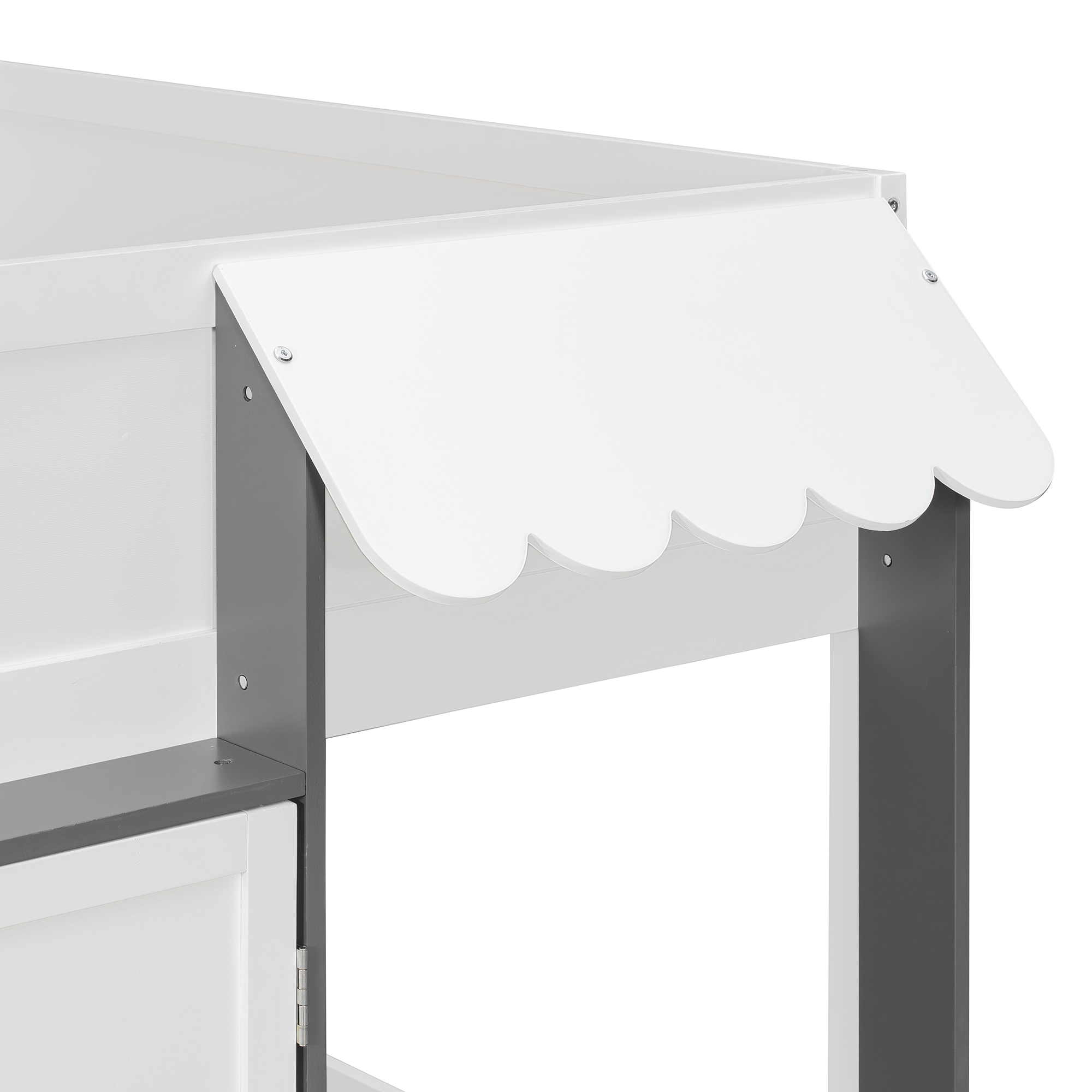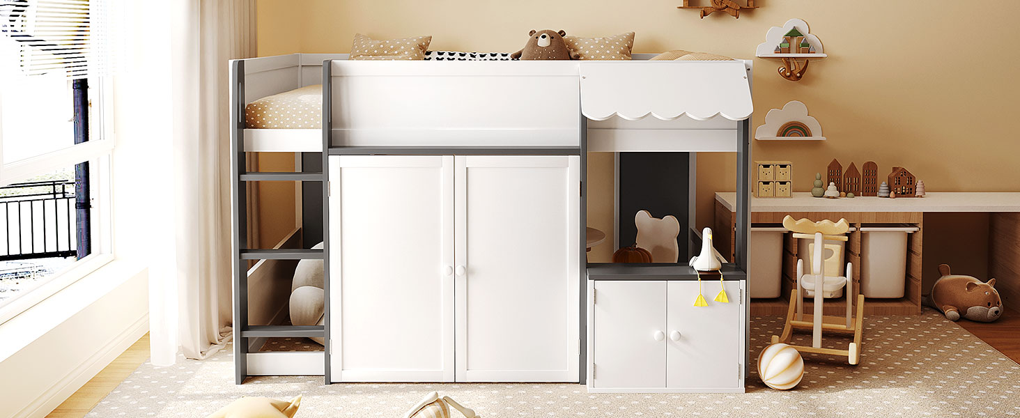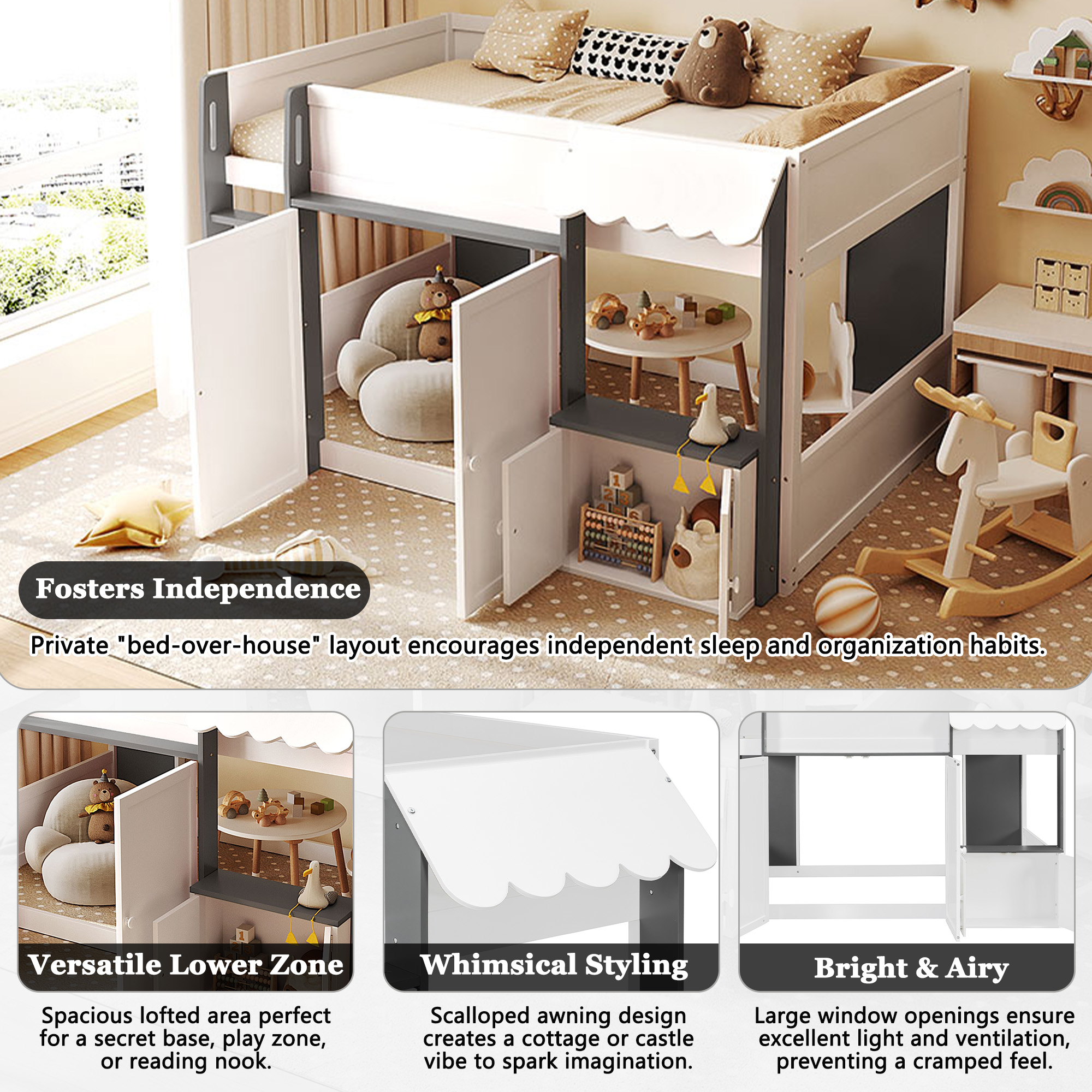 - [Whimsical Playhouse Design] Featuring a charming scalloped awning and a house-like silhouette, this bed creates a magical “bed-over-house” layout that sparks imagination and turns any bedroom into a fairytale cottage or castle.