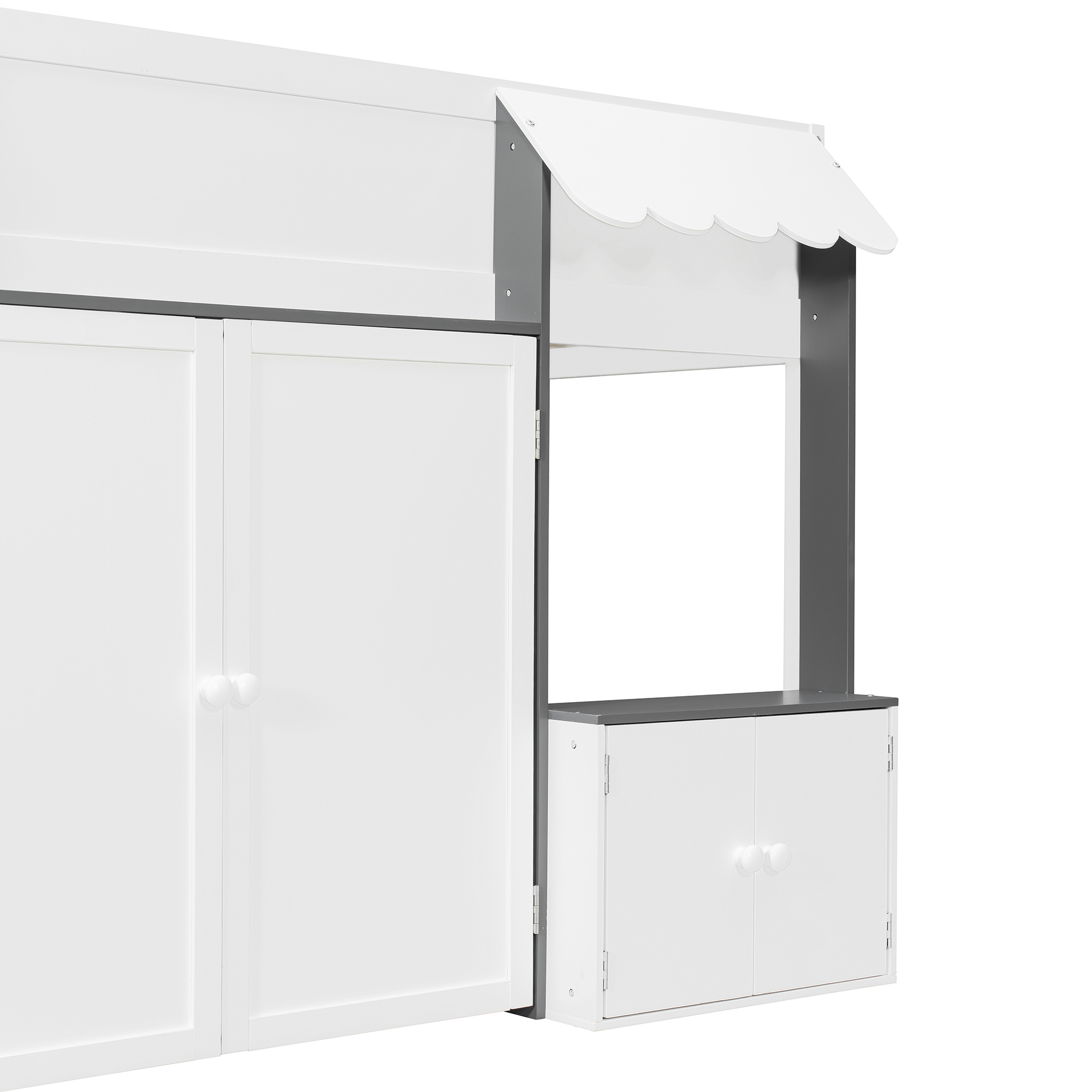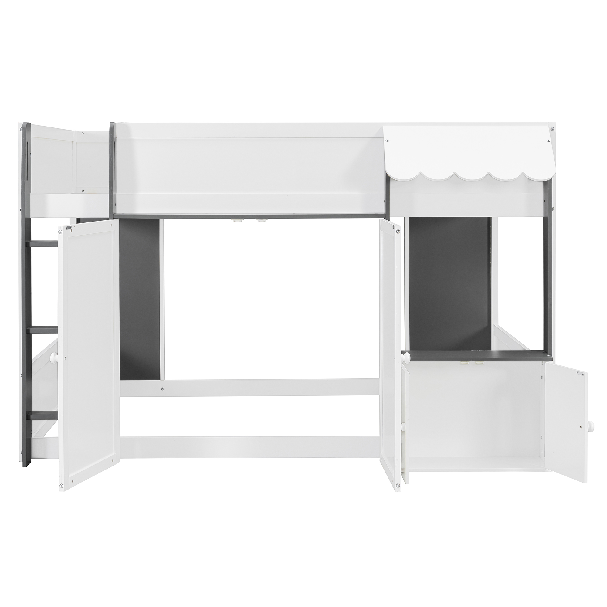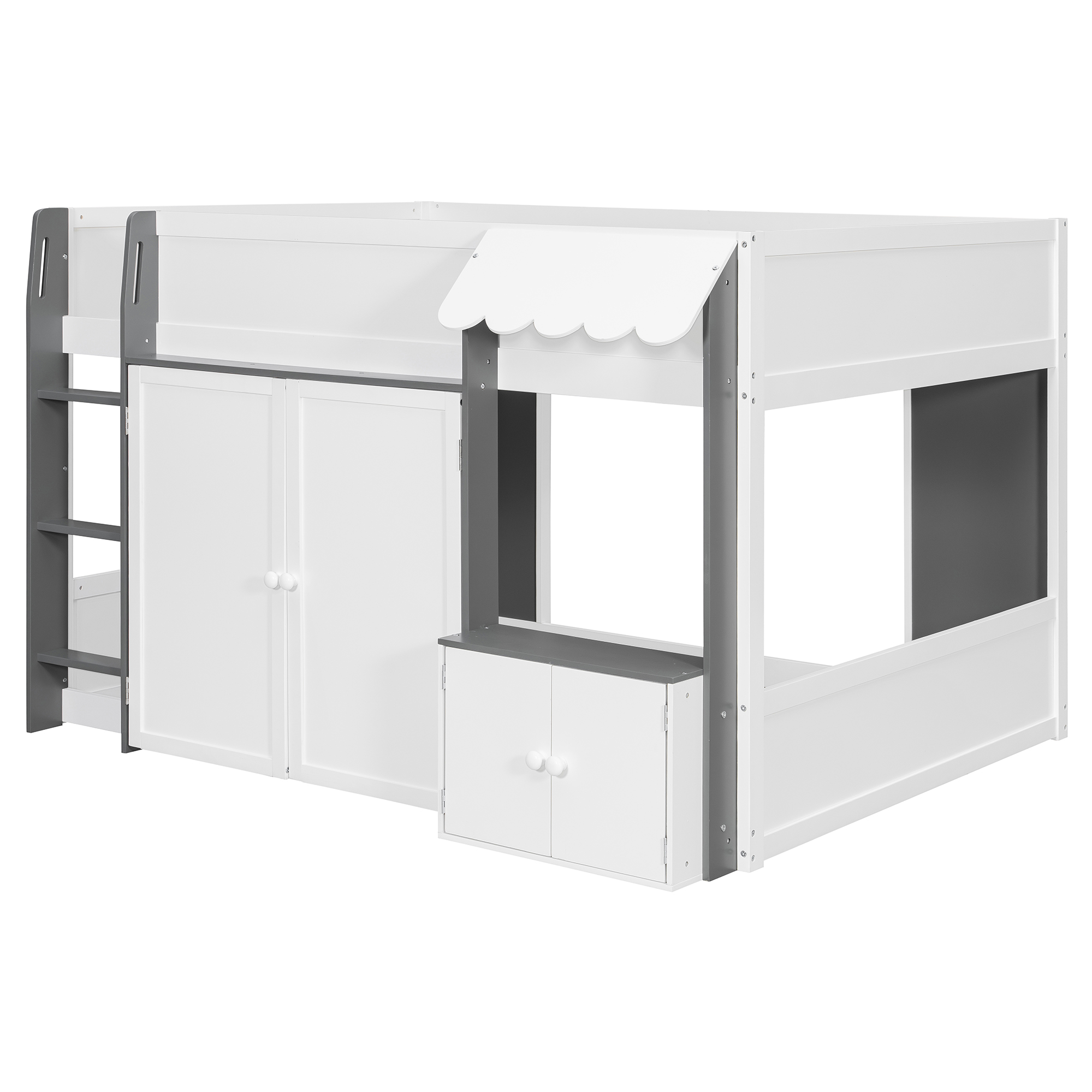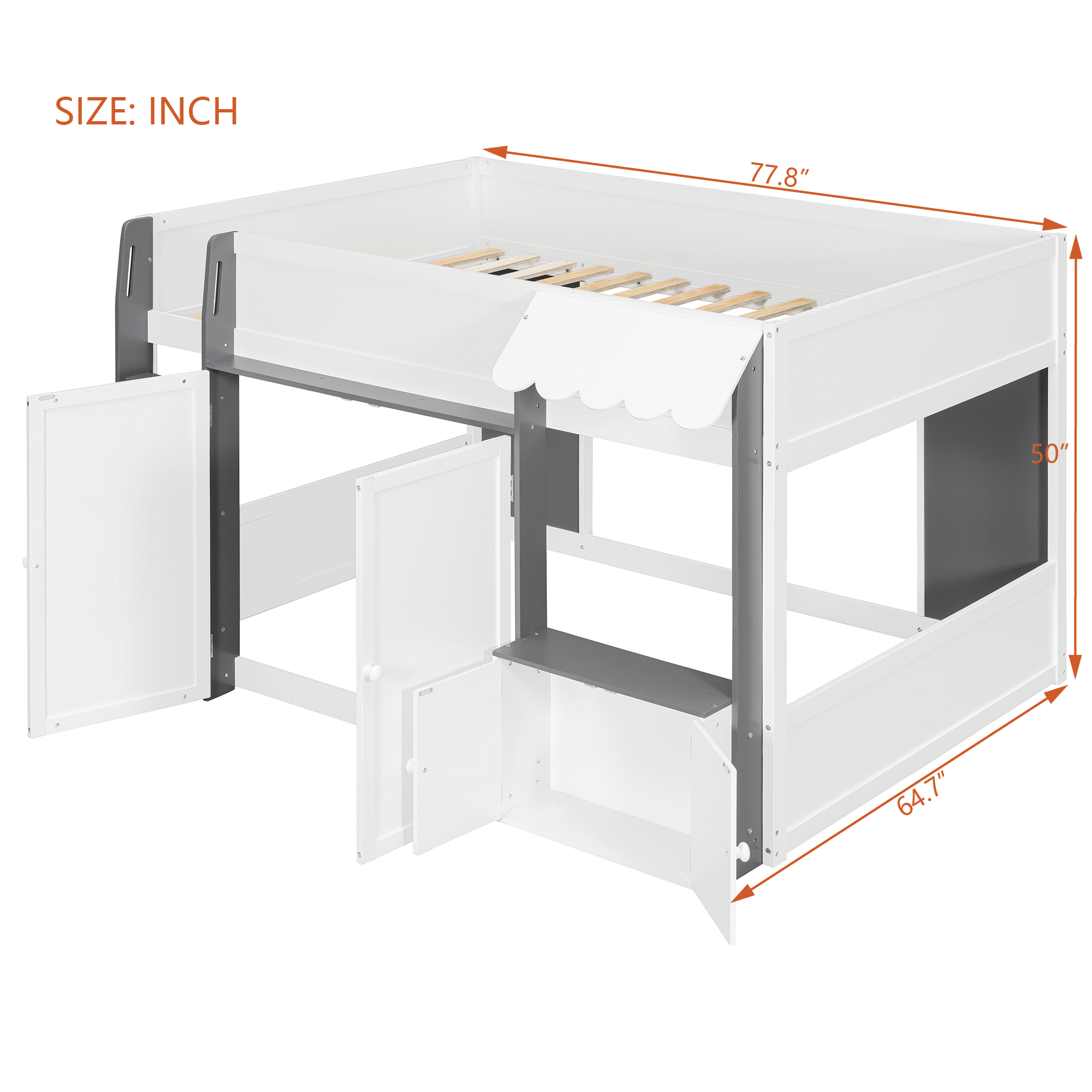 - [Whimsical Playhouse Design] Featuring a charming scalloped awning and a house-like silhouette, this bed creates a magical “bed-over-house” layout that sparks imagination and turns any bedroom into a fairytale cottage or castle.
