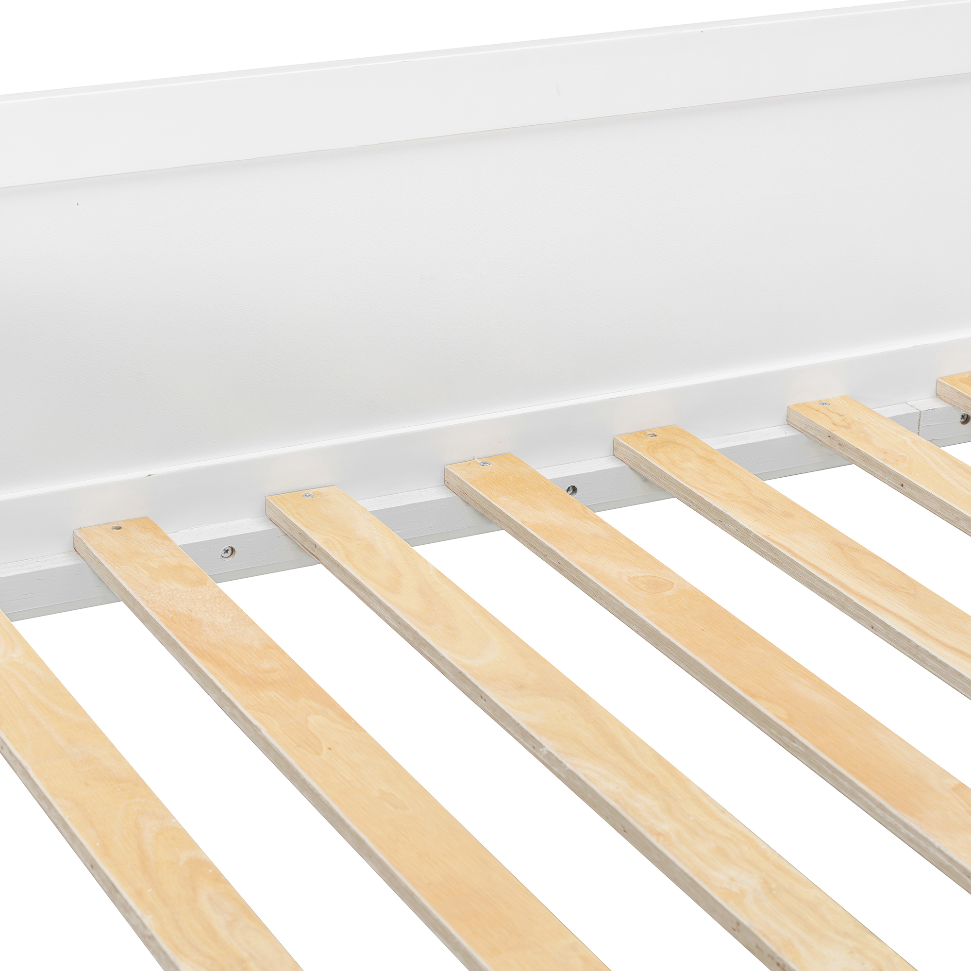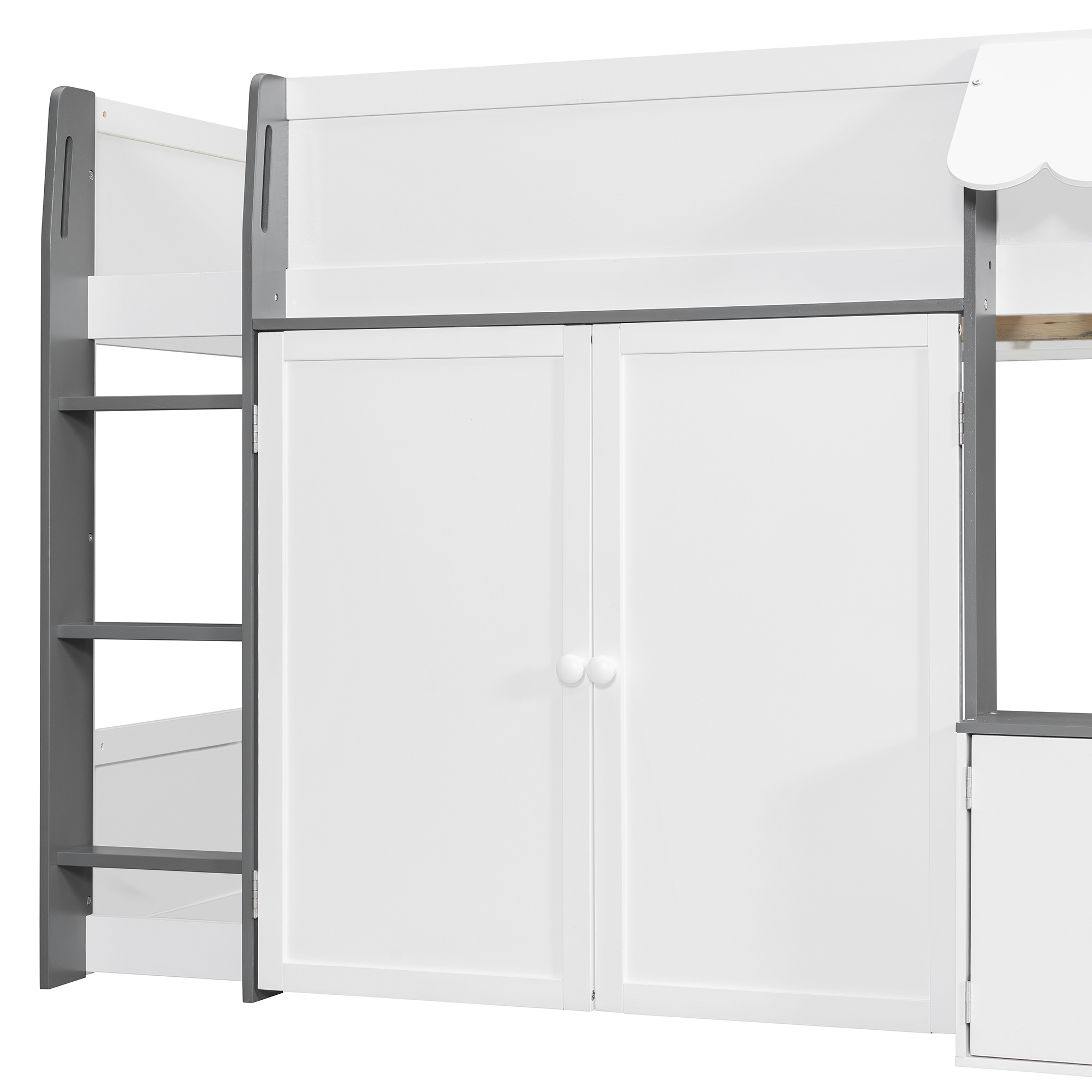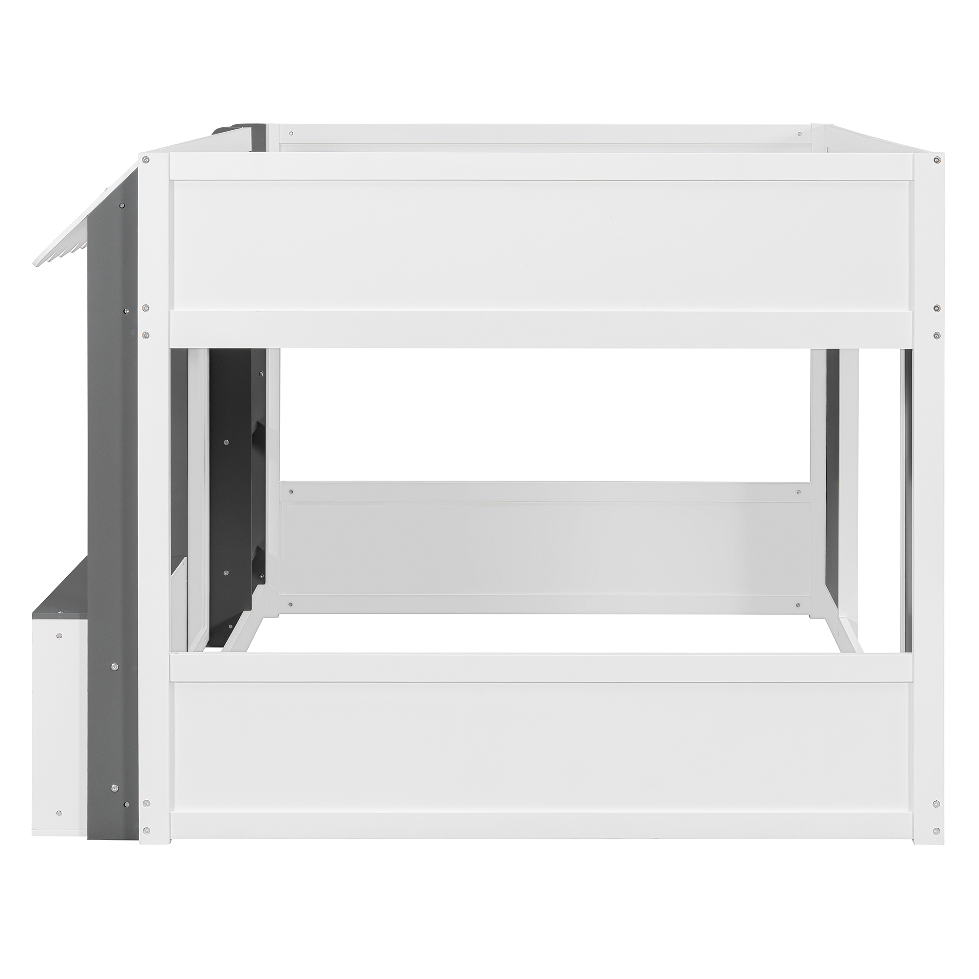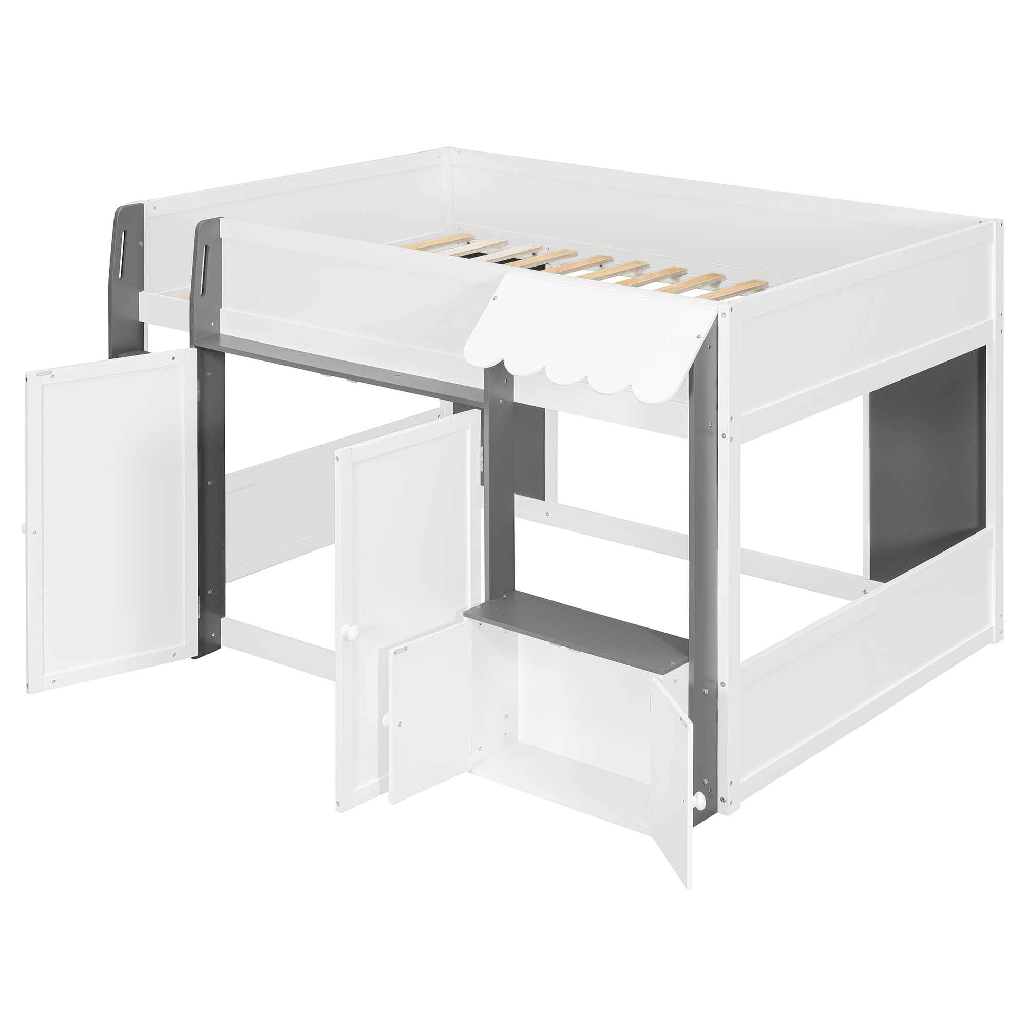 - [Whimsical Playhouse Design] Featuring a charming scalloped awning and a house-like silhouette, this bed creates a magical “bed-over-house” layout that sparks imagination and turns any bedroom into a fairytale cottage or castle.