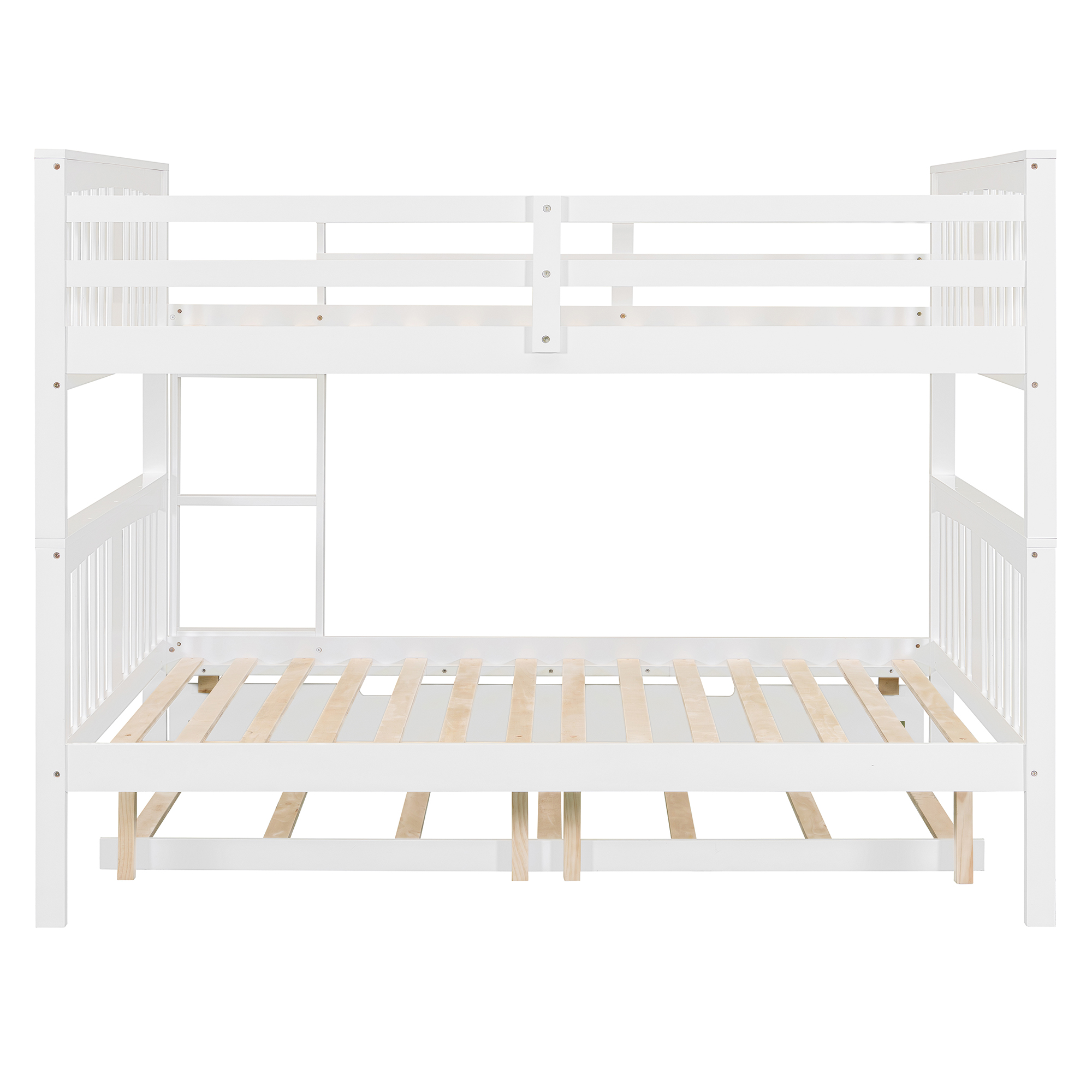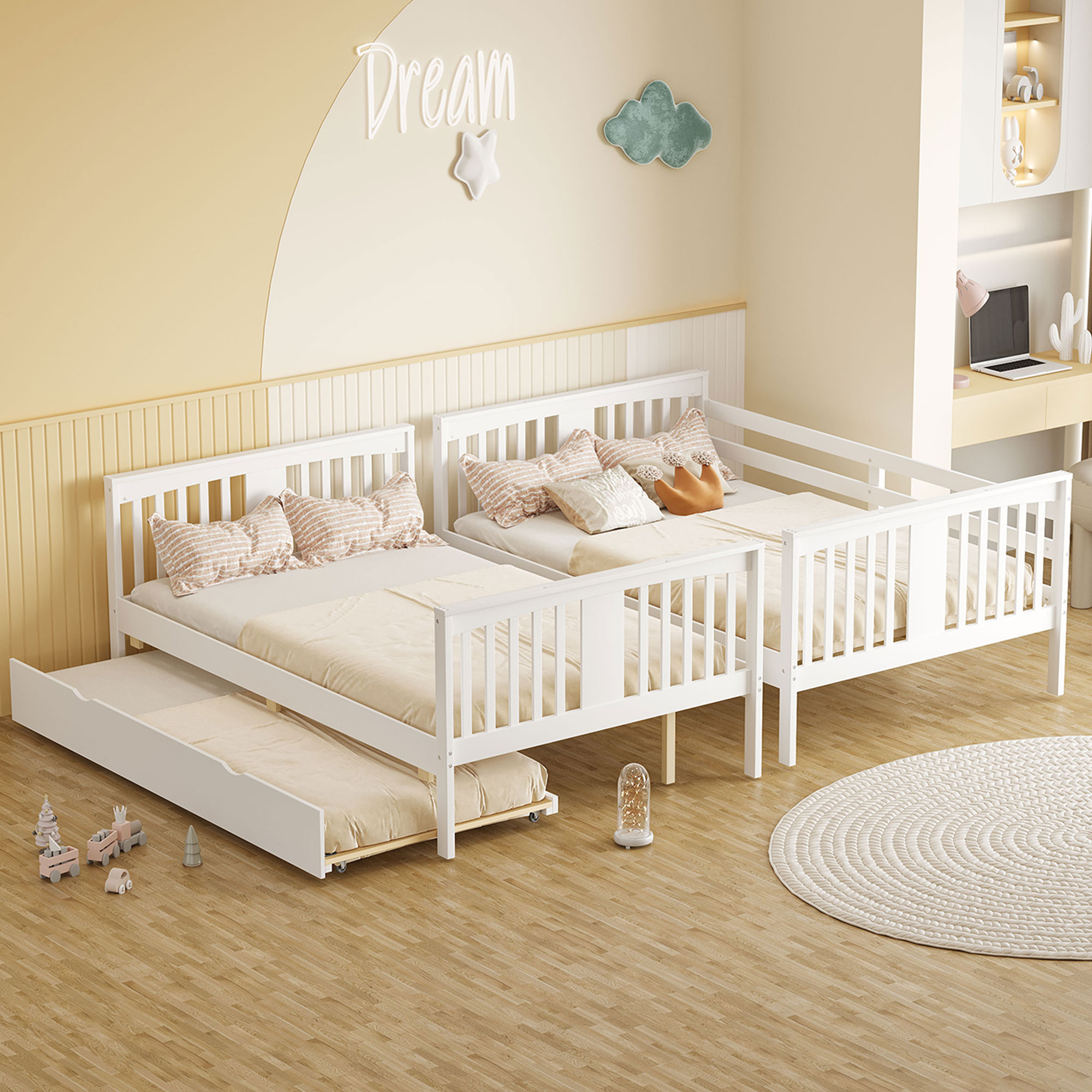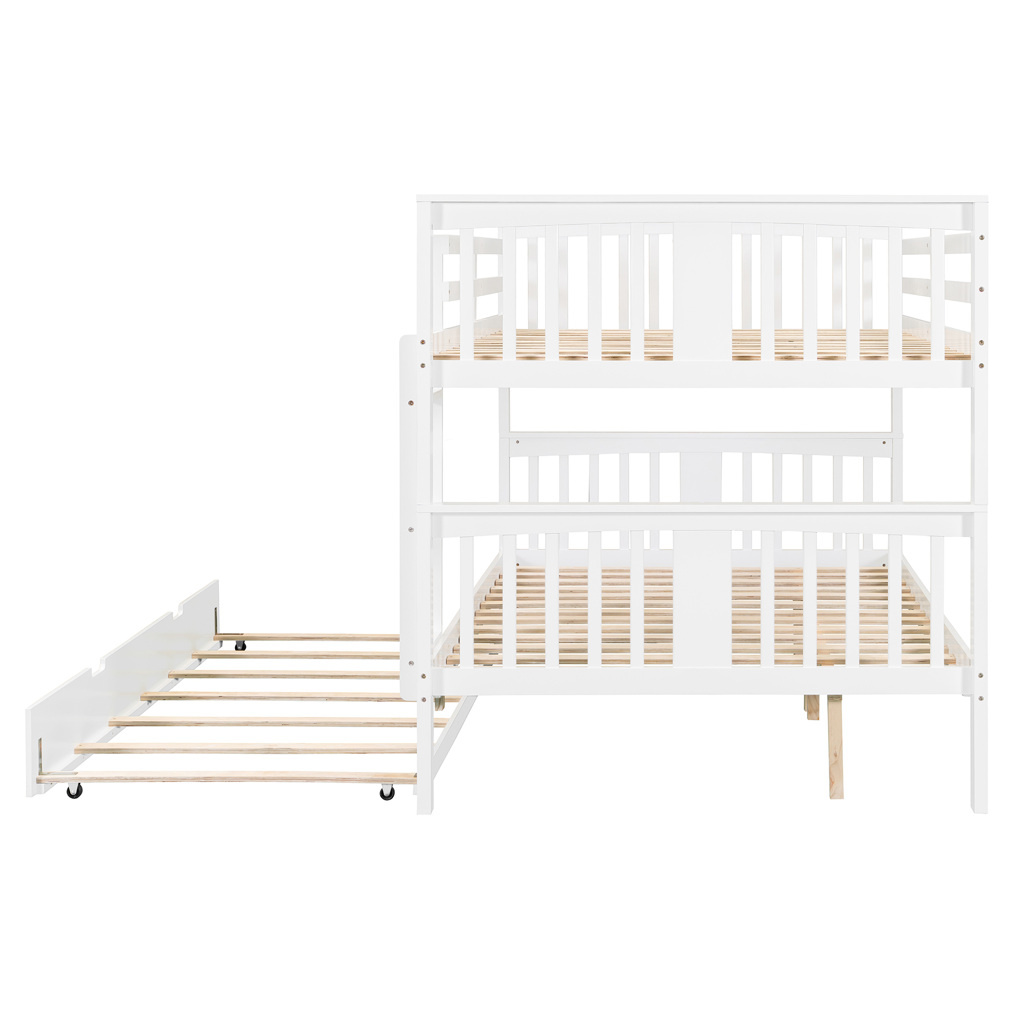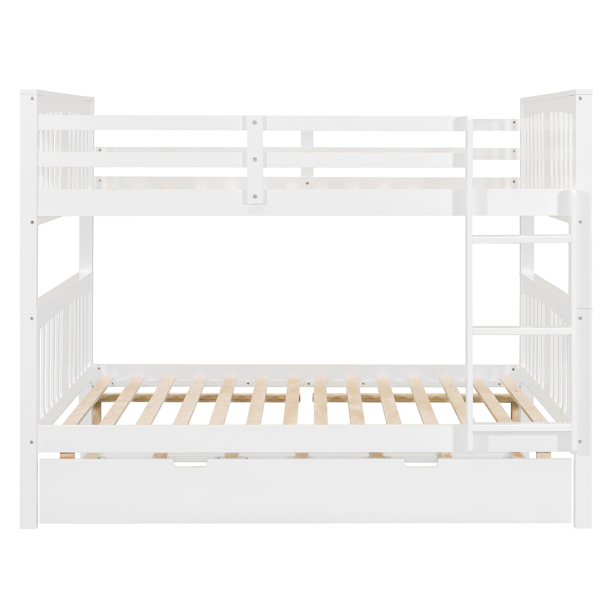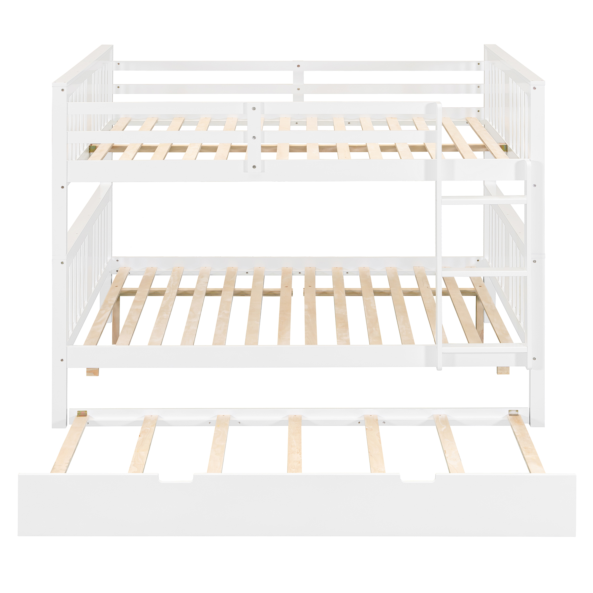 - [Versatility galore] This bunk bed features one full size upper bed, one full size bottom bed and a twin size trundle for accommodating you or any overnight sleepers. It can also be divided into two individual beds for even more convenience, depending on how you want to organize your space. No spring box needed.