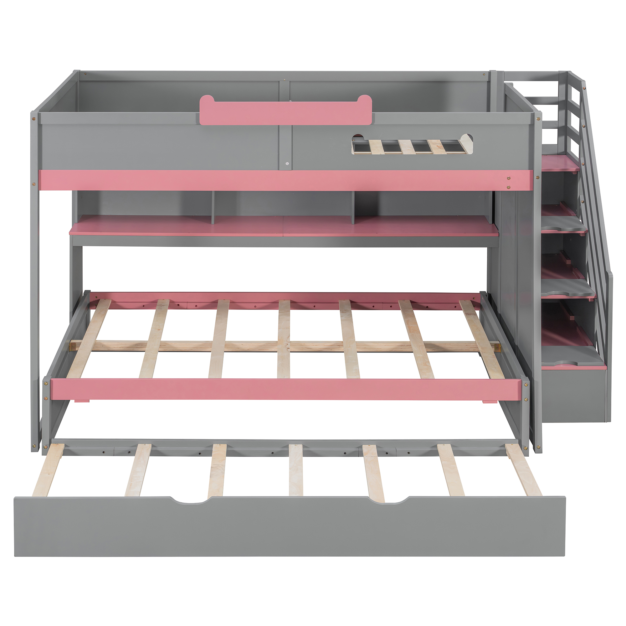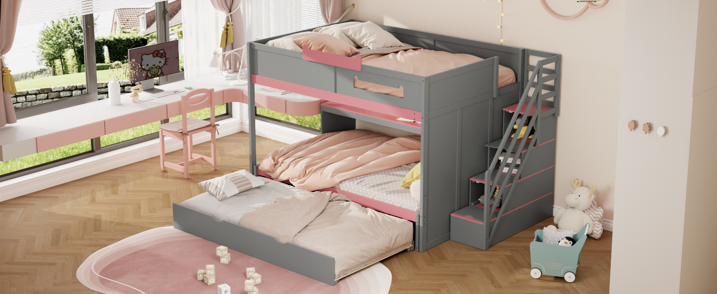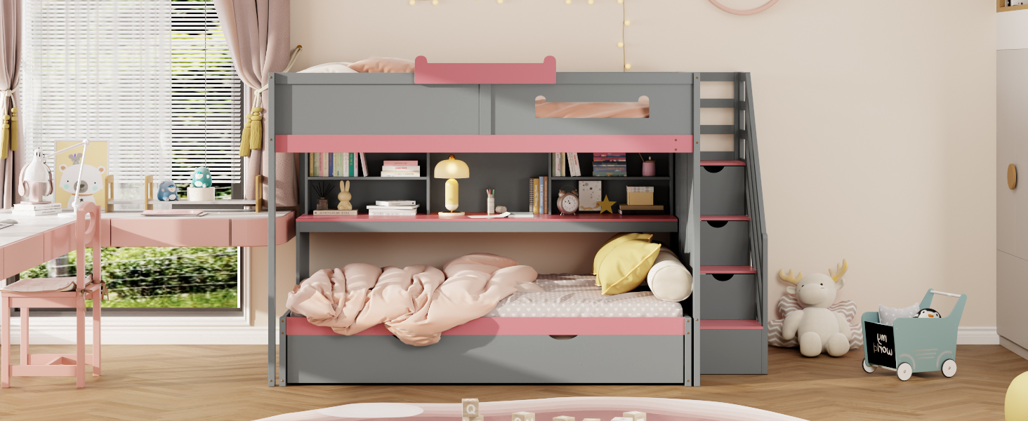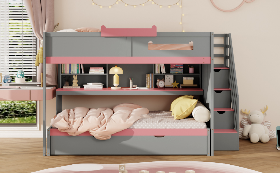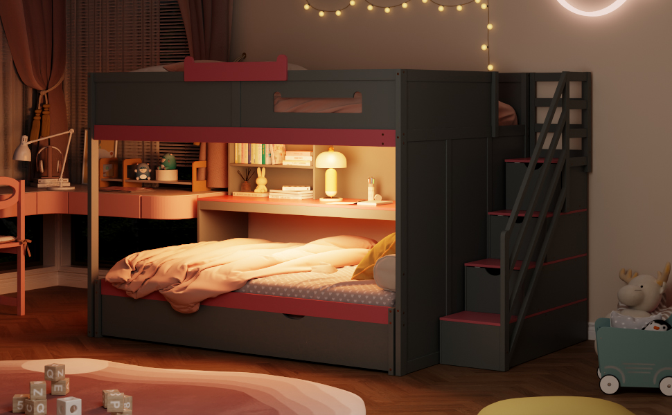 Full Over Full Bunk Bed With Twin Size Trundle, Staircase, Shelves and LED
