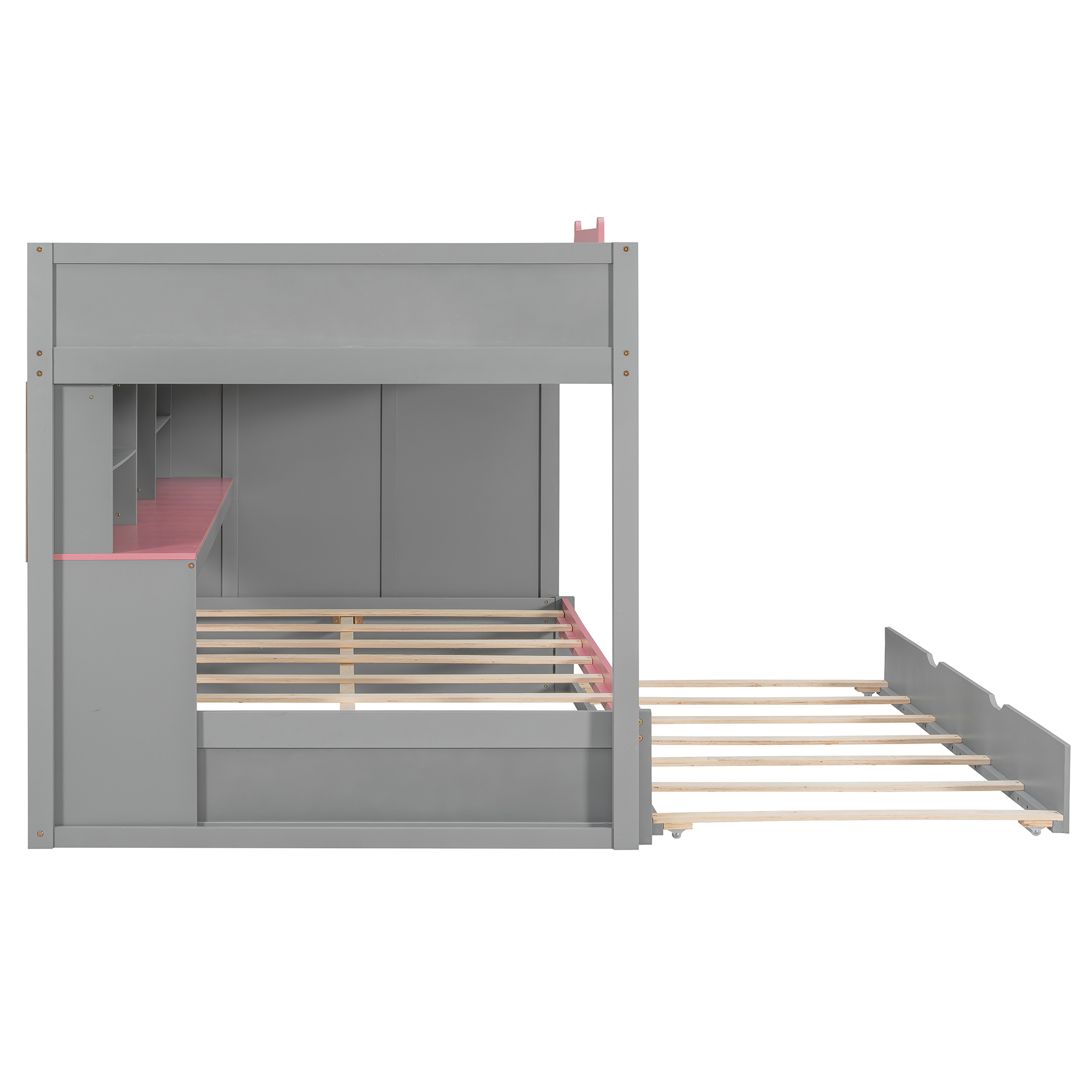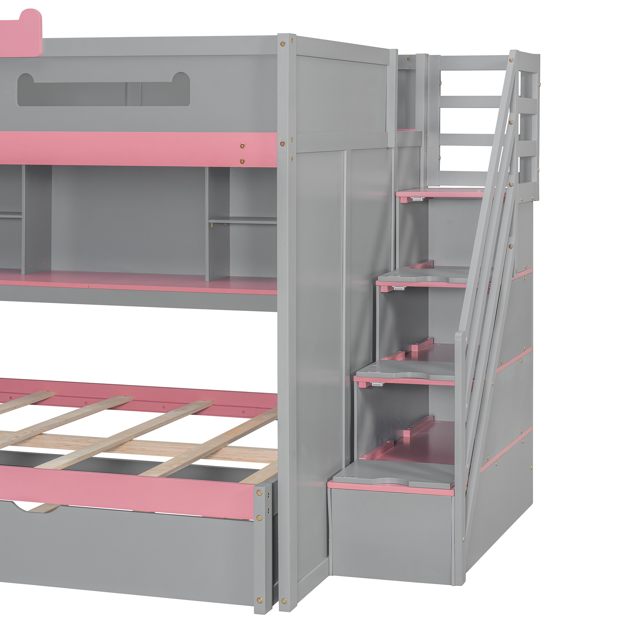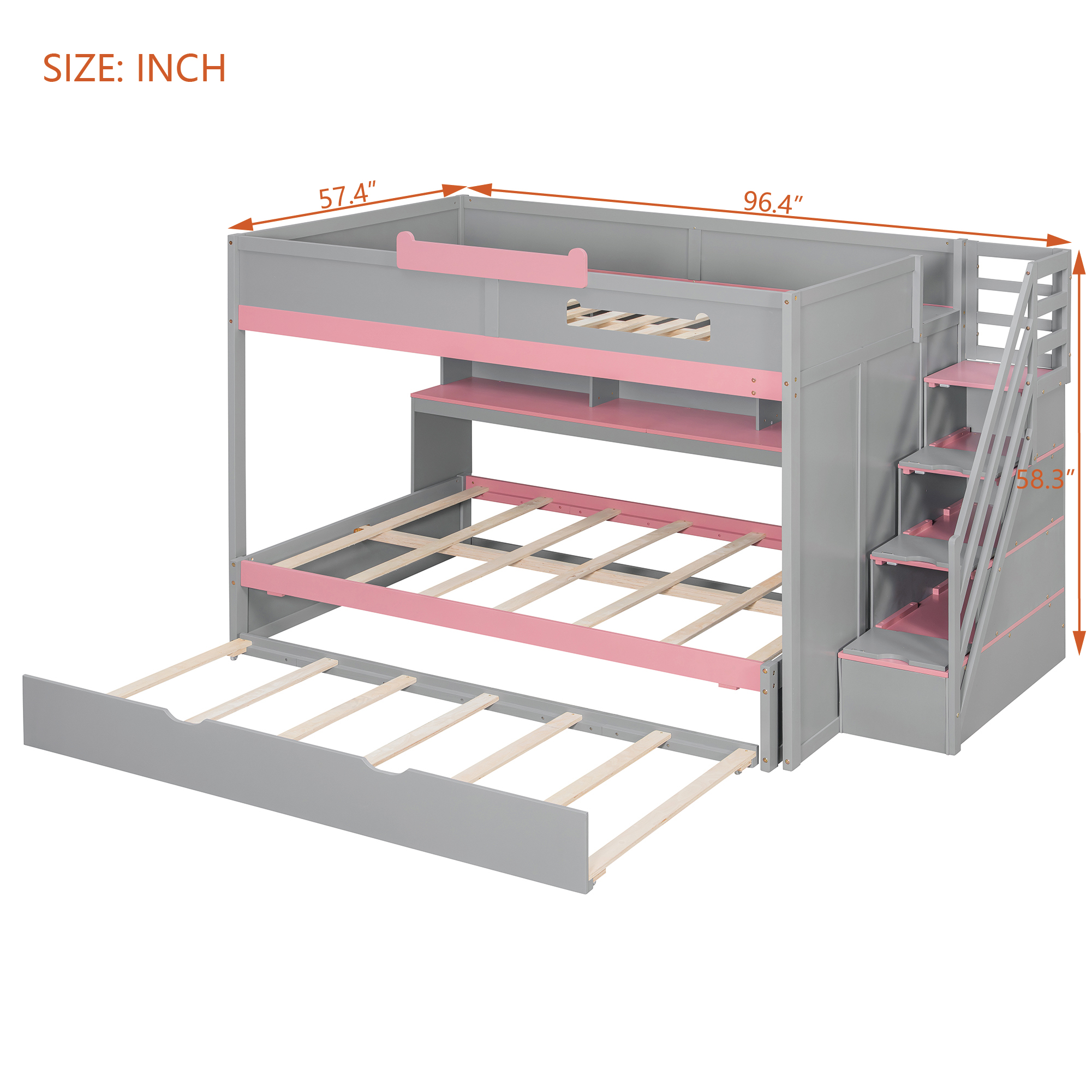 Full Over Full Bunk Bed With Twin Size Trundle, Staircase, Shelves and LED