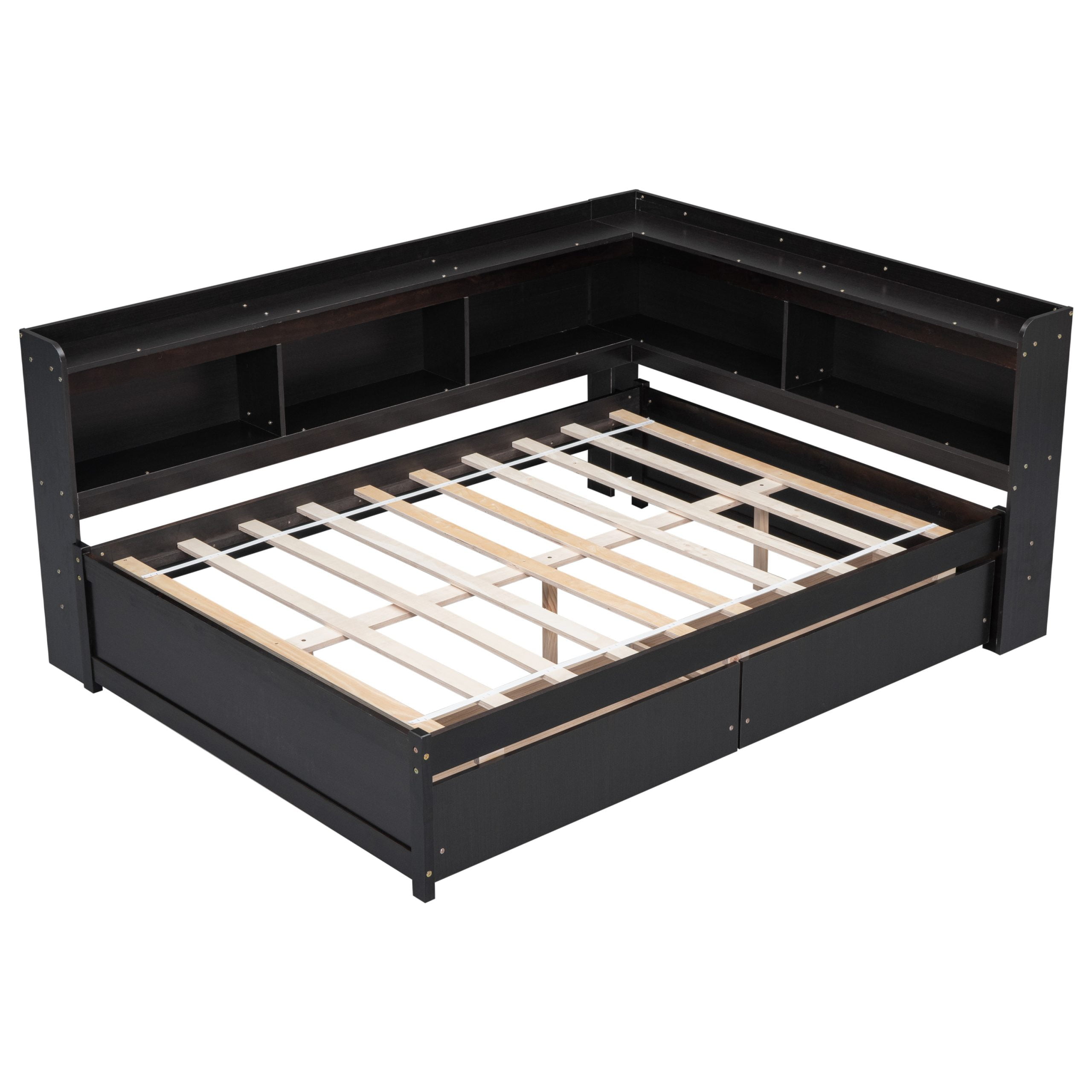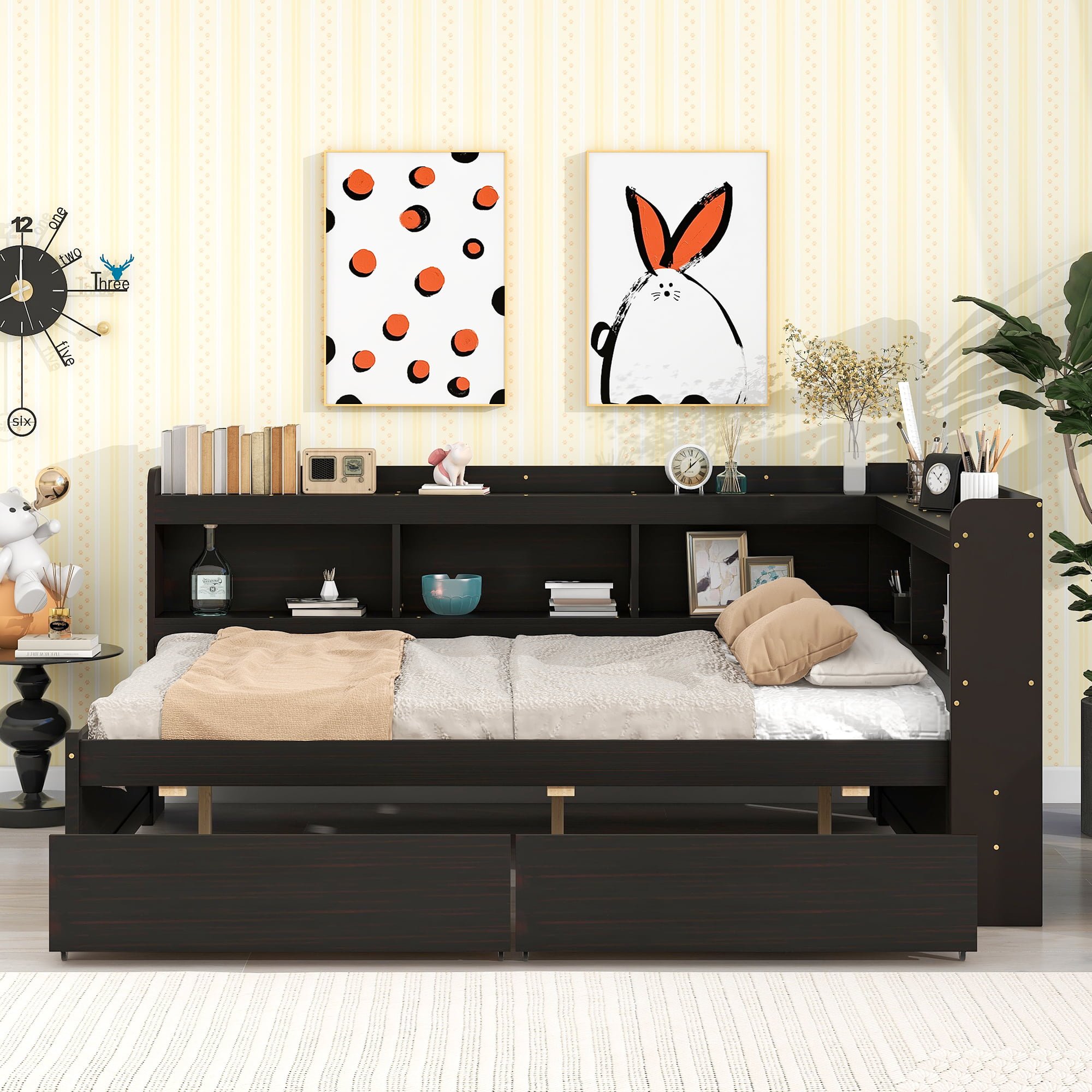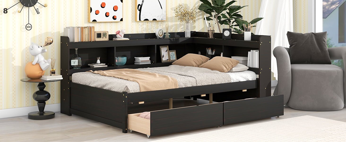 - [L-shaped Bookcases] The multifunctional function L-shaped bookcases attached to the two sides of the bed in full length contain distinct compartments that can be used to decorate and store books, toys, lamps and other accessories. This intelligible design saves the extra space and cost for the need of a bedside cabinets, and it’s the perfect solution for small living space-transforming a small chaotic space to a neat and fascinating bedroom.