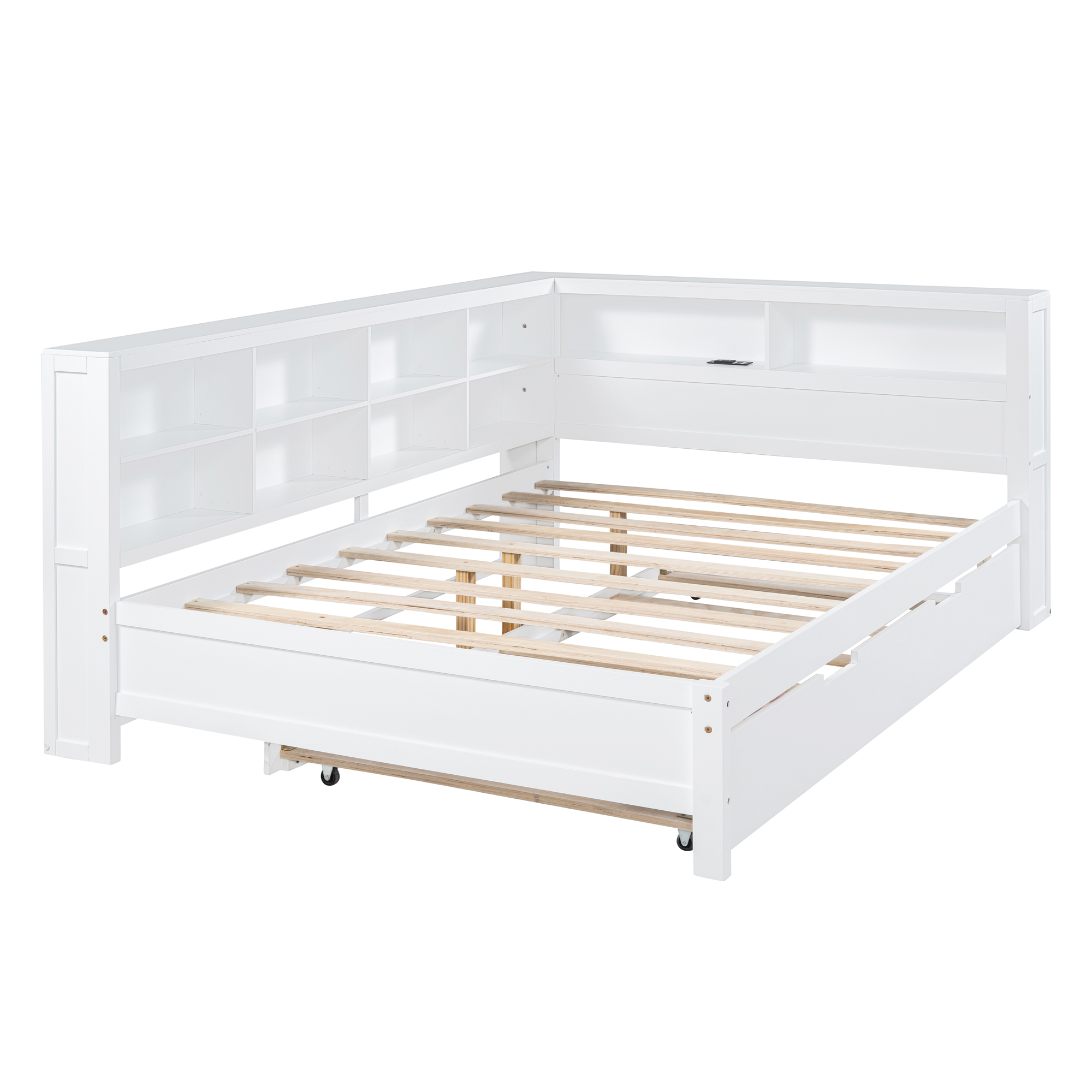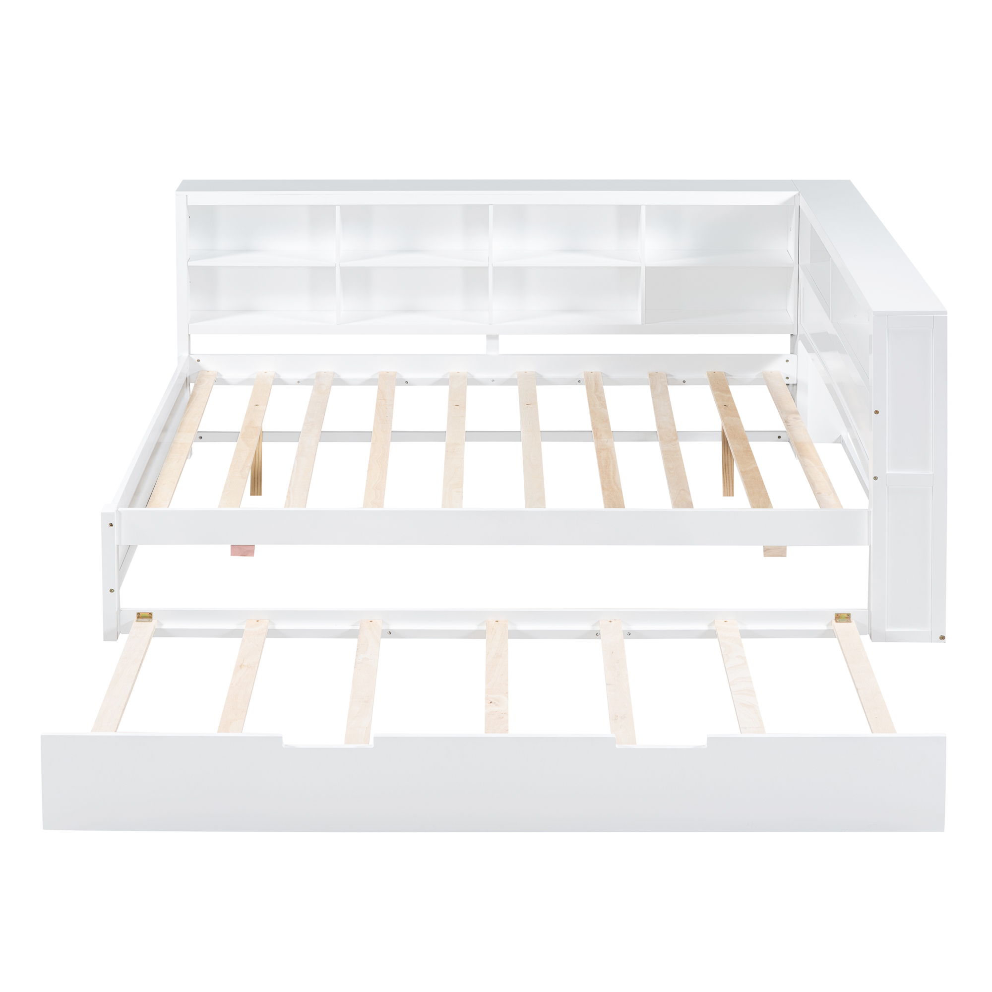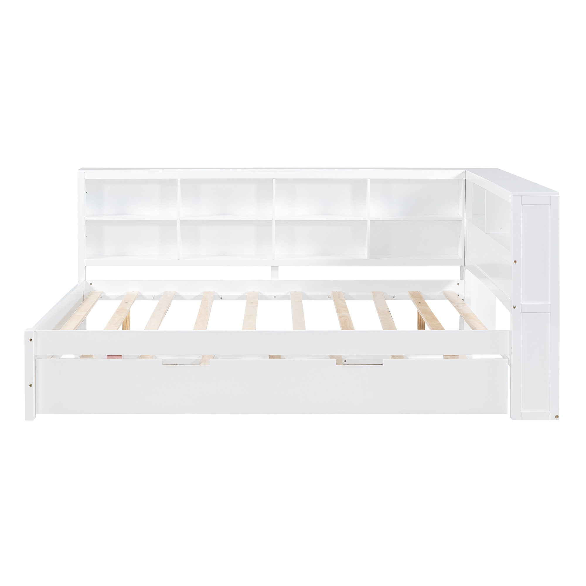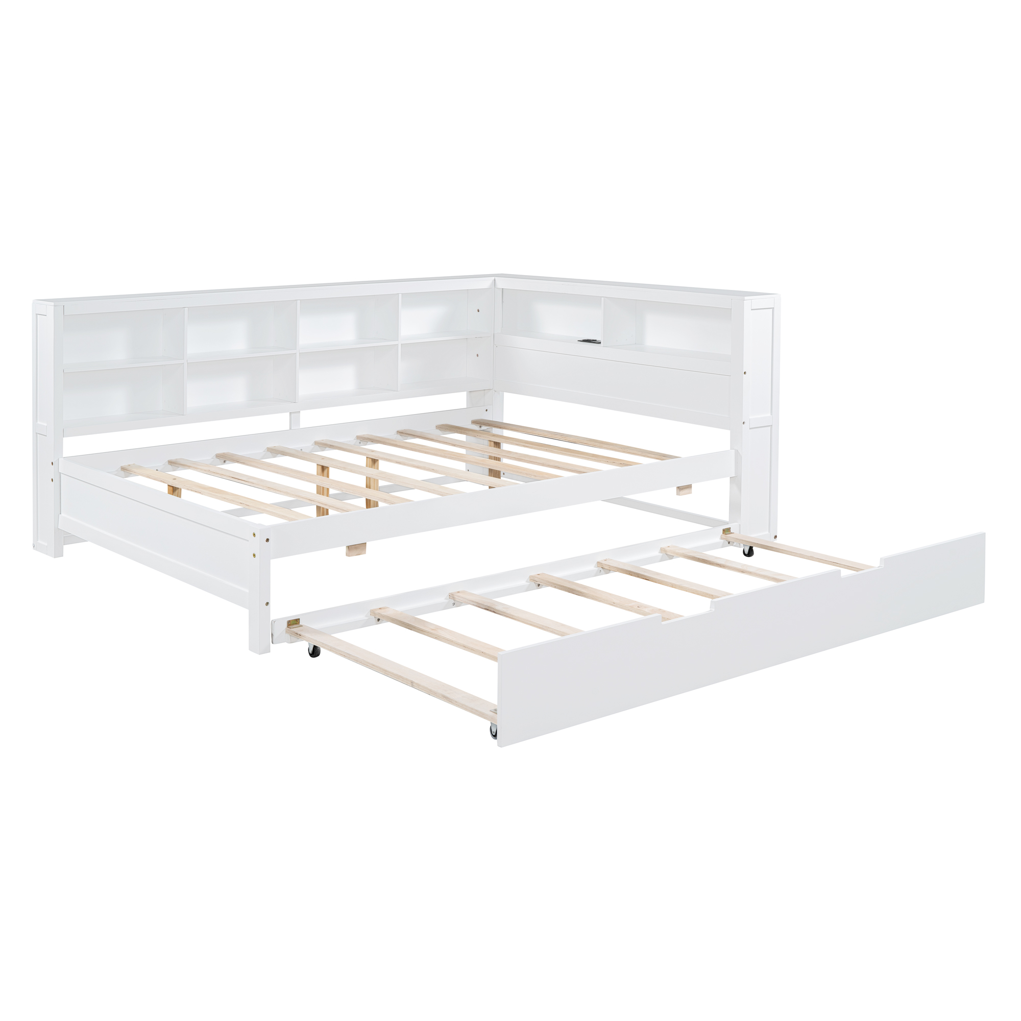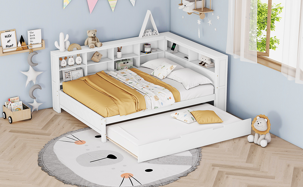 - Space-saving:The daybed includes one trundle, which can be rolled out to provide extra sleeping space. This design is ideal for families with children or users who need to host guests frequently. There is a double-layer storage shelf next to the bed, where users can store bedding, toys and other items.