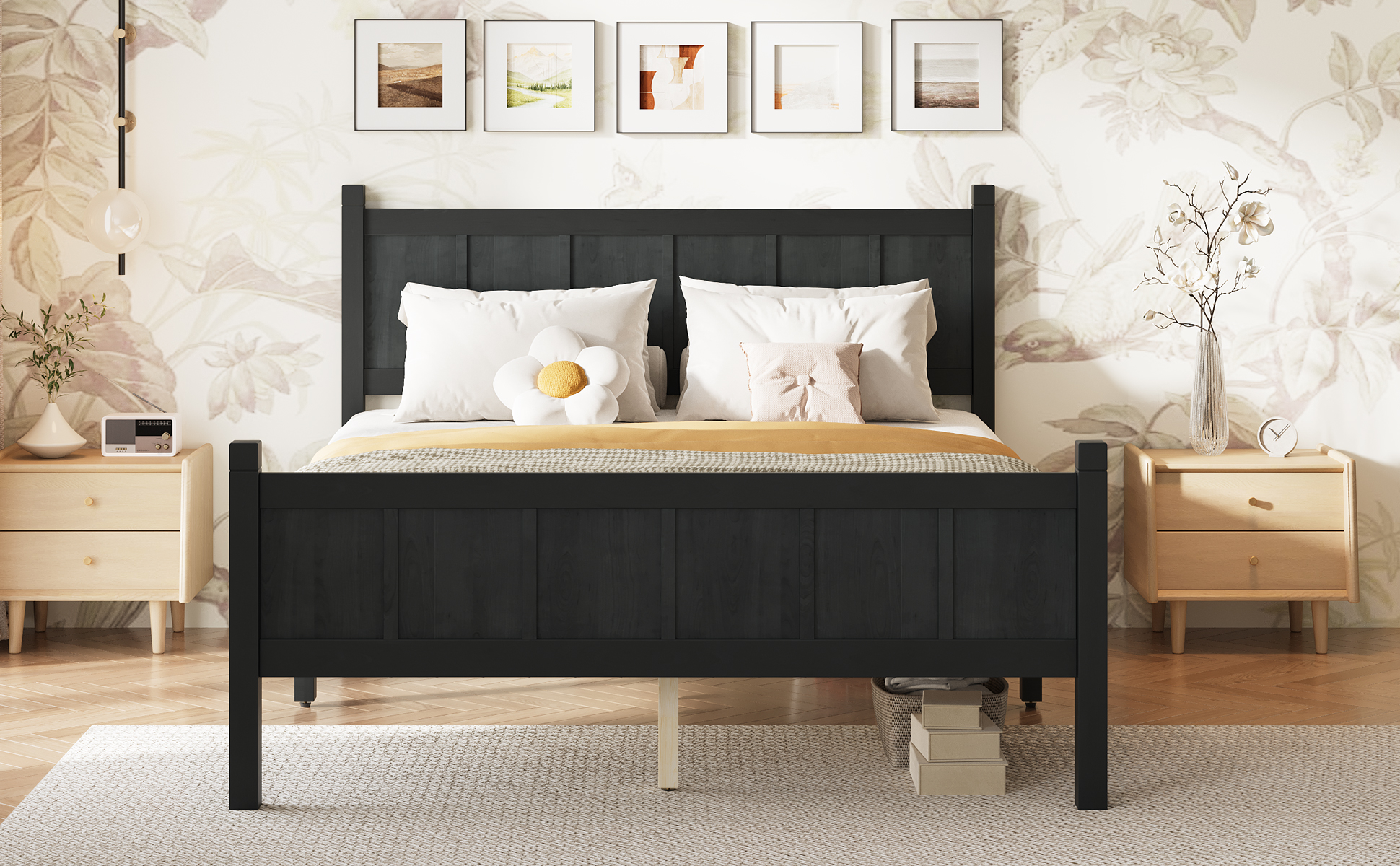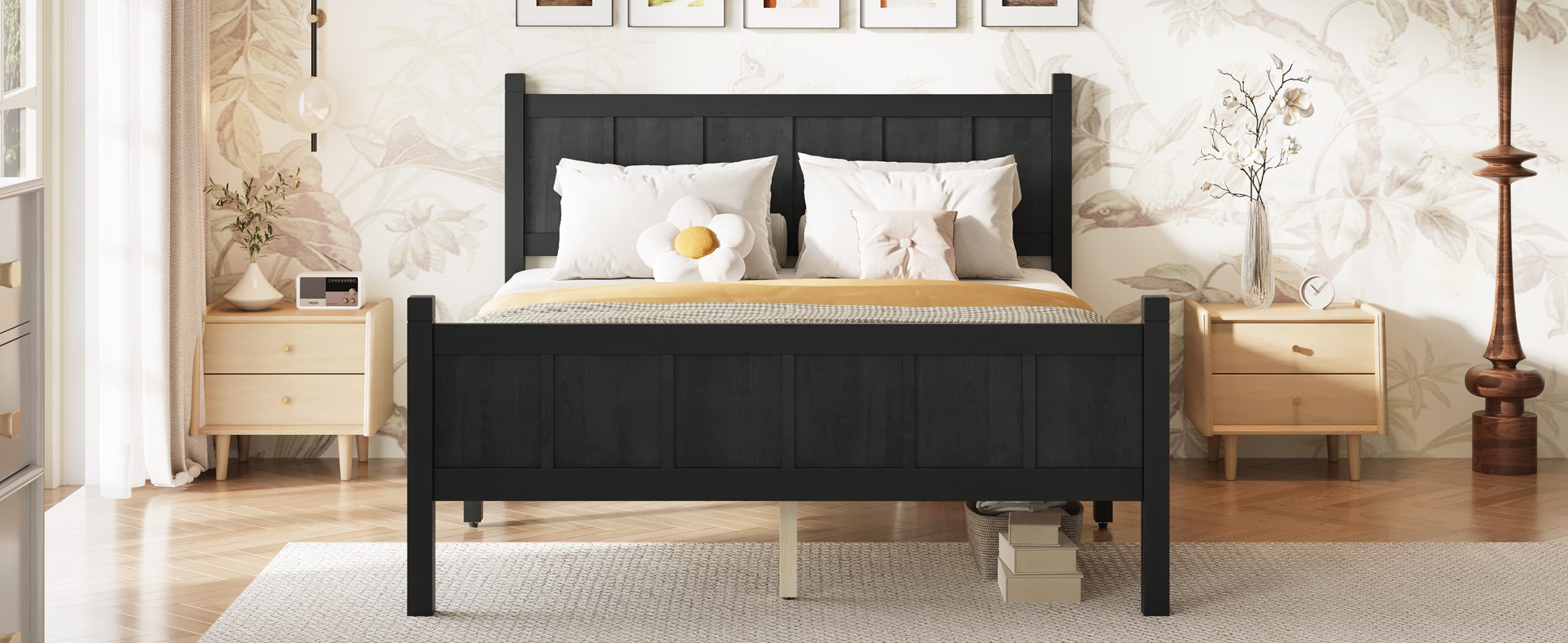 This bed features an elegant flat panel headboard and footboard with subtle vertical slats, creating a clean and refined look. The natural wood grain finish adds warmth and texture, enhancing its timeless appeal. Designed with a harmonious blend of Shaker and farmhouse styles, it complements a variety of bedroom decors. Its minimalist design emphasizes simplicity without sacrificing functionality, offering a sturdy and practical sleeping solution. Perfect for those seeking a versatile, stylish bed that balances classic charm with modern sensibilities, this piece brings both comfort and aesthetic sophistication to any bedroom setting.