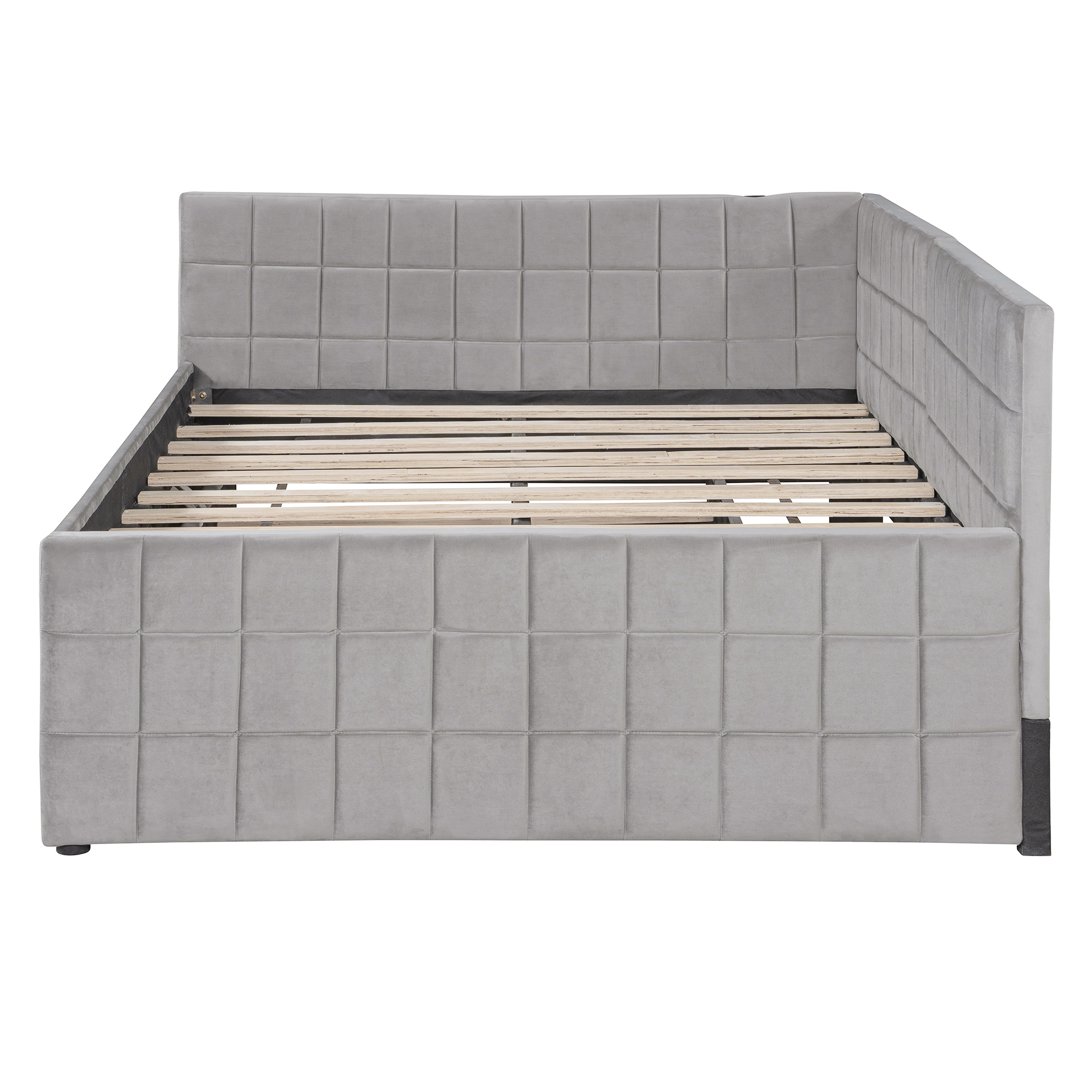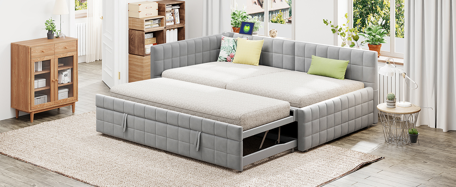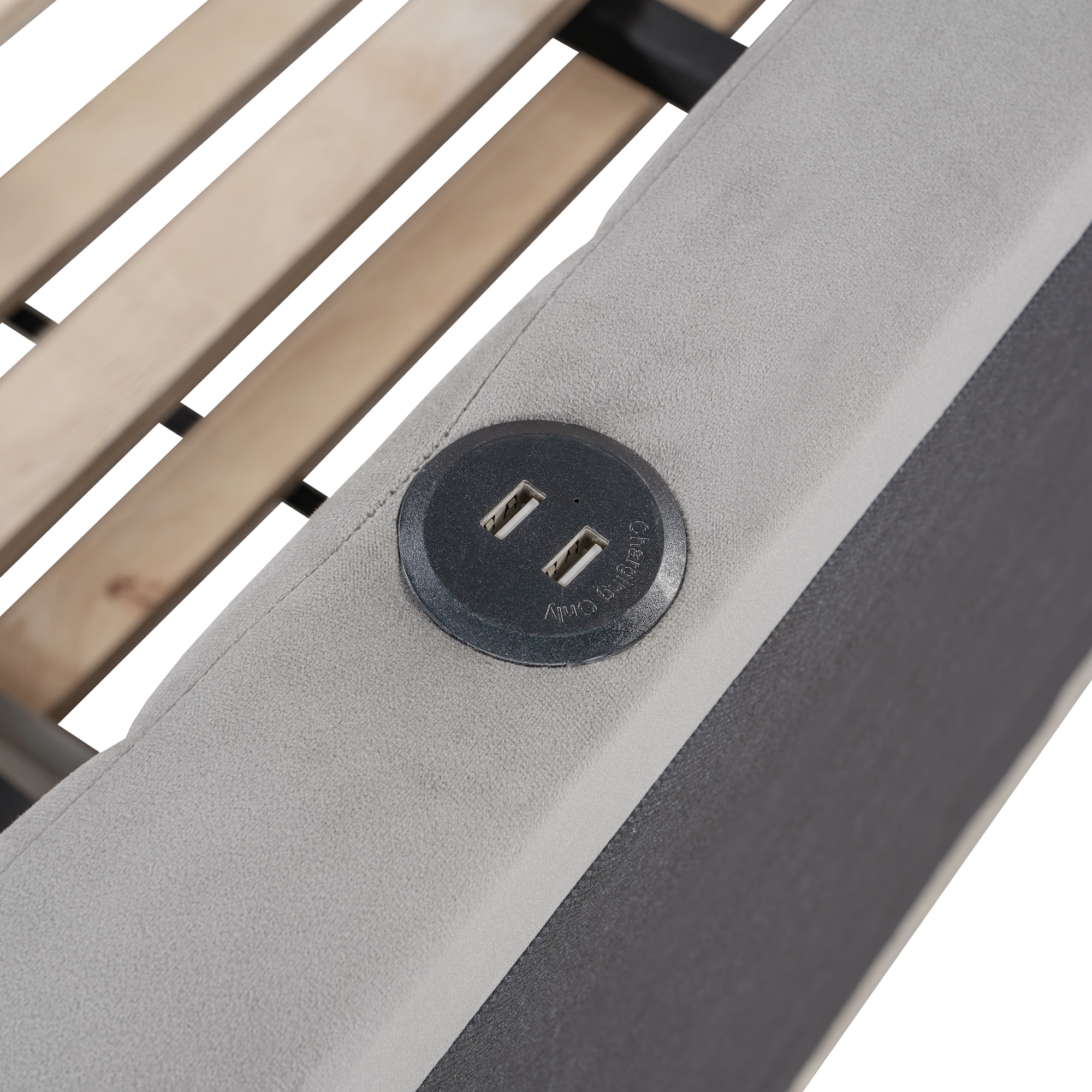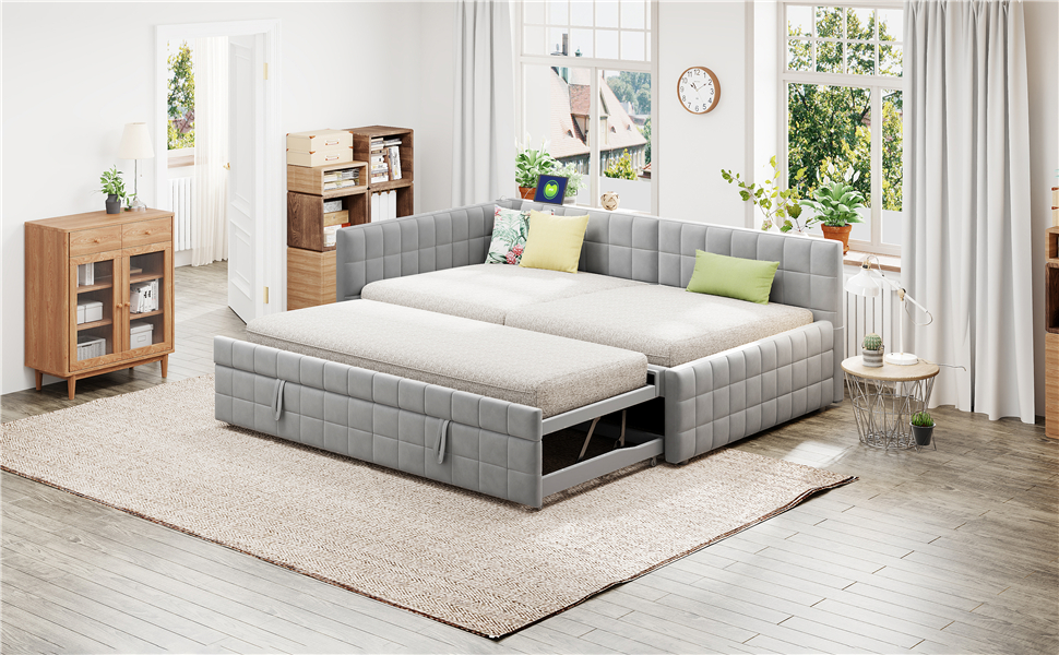 The full-size main bed offers spacious comfort, while the hidden twin-size trundle easily slides out and lifts to match the height of the main bed, creating an extended sleeping area perfect for guests or family. The cushioned L-shaped backrest not only adds an elegant architectural detail but also provides exceptional support for sitting, lounging, or reading. For ultimate convenience, the side armrest features built-in USB ports, allowing you to charge two devices simultaneously, keeping your phone, tablet, or other gadgets within easy reach. With its smart design, plush upholstery, and strong, durable construction, this bed is the perfect centerpiece for a modern bedroom that demands both style and functionality.