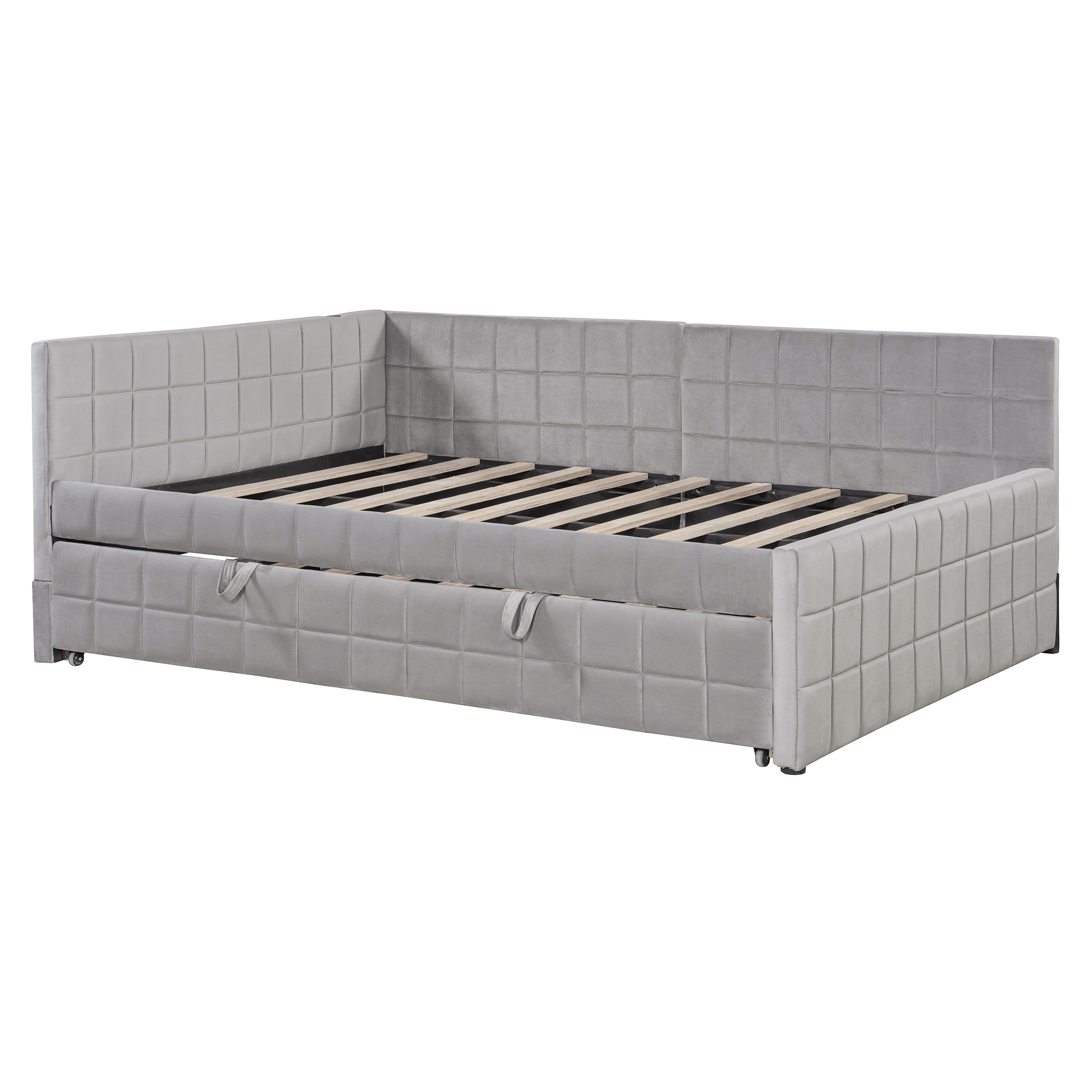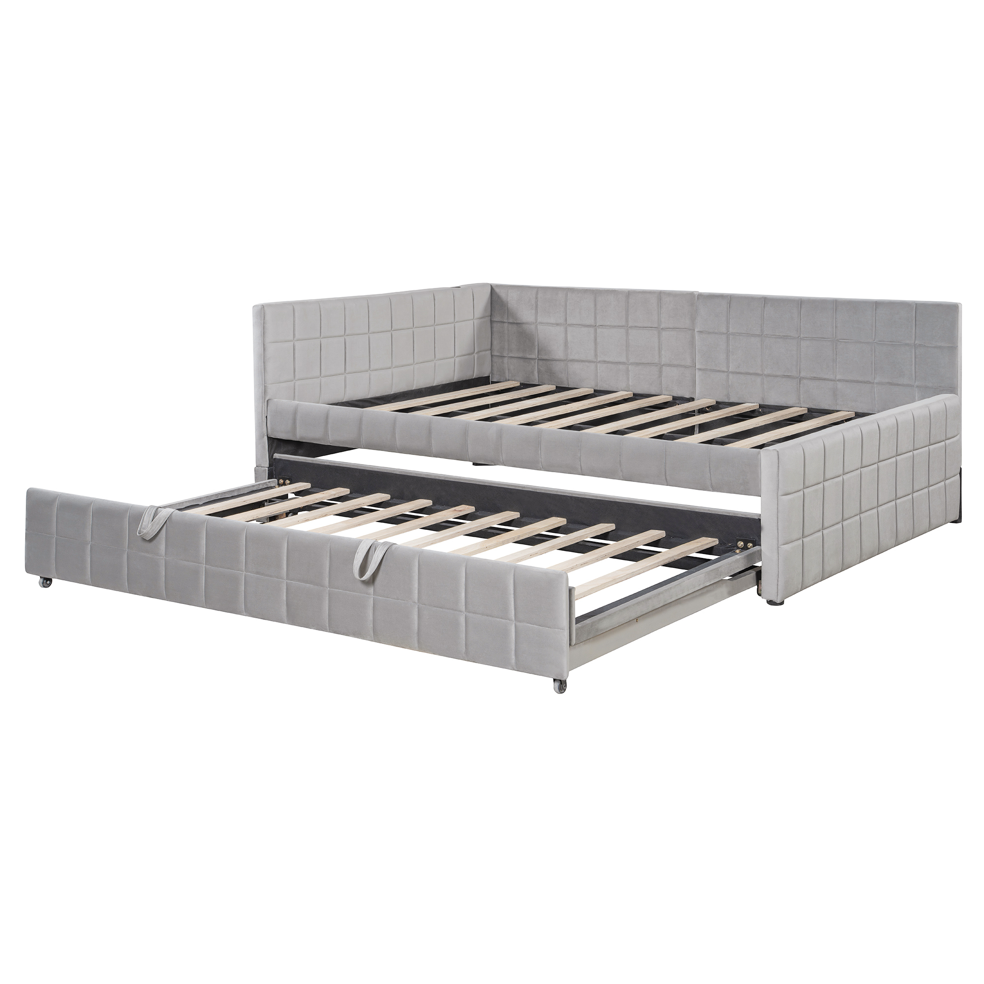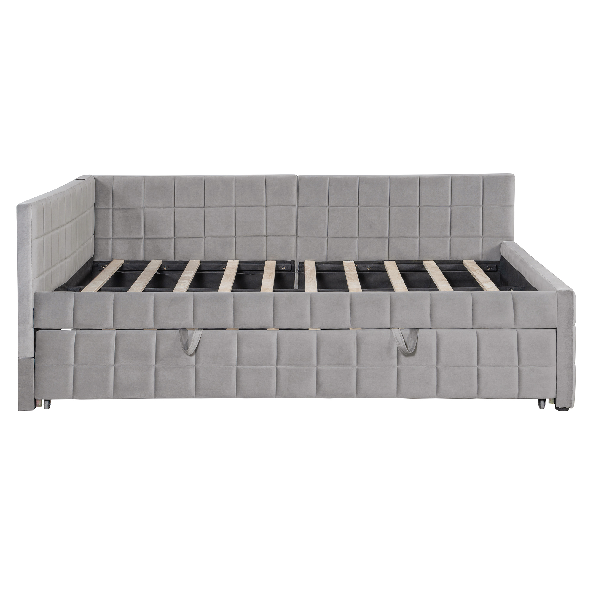 The full-size main bed offers spacious comfort, while the hidden twin-size trundle easily slides out and lifts to match the height of the main bed, creating an extended sleeping area perfect for guests or family. The cushioned L-shaped backrest not only adds an elegant architectural detail but also provides exceptional support for sitting, lounging, or reading. For ultimate convenience, the side armrest features built-in USB ports, allowing you to charge two devices simultaneously, keeping your phone, tablet, or other gadgets within easy reach. With its smart design, plush upholstery, and strong, durable construction, this bed is the perfect centerpiece for a modern bedroom that demands both style and functionality.