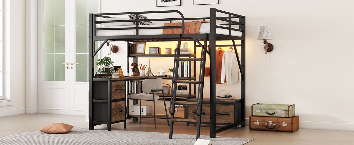 - Full Loft Bed with Desk and Charge Station: This loft come with a desk, you can turn the under bed space into a workstation or reading corner. Built-in charging station on the desk includes 2-Outlets & 2 USB Ports ,which are convenient for charging your mobile phone, tablet, computer or gaming device. There are 2 fabric drawers under the desk for storage.