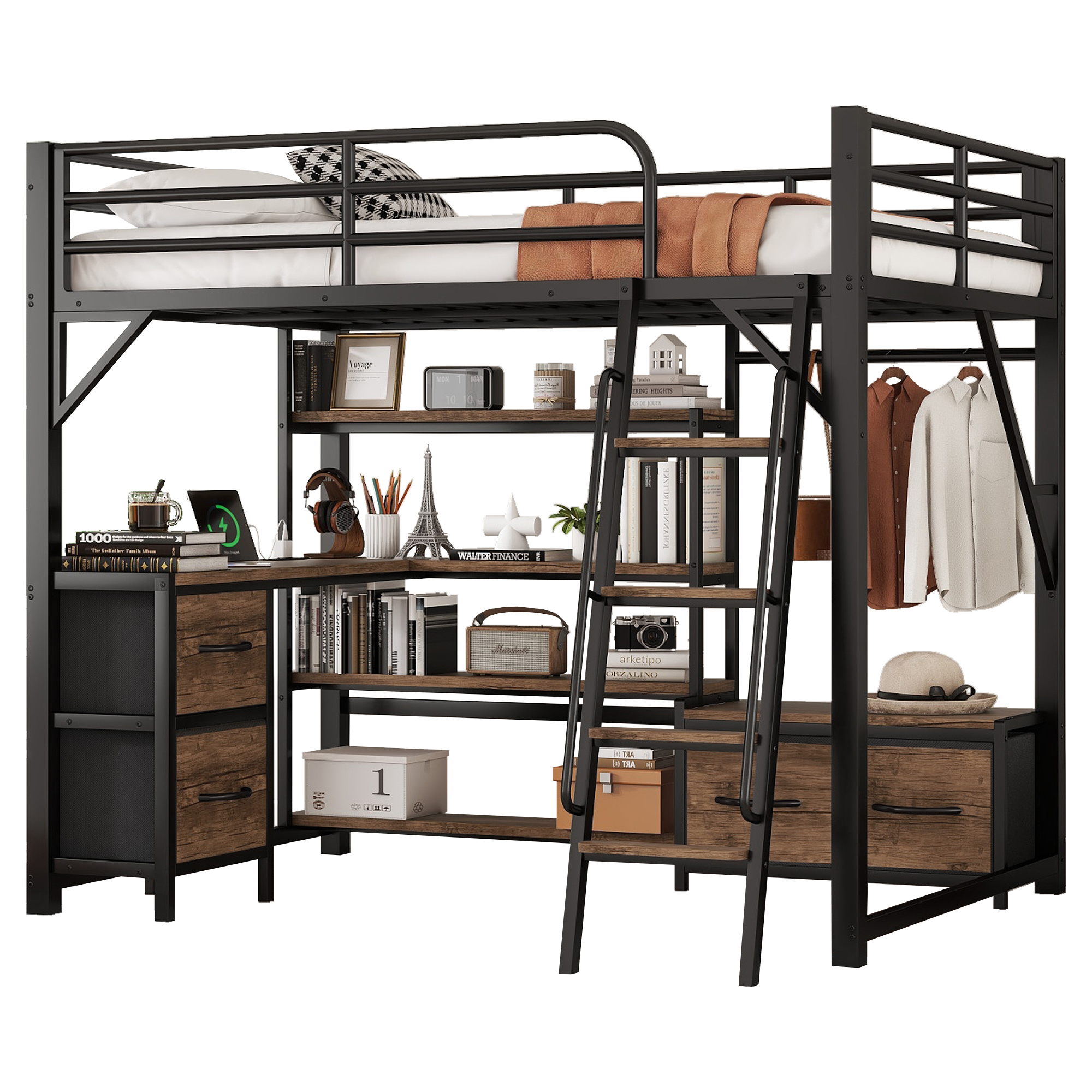 - Spacious Storage and Wardrobe: The full loft bed come with 4 storage shelves for large storage, you can use it as bookshelf or display. Additionally, the wardrobe with a hanging rod next to the shelves allows for organized clothing and keeps your room tidy. There are 2 fabric drawers under for large storage.