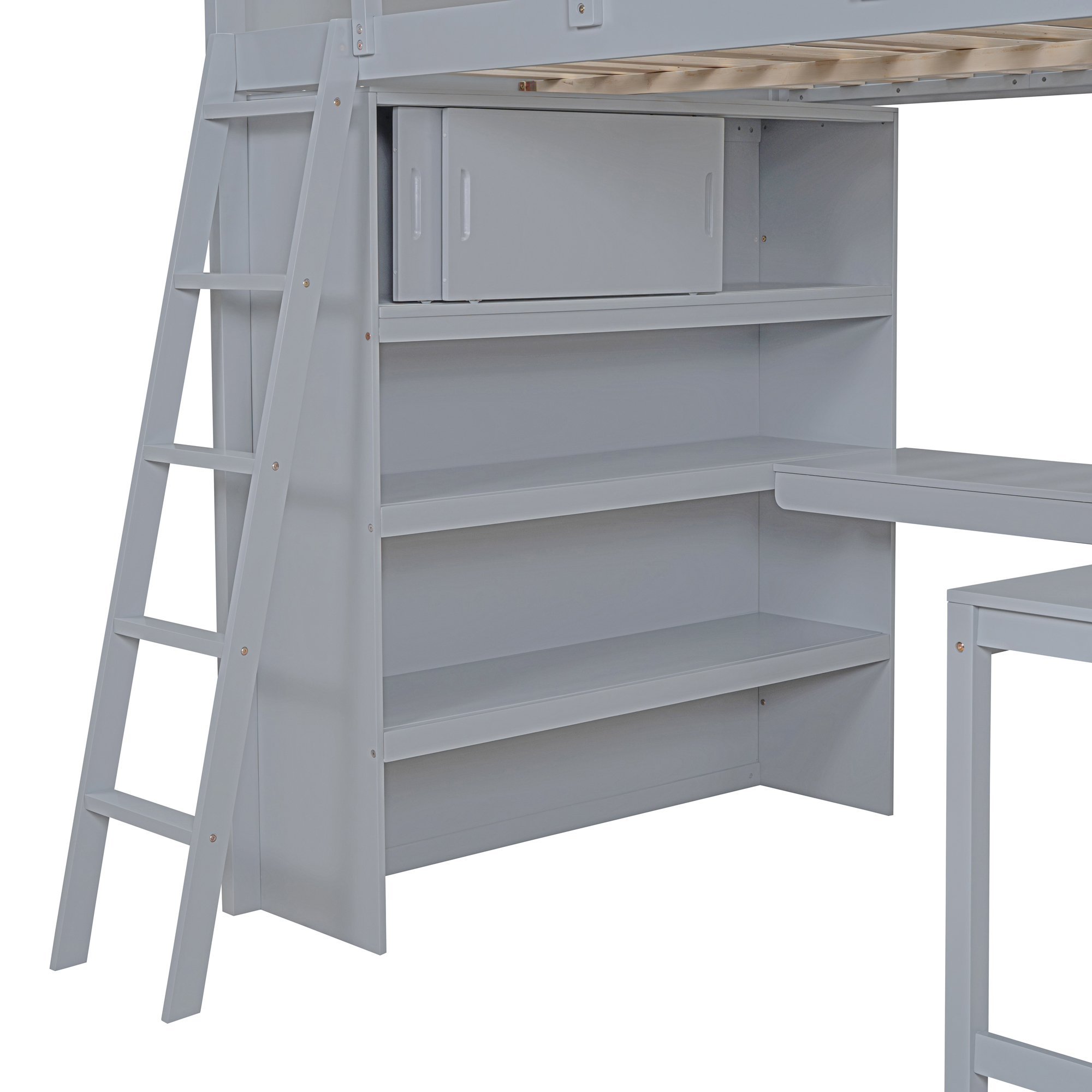 Crafted with high-grade manufactured pinewood, enjoy the Loft bed in shades gray and white to match the color scheme of any room. This loft bed with a desk and storage shelves, made of pine wood. The space under the loft bed is ideal for small bedrooms, saving space for additional placement of study or office areas, and you can decorate it to your liking. The surface of the desk is made of high quality wood panel, which can bear the weight of more books and decorations.