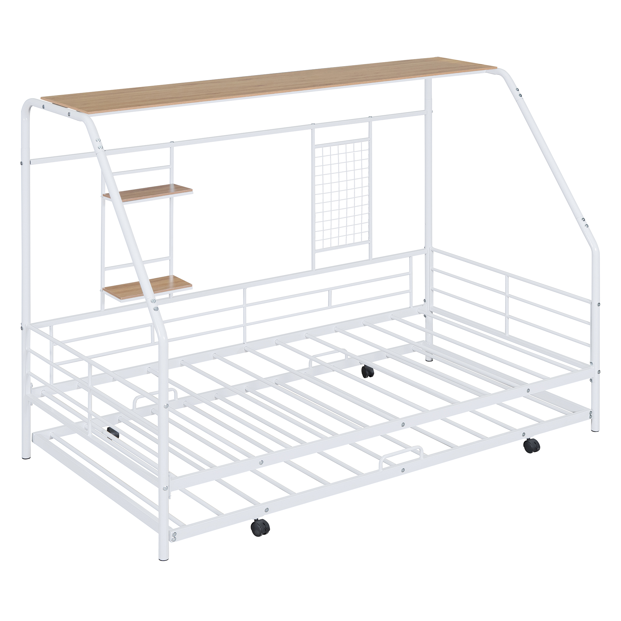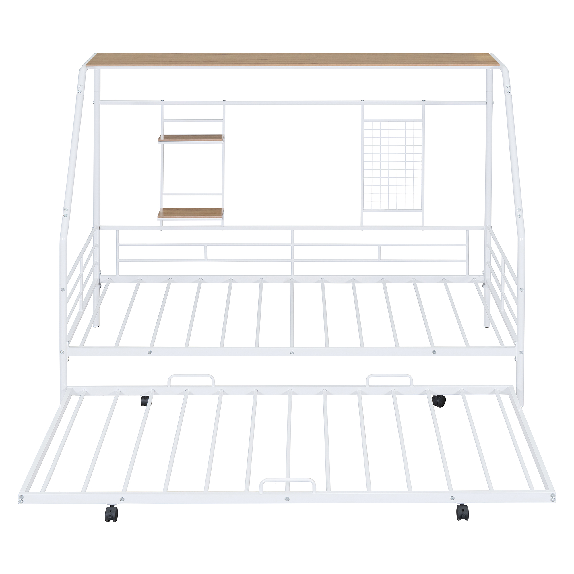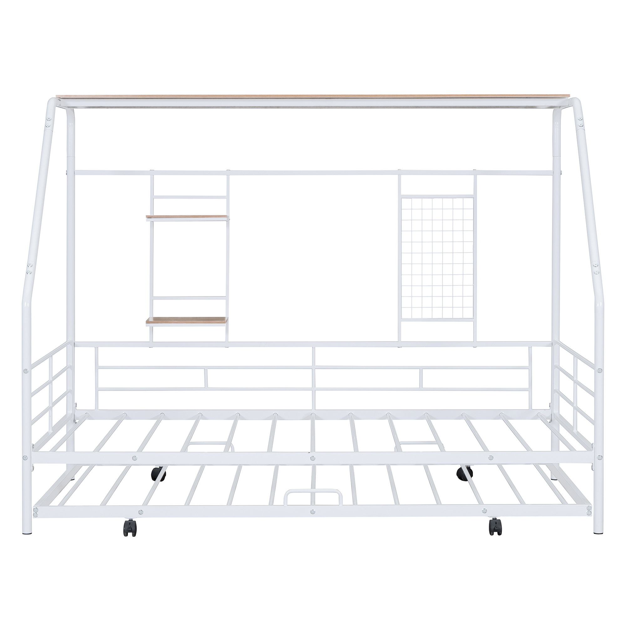 - [Built-in Shelf and Grid] This metal bed making full use of space, coming with three shelves. The most special thing is that it contains a metal grid, which can hang some decorations, photos, etc.
