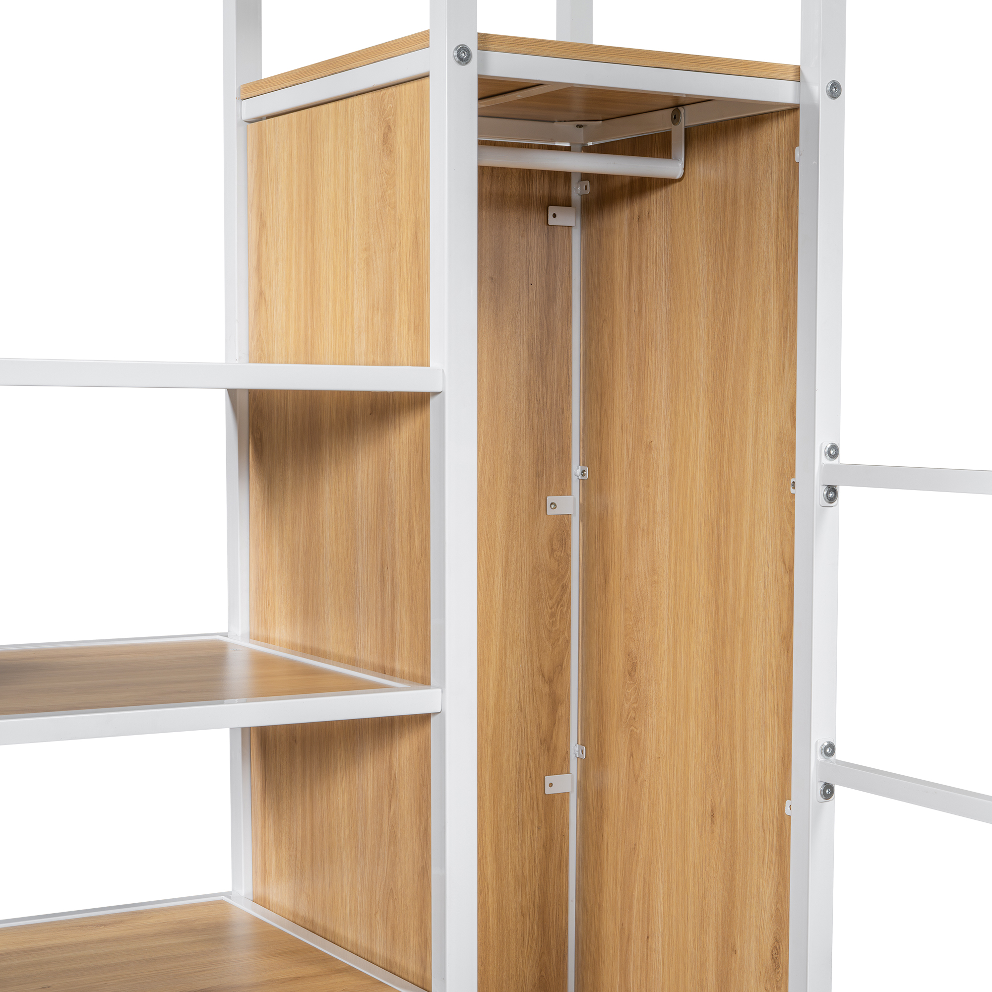Full Size Metal Loft Bed with Built-in Work Station, Wardrobe, Storage Staircase and LED