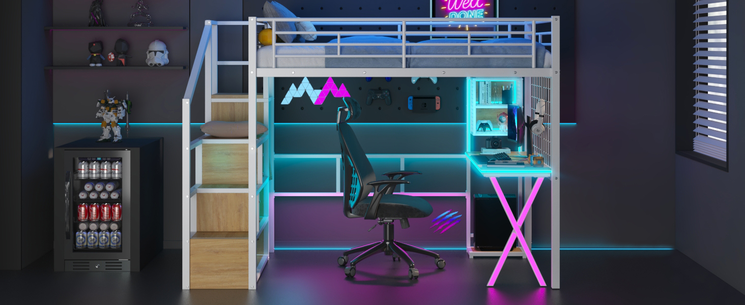 A gaming bed, desk and wardrobe built into one. This metal loft gaming bed collection provides the perfect space saving solution for any kids bedroom. The built-in LED desk with 2 storage shelves and 1 computer host shelf and 2 grid boards, will be your clever workstation. Strong metal+MDF frame that includes an integrated ladder, full-length guardrails and secured slats to ensure security and stability. No additional box spring or foundation required.