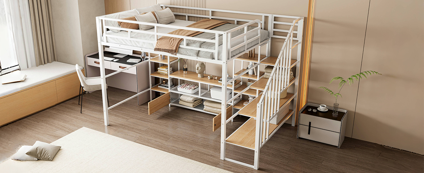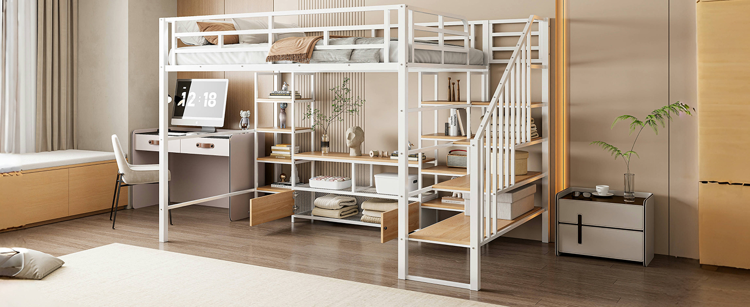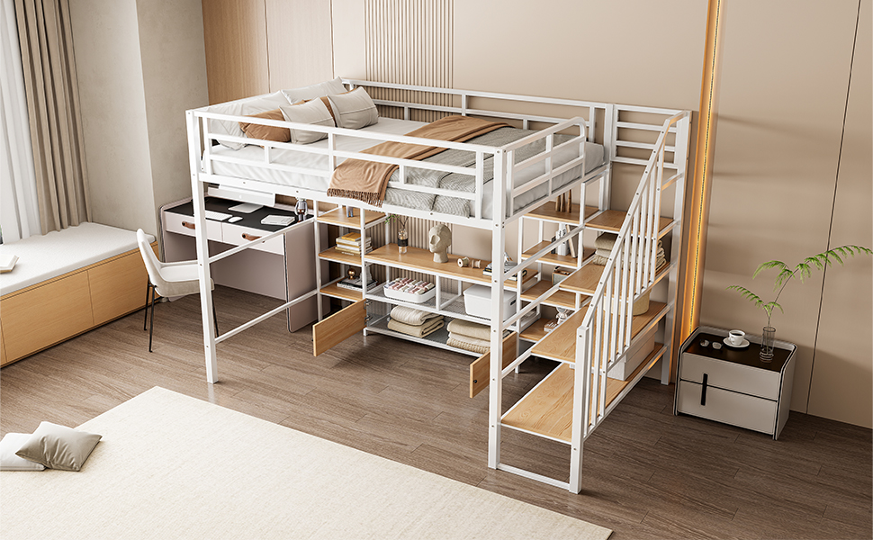 - [Loft Bed with Low Table] The full size loft bed can be configured as two separate spaces. While satisfying rest, the space under the loft bed provides more personal space for work or leisure. Built-in low storage table,creates a productive, simple work,study or gaming area for your child. Perfect for space-saving needs.
