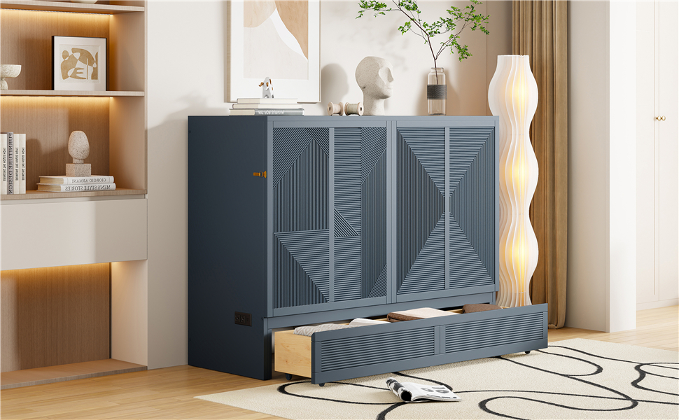 Transform your living space with this Full-Size Murphy Bed with Storage and Wheels, a perfect blend of functionality and modern design. Crafted to simplify your lifestyle, this convertible bed is ideal for compact homes, guest rooms, or multipurpose spaces. When not in use as a bed, it folds into a sleek cabinet-style unit with a decorative top and functional drawer, seamlessly fitting into any interior design. With durable construction, practical storage solutions, and thoughtful details like built-in USB charging ports, this bed is as stylish as it is convenient. Delivered in two separate packages for easier handling, this Murphy bed offers a smart solution to maximize your space without compromising on comfort.