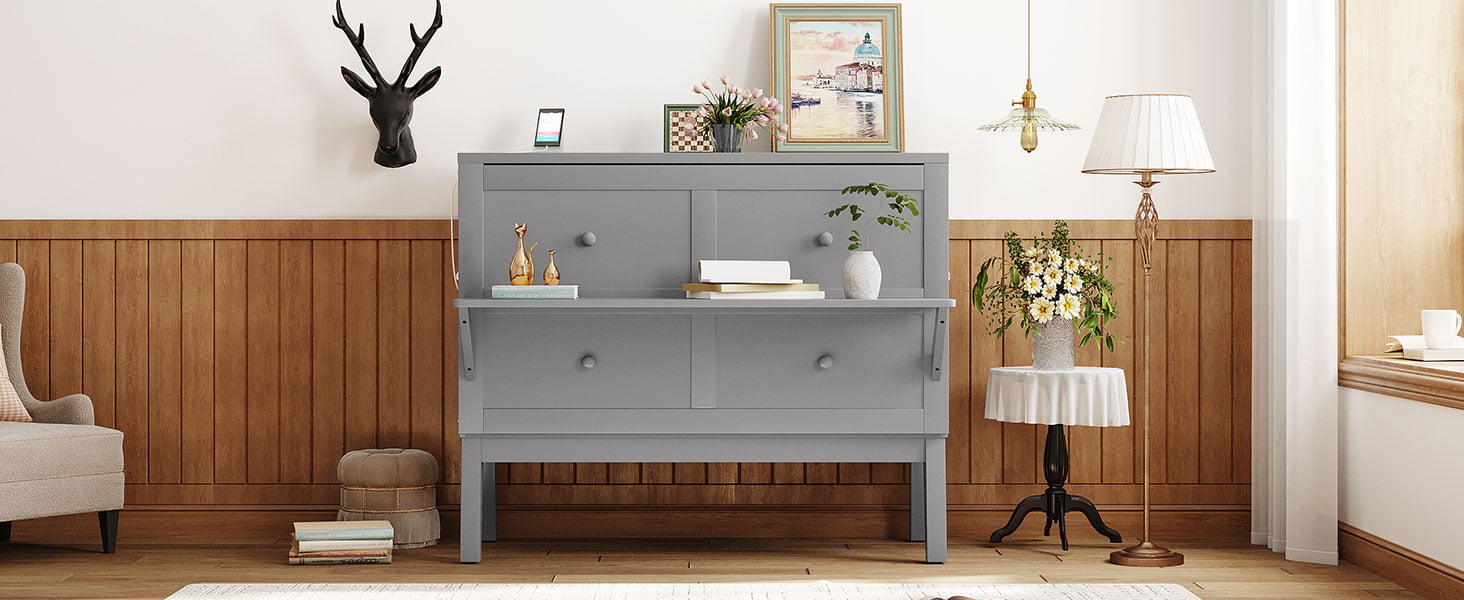 (Price Includes Shipping, No Tax Fee.)There are 2 finishes for the bed. It can be used as a cabinet as well as a bed. It’s perfect for you if you have a sleepover often or the room needs more space. This morphy bed is equipped with a built-in dual power/USB module, which allows you to charge your phones or lamps on the bedside. You won’t worry about changing position if you play games or watch movies on bed with little battery. Made of high-quality solid pine wood and MDF with reliable construction, this Murphy bed frame can last for long time use and ensure strong stability and durability. The slats are available with each bed compatible with better weight capacity.