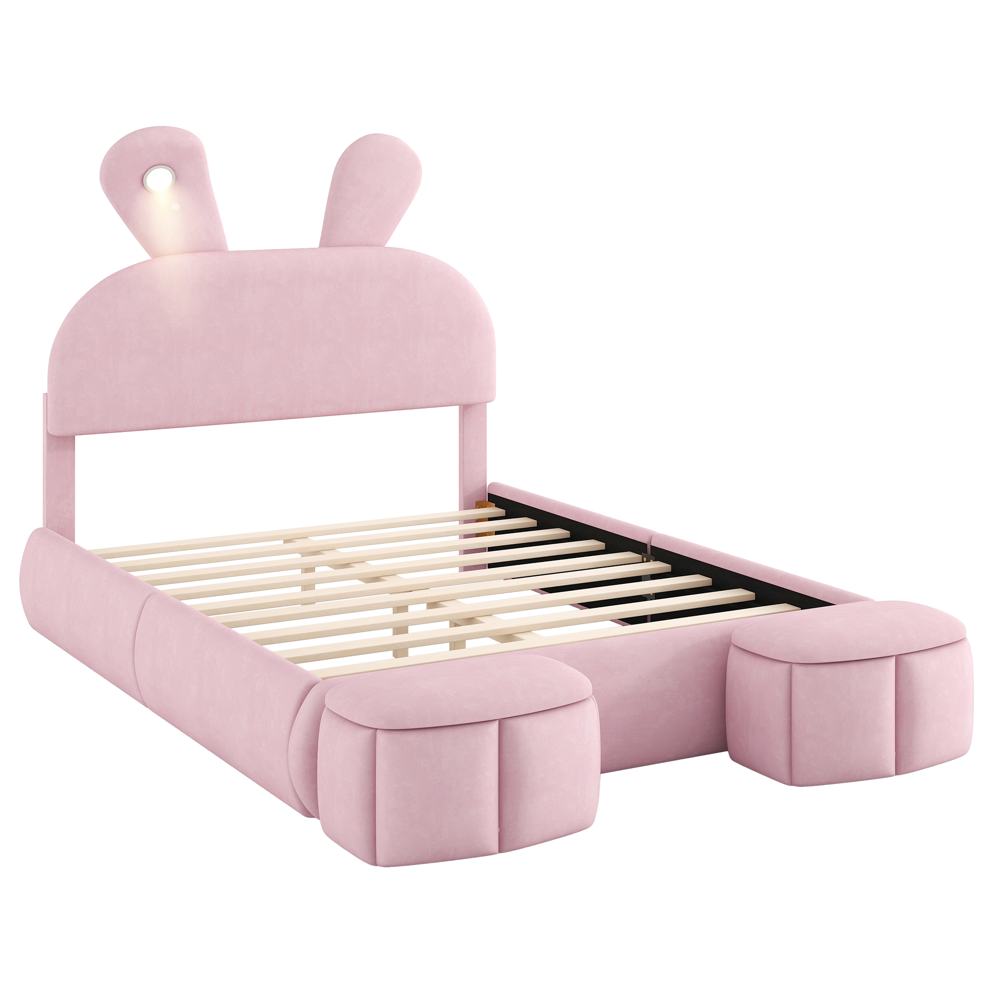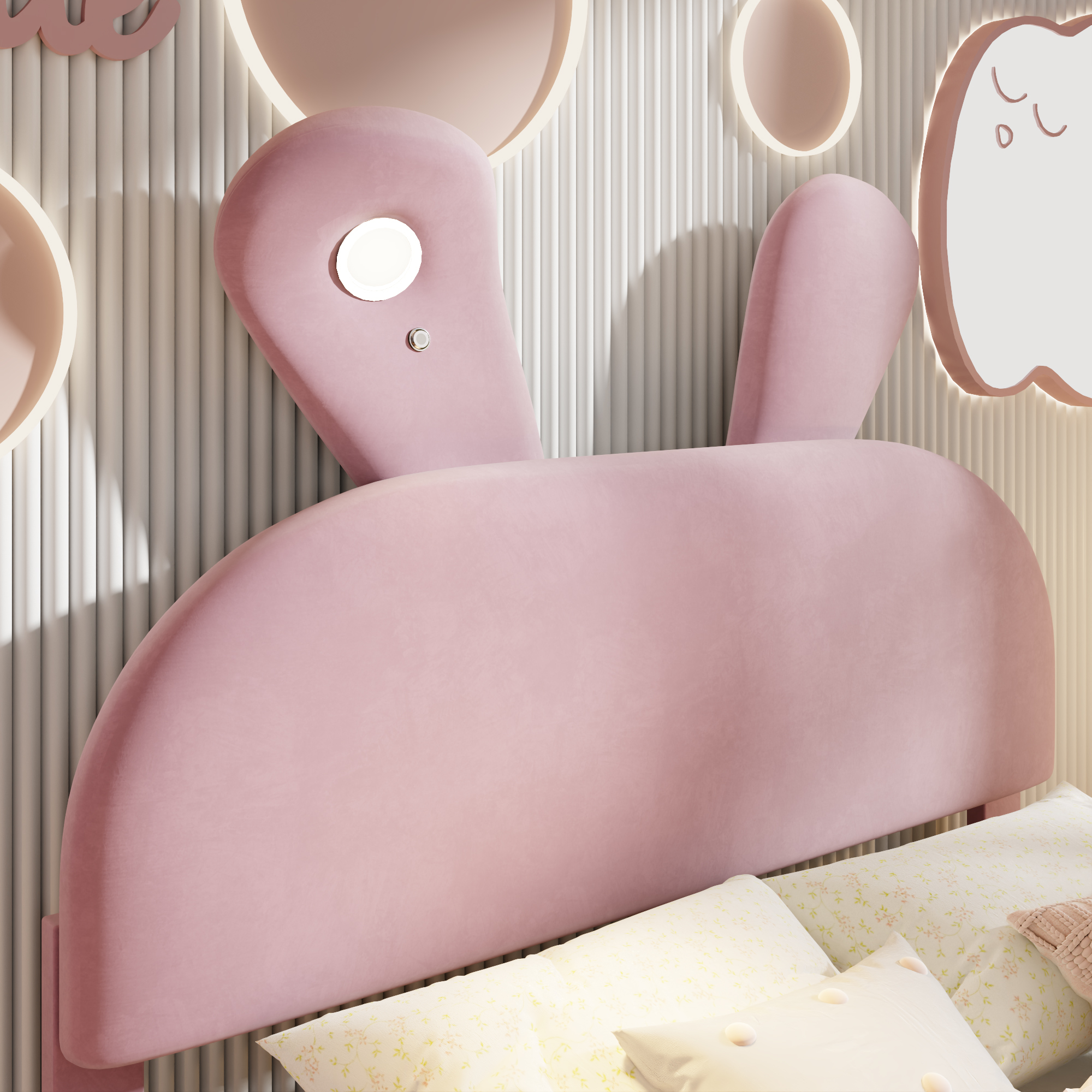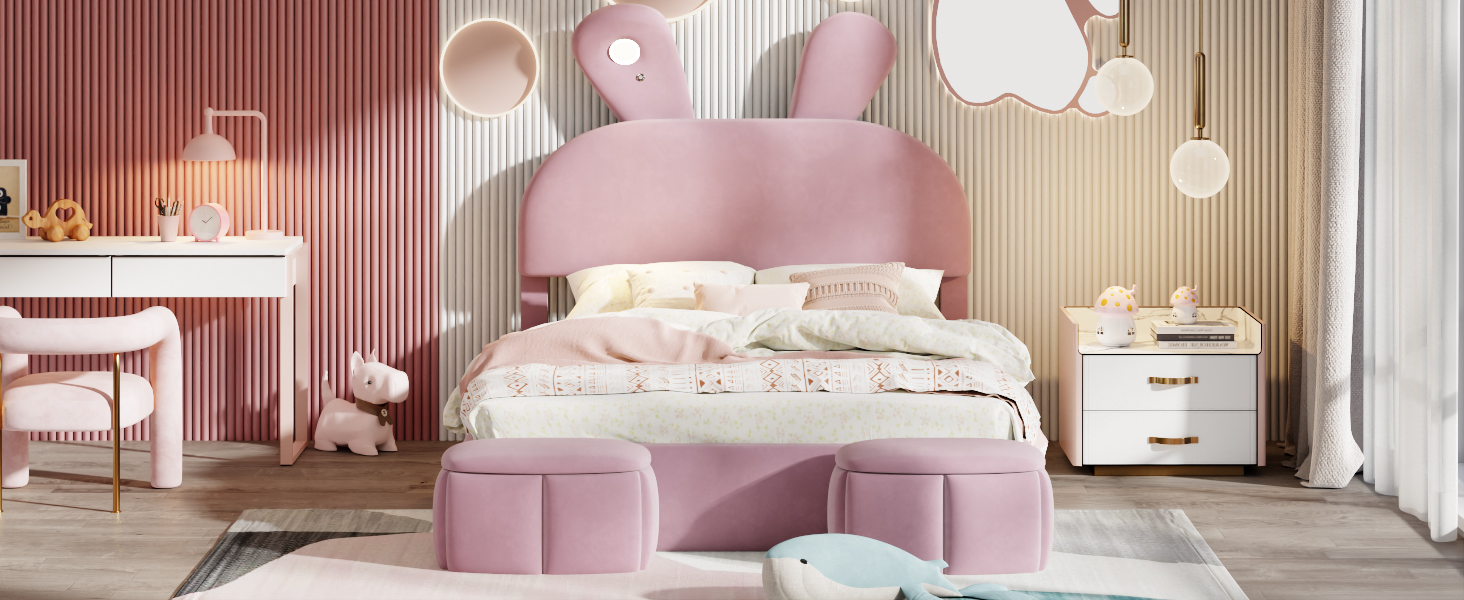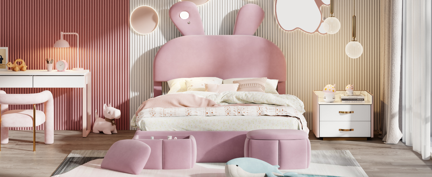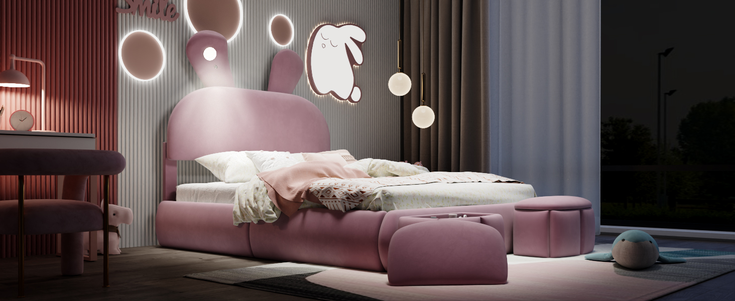 - [Cute Bed] Perfect for your little one’s bedroom, this platform bed shows off soft upholstery with a playful cartoon ears look both you and your little one will love.