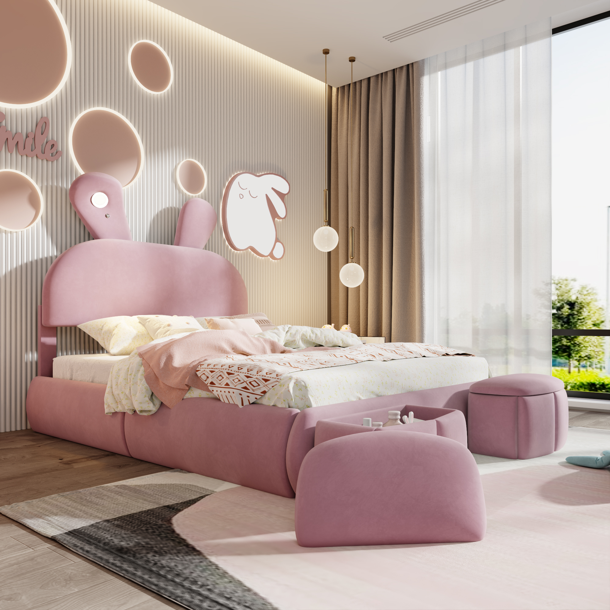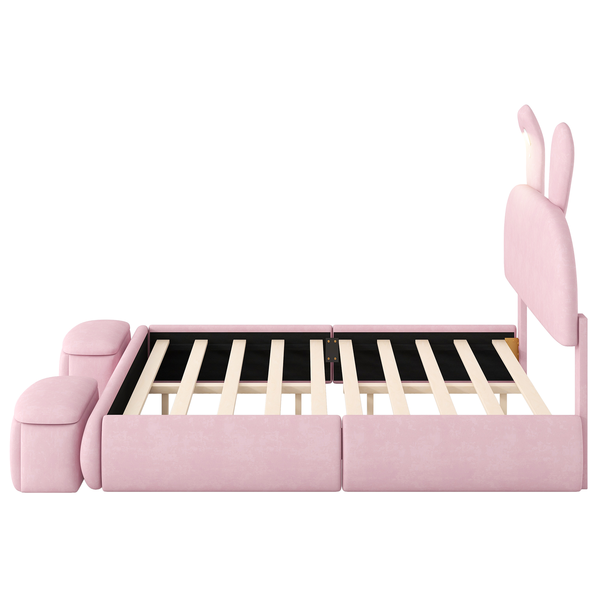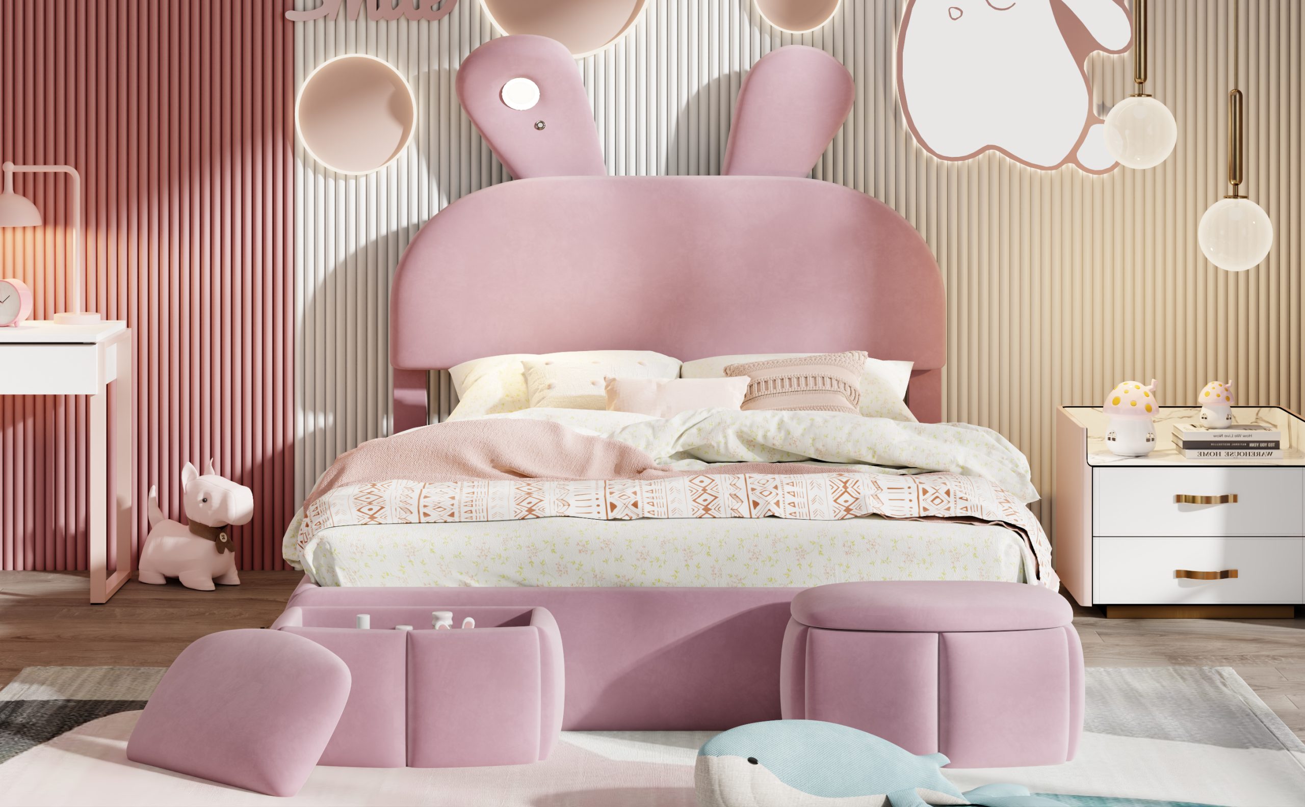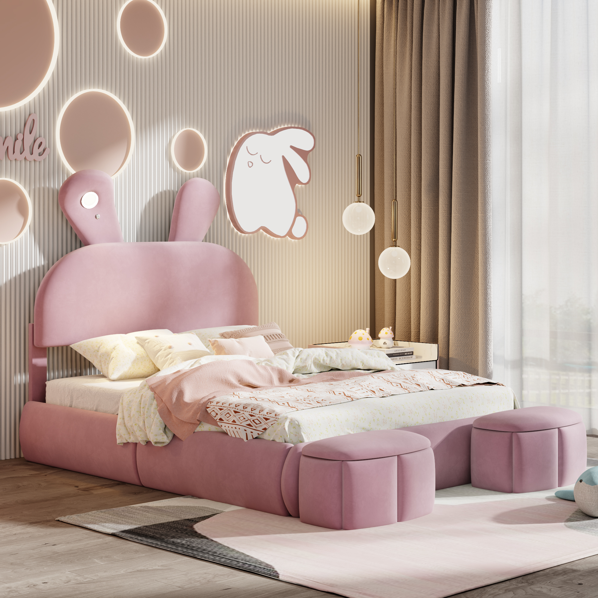 - [Cute Bed] Perfect for your little one’s bedroom, this platform bed shows off soft upholstery with a playful cartoon ears look both you and your little one will love.