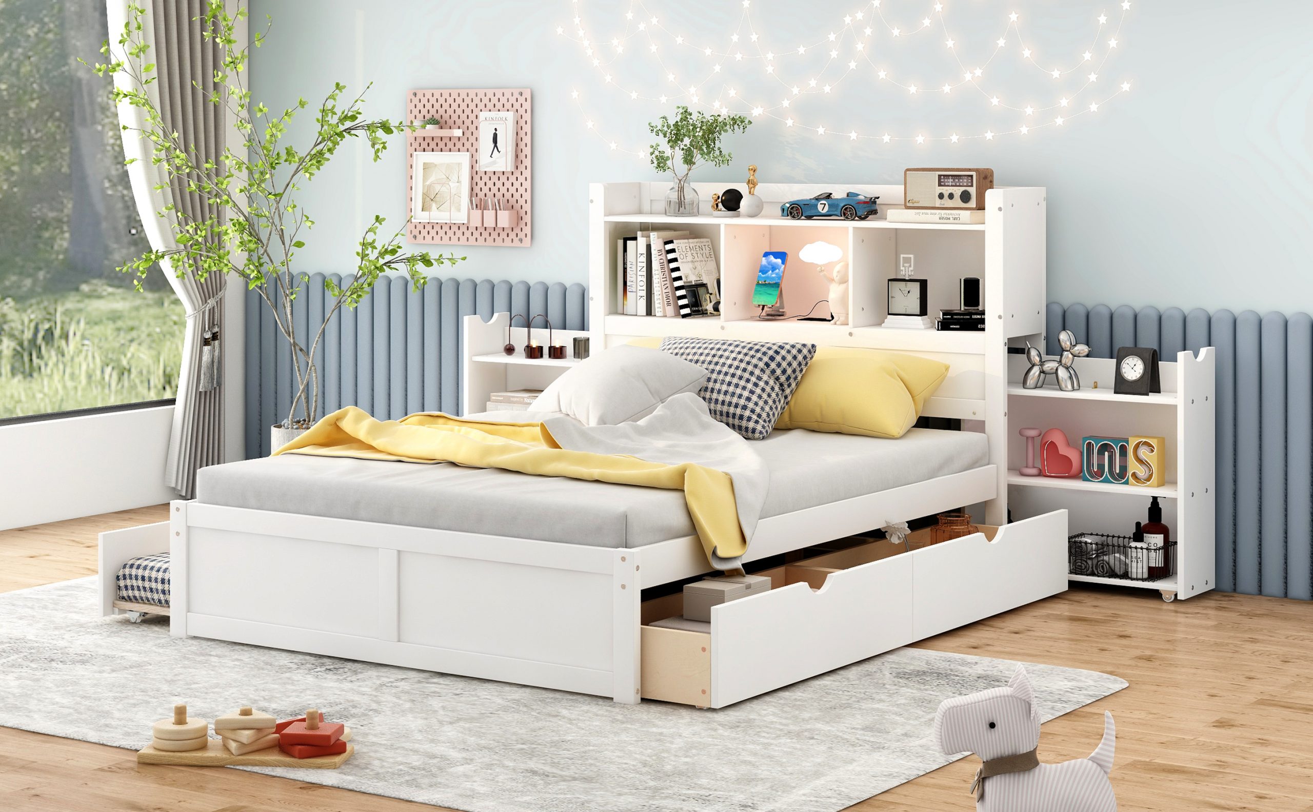 Full Size Storage Platform Bed With Pull Out Shelves, Twin Size Trundle And 2 Drawers