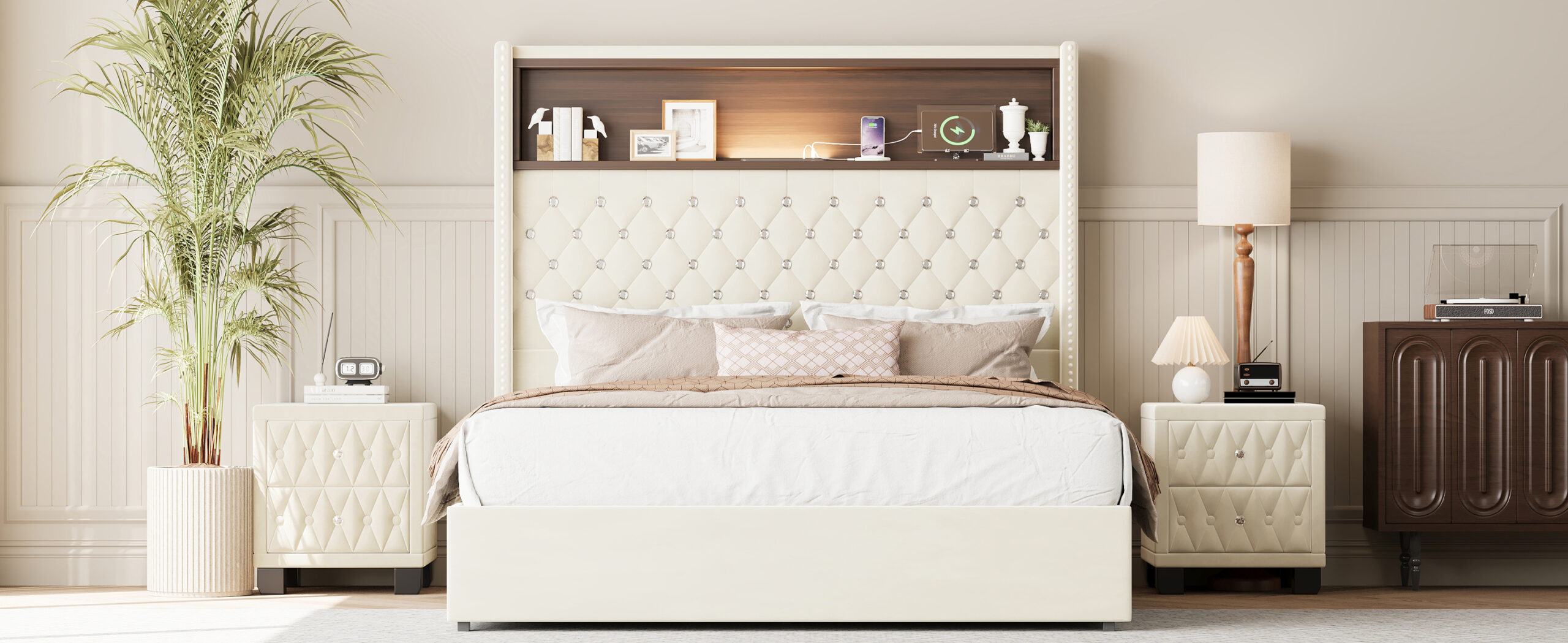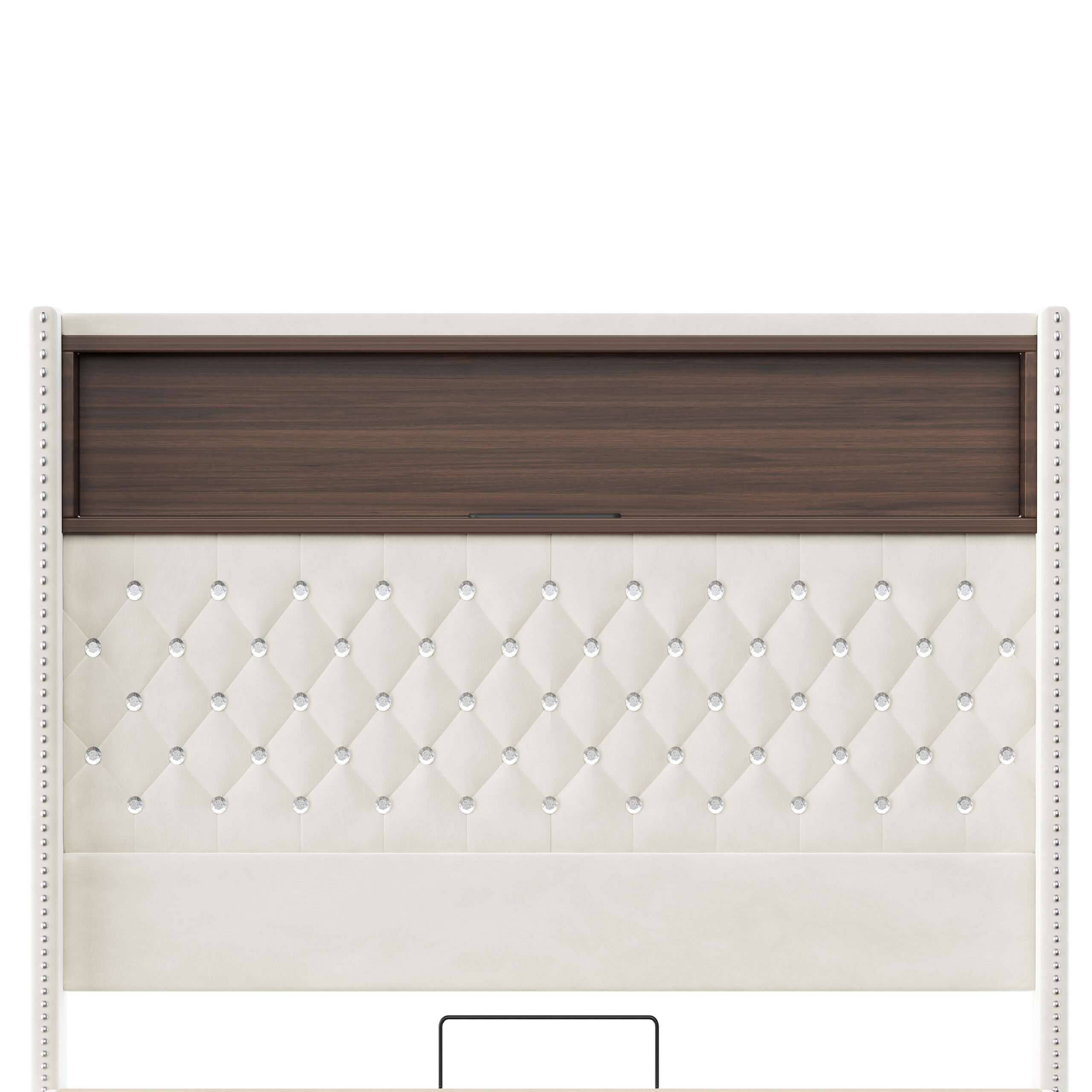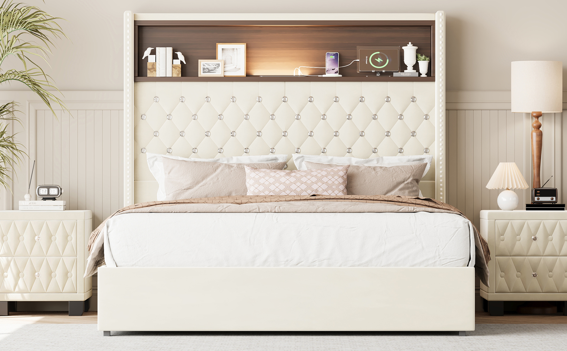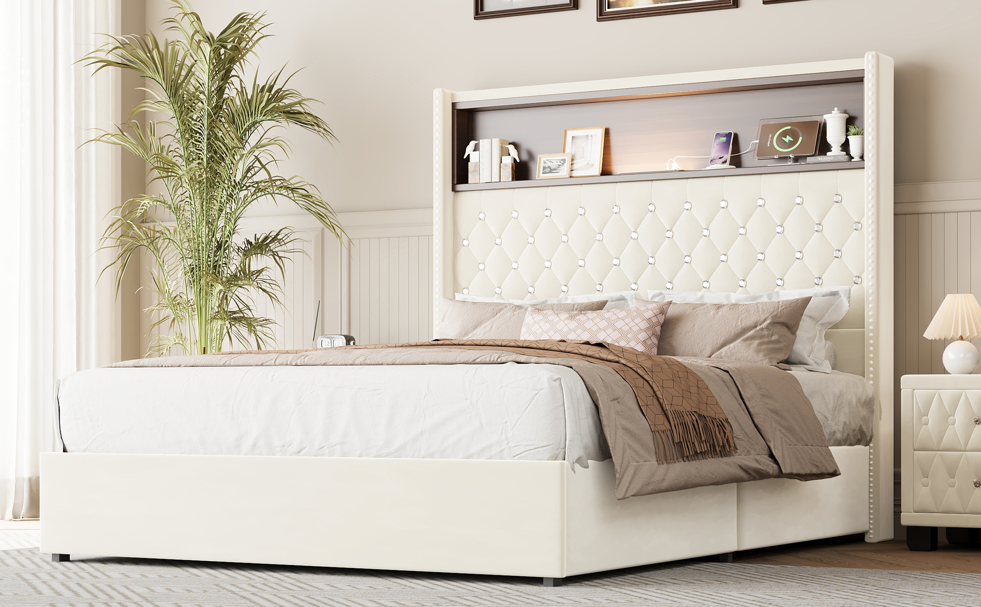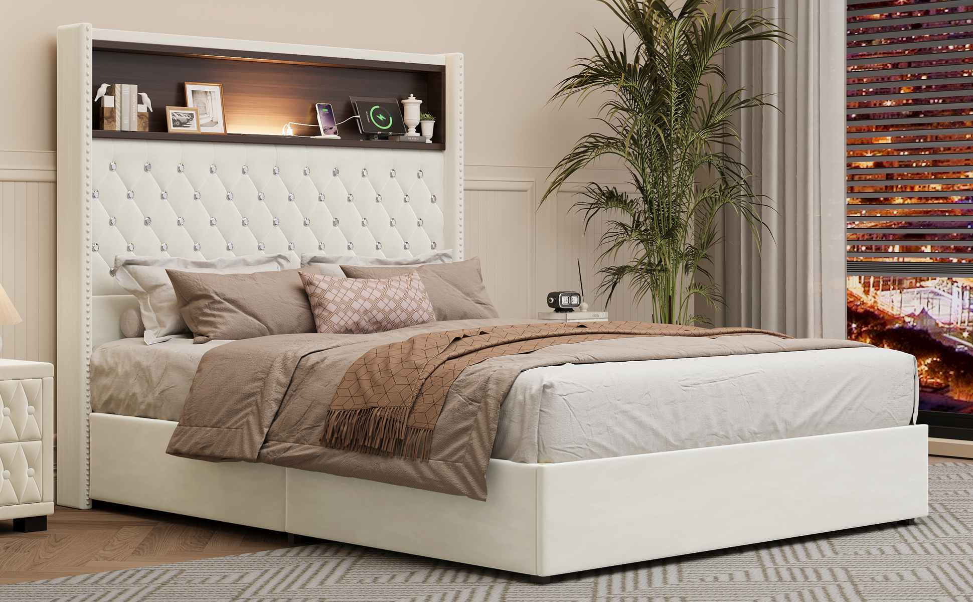 This bed perfectly blends luxurious design with ultimate comfort. Its high tufted headboard, accented with metal rivets, offers both elegance and support. The bedside shelf includes a USB charging port and a soft night light for added convenience, while the wing-back design with a built-in storage rack keeps the bedroom tidy and organized. Crafted from reinforced metal and wood, the sturdy frame ensures durability, and a mattress hook prevents shifting—making this bed a seamless combination of style, comfort, and practicality.