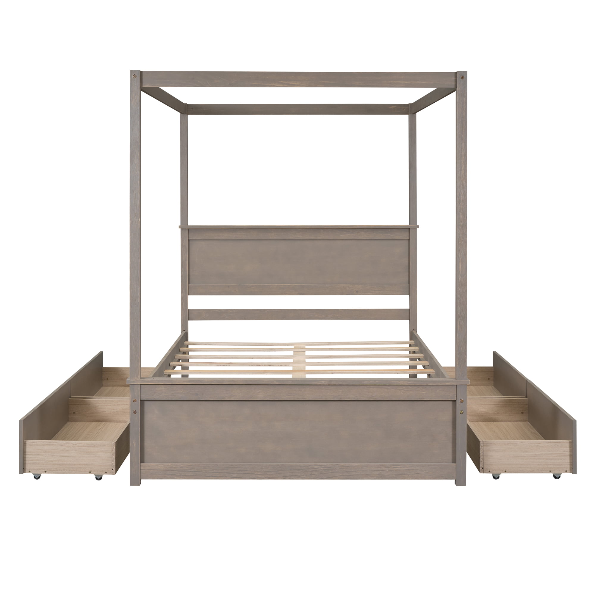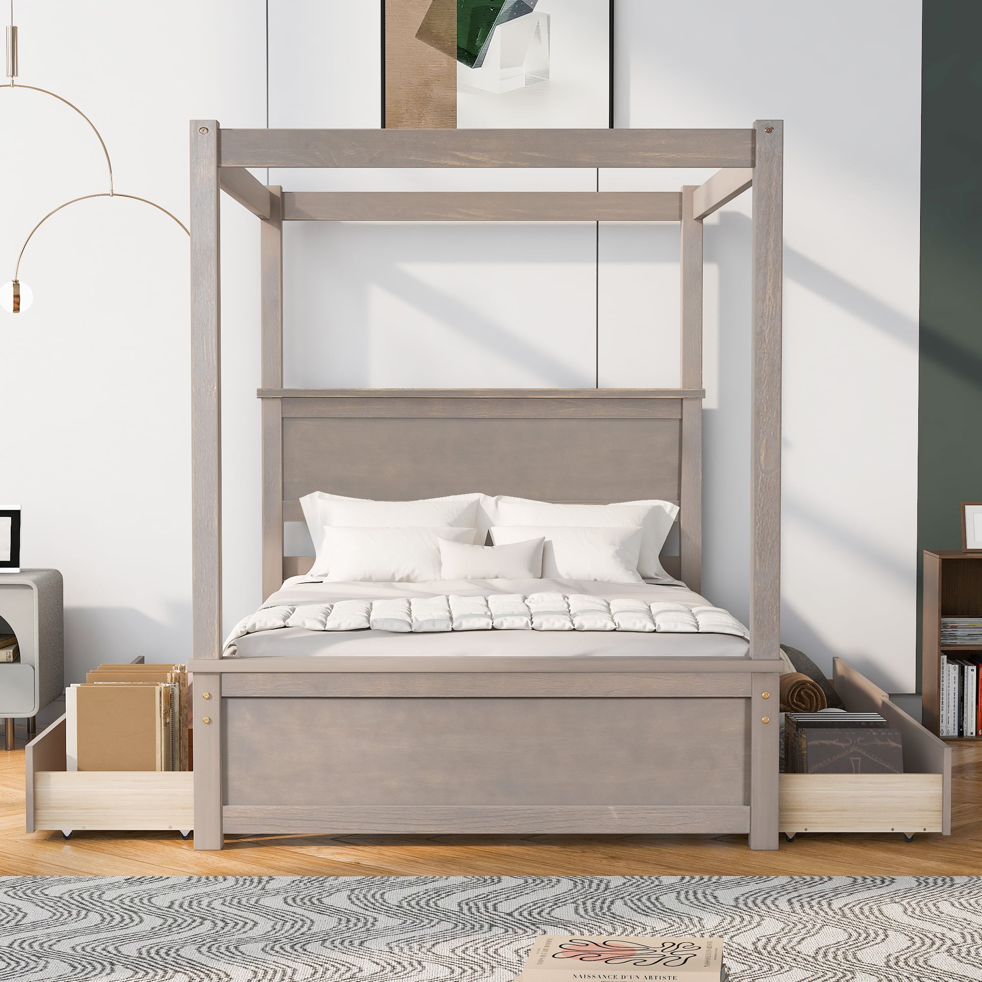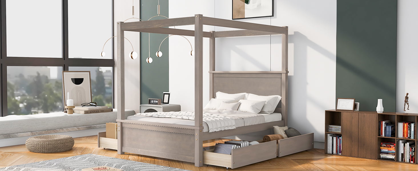- [Modern Design] Wooden canopy bed with brushed-effect finish has a sleek exterior profile, built-in headboard and footboard, with clean lines for a timeless look