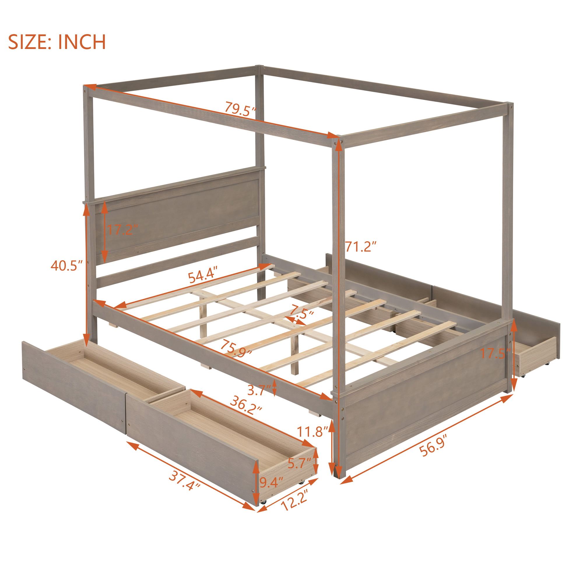 - [Dimensions] Overall bed dimension:79.5″L x 56.9″W x 71.2″H. Weight capacity: 350lbs, this canopy bed with clear instructions and hardware.you can assemble easily.