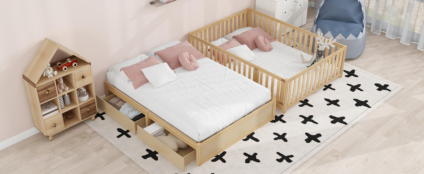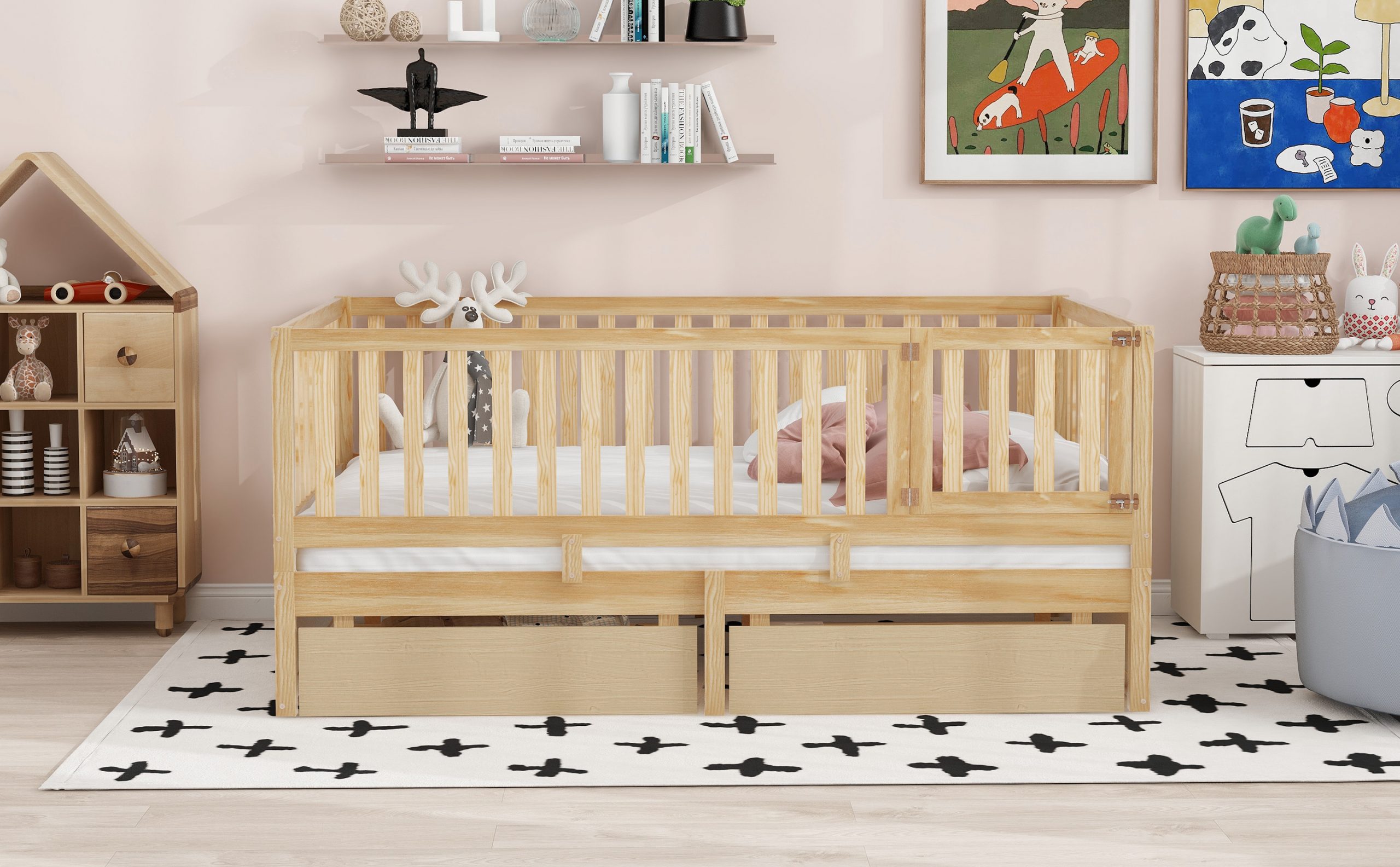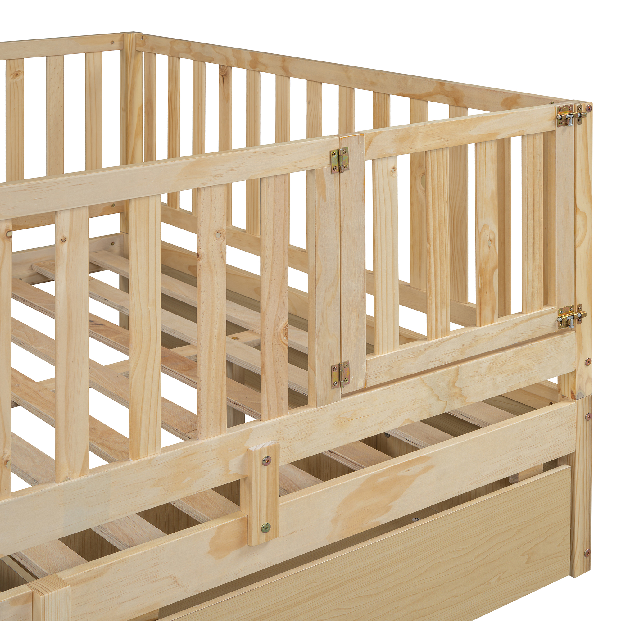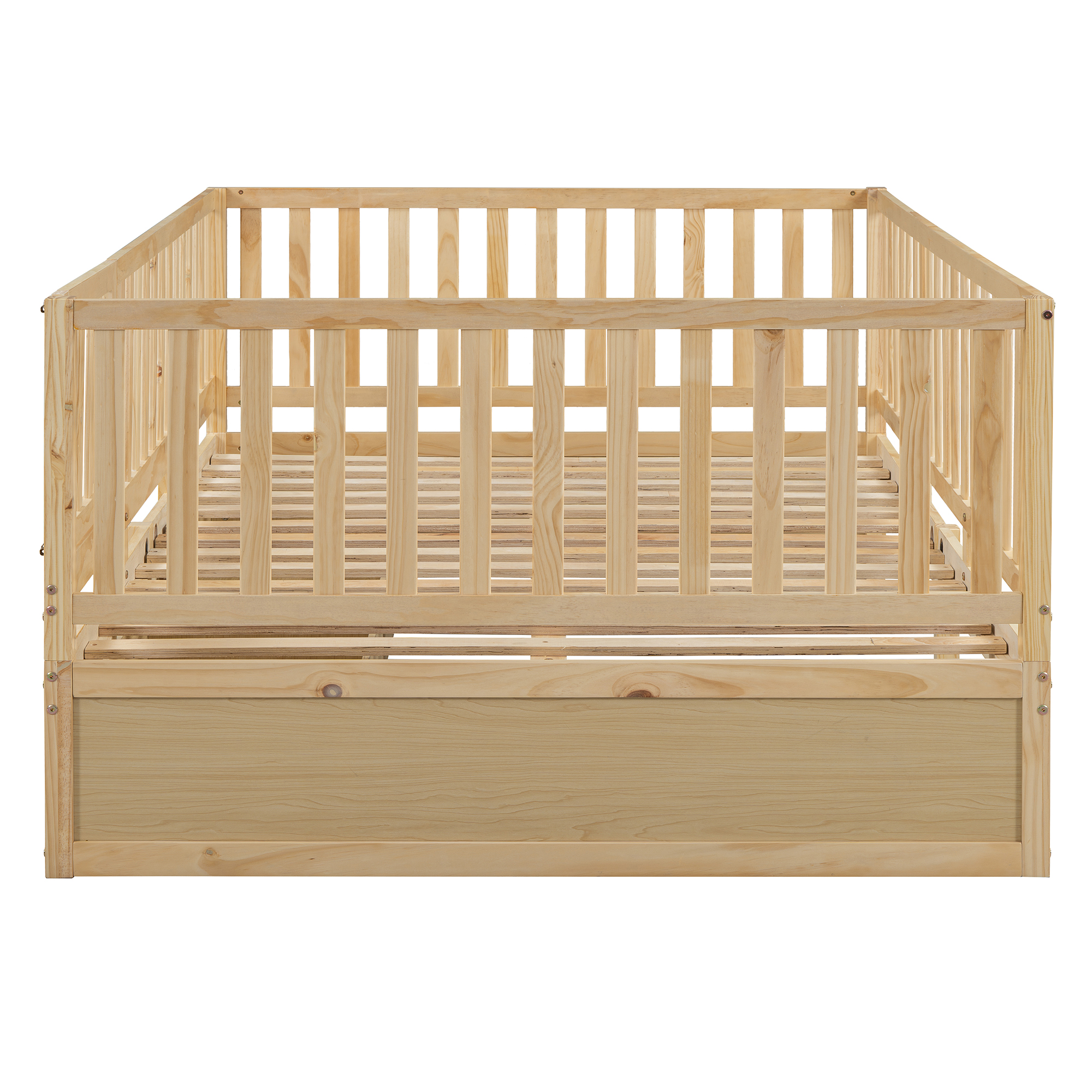 Full Size Wood Daybed with Fence Guardrails and 2 Drawers, Split into Independent Floor Bed & Daybed