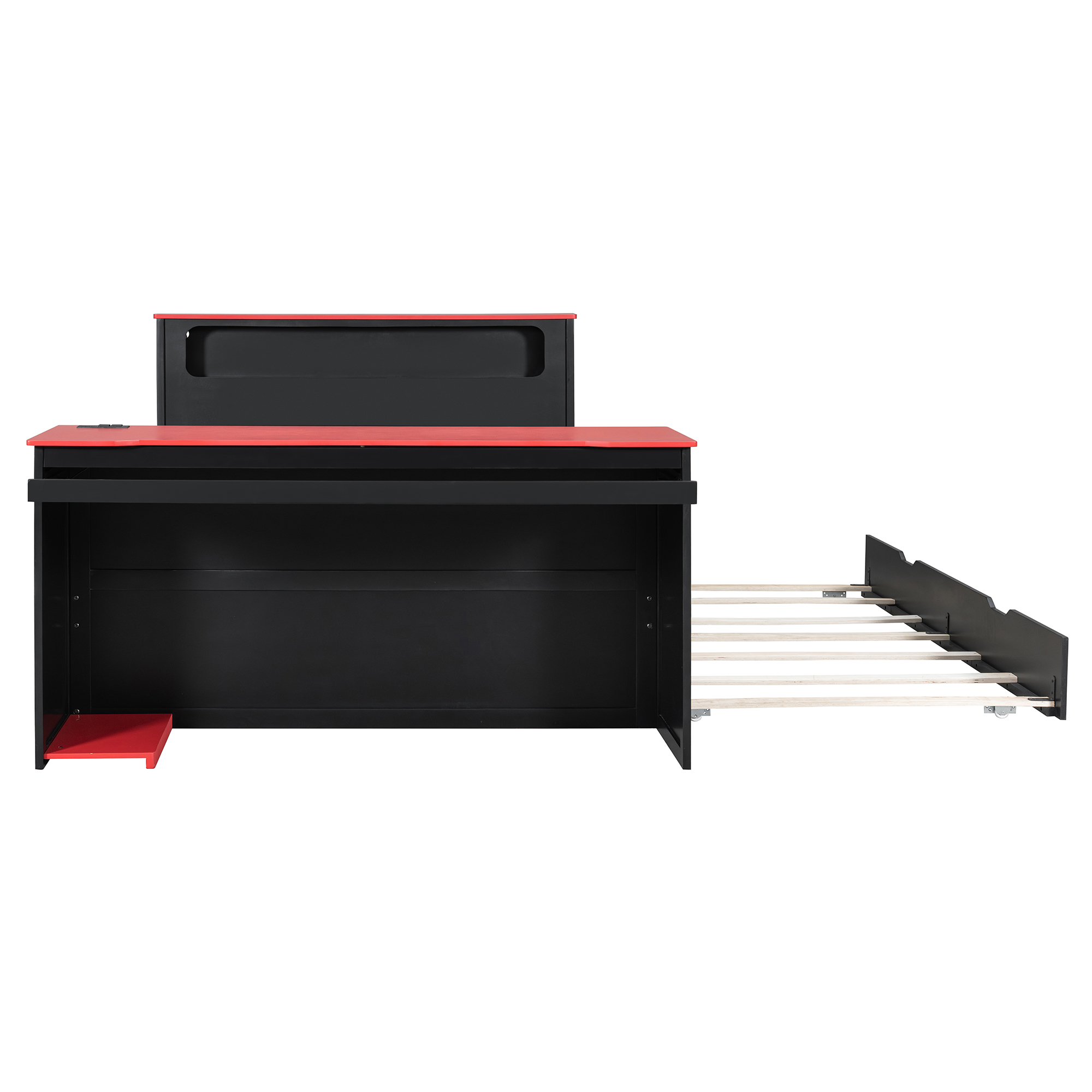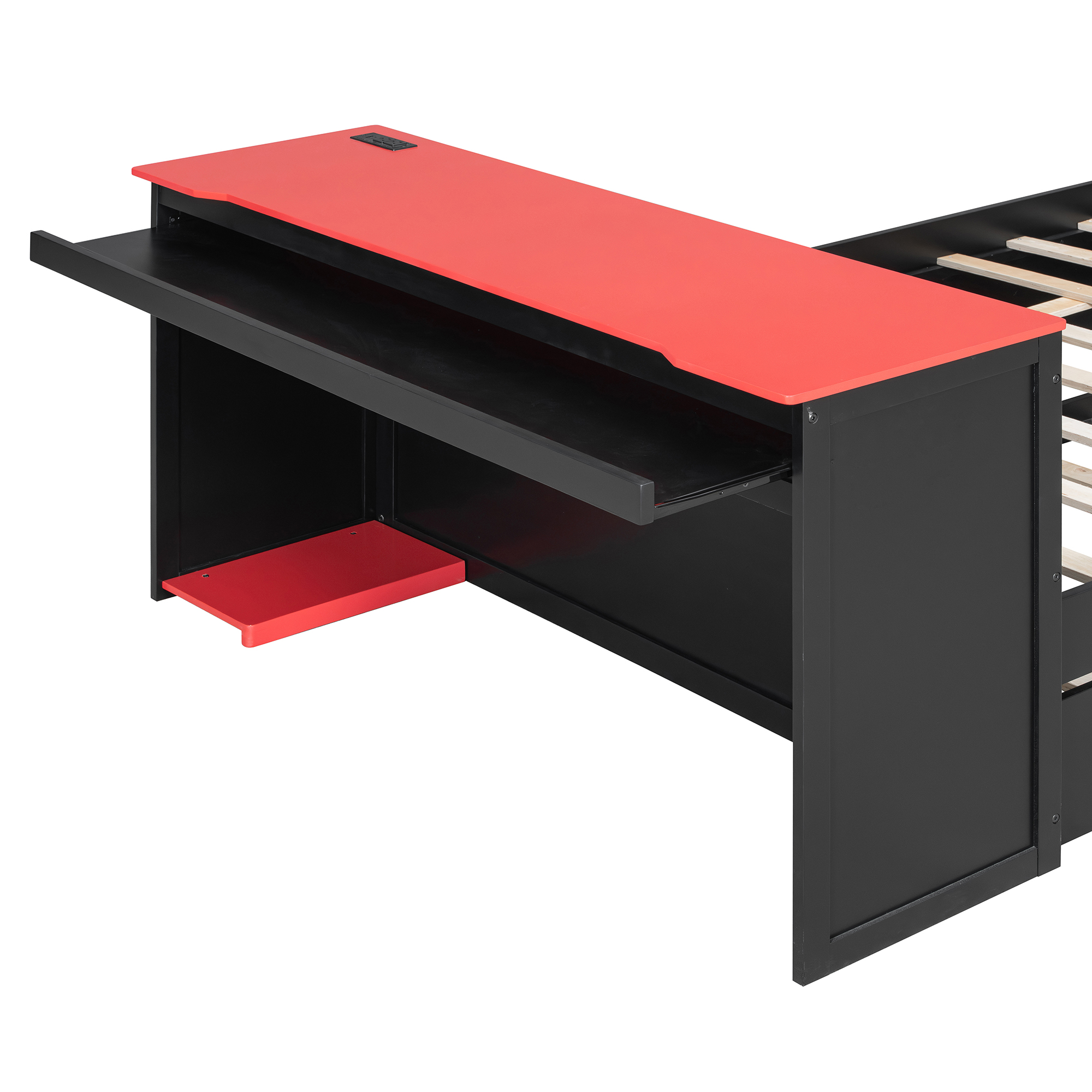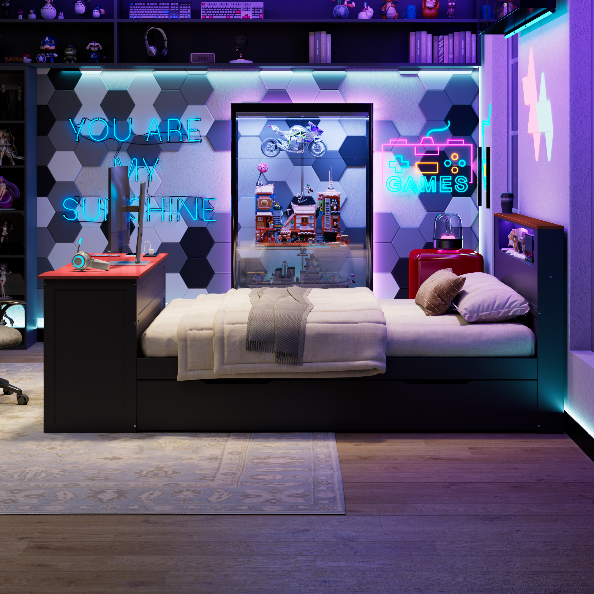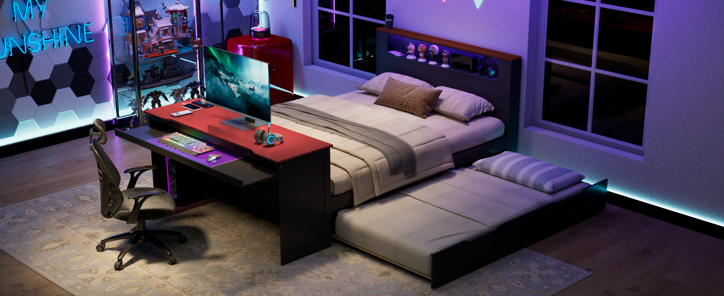 - Integrated Gaming & Study Station: The footboard doubles as a professional-grade desk, featuring a spacious surface for your monitor, a dedicated sliding keyboard tray, and a specialized lower CPU stand. This ergonomic setup keeps your gaming gear or study materials organized without needing extra floor space.