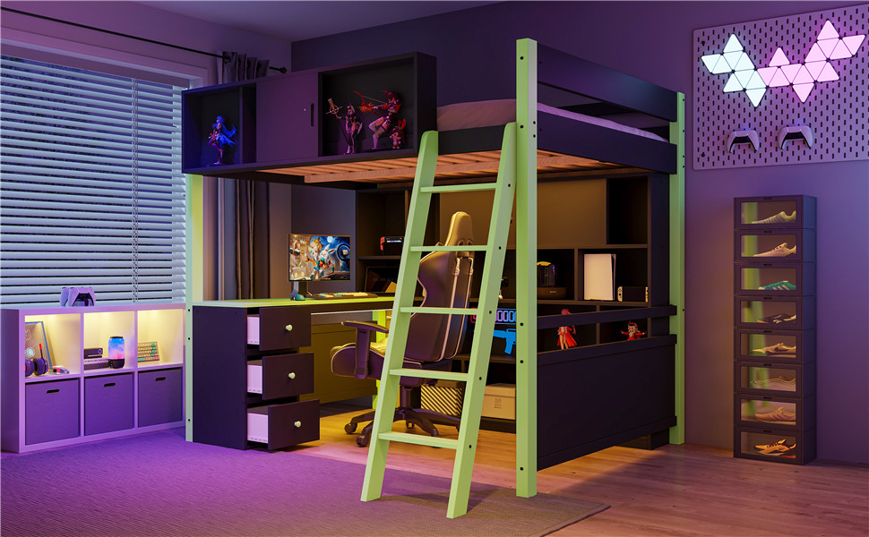 - [Three Large Drawers + Strong Storage System Keep Everything Tidy] With three deep drawers and multiple storage zones on the frame, this loft bed delivers powerful organization for school supplies, gaming accessories, cables, and personal items. It helps maintain a clean, clutter-free gaming environment at all times. Product comes in 3 separate packages. Mattress not included. Some assembly is required, although we have provided clear instructions and tools.