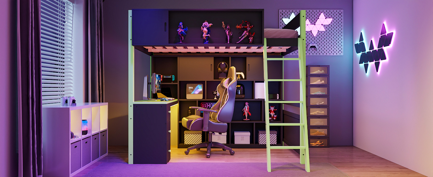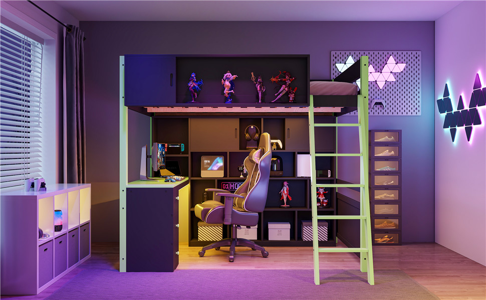 - [Full-Size Gaming Loft Design for an Immersive Setup] This full-size gaming-style loft bed maximizes both vertical and horizontal space, creating a dedicated zone for sleep, work, and play. Its elevated structure helps open up the room while delivering the futuristic look gamers love.