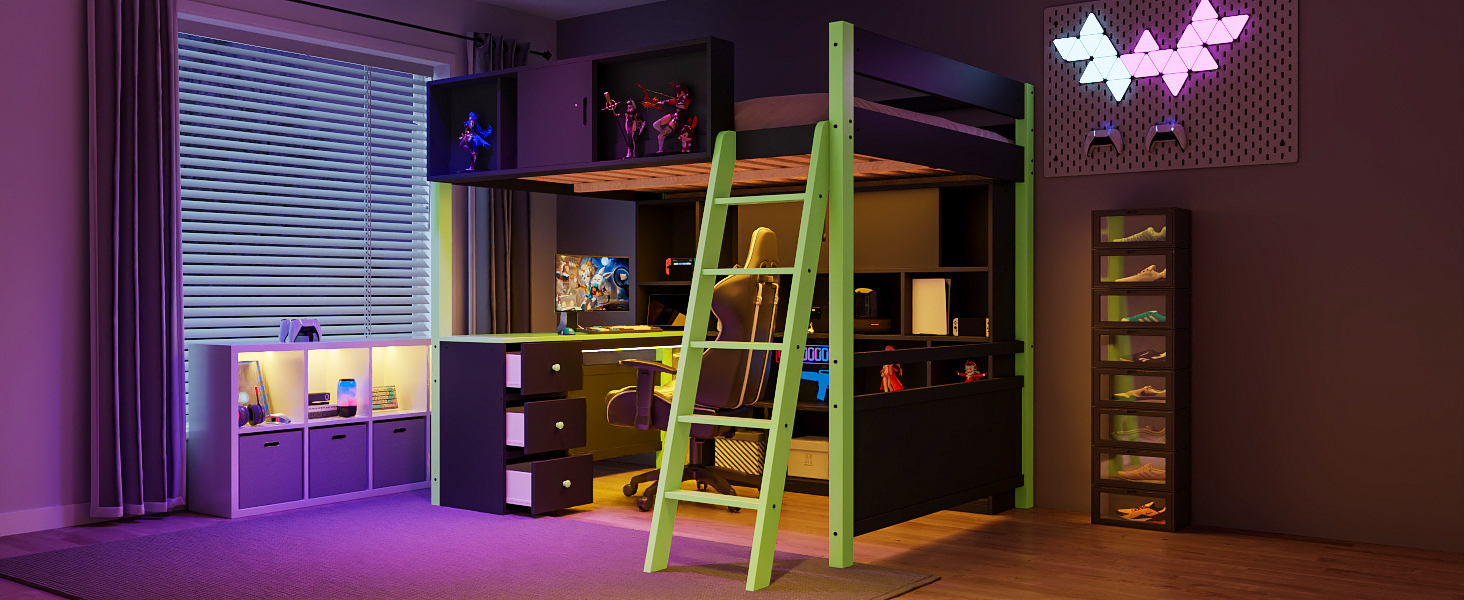 - [Full Wall Storage Shelf for Controllers, Figures & Collectibles] A full-length shelving wall beneath the bed offers generous display and storage capacity, ideal for organizing game controllers, figurines, books, or decorative items. It turns your gaming gear into a visually striking part of your room’s décor.