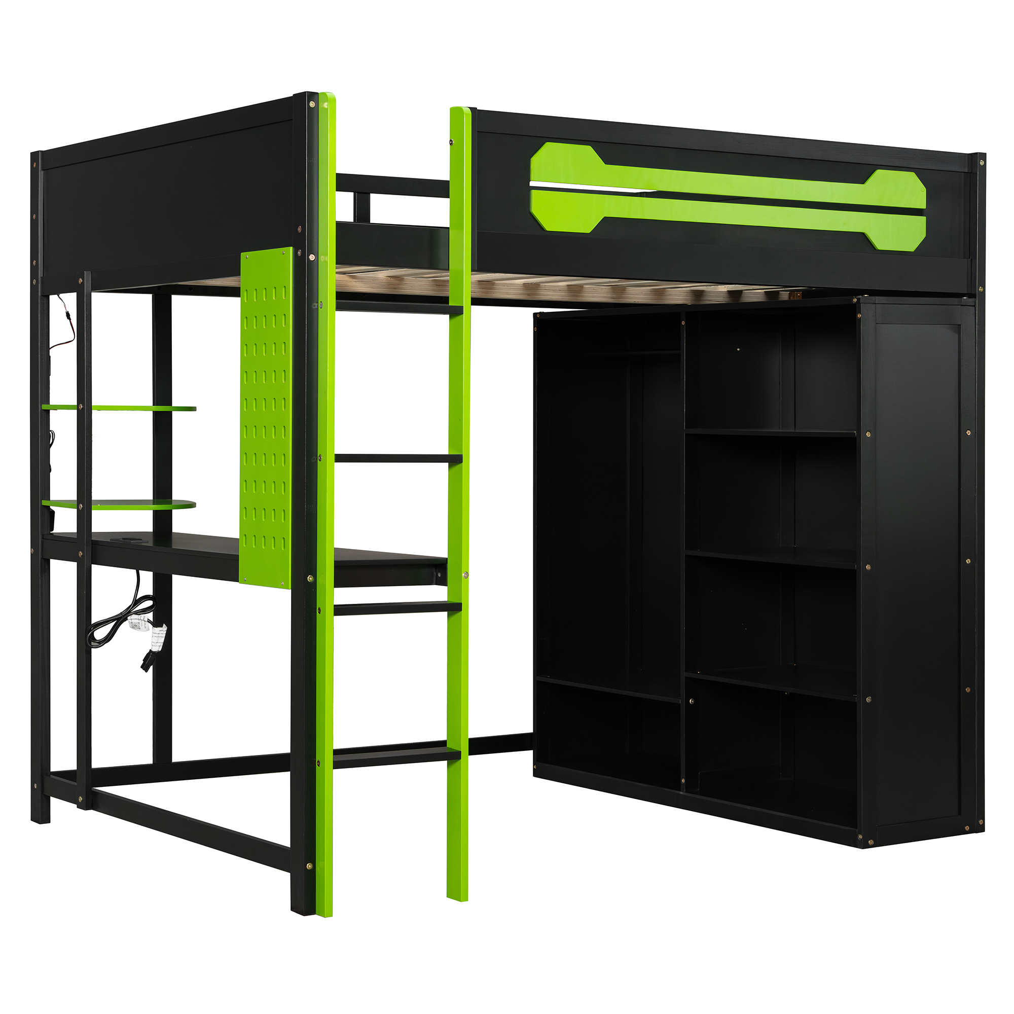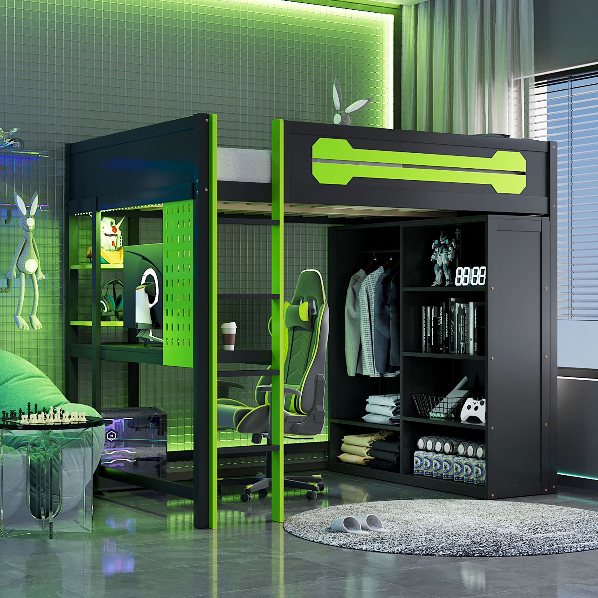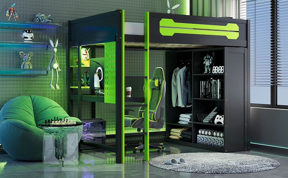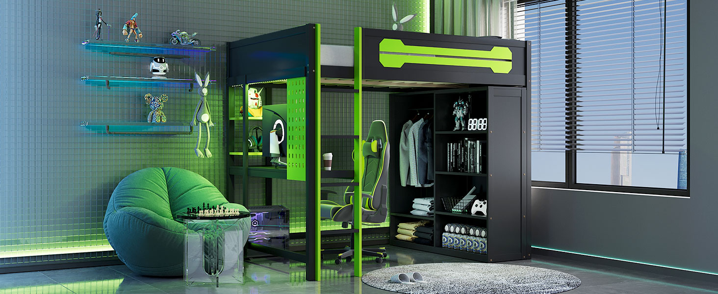 - Ultimate Gaming & Study Station: This full-size loft bed features an integrated spacious desk, an open wardrobe, and shelving, creating a centralized hub for intense gaming sessions and productive study hours.