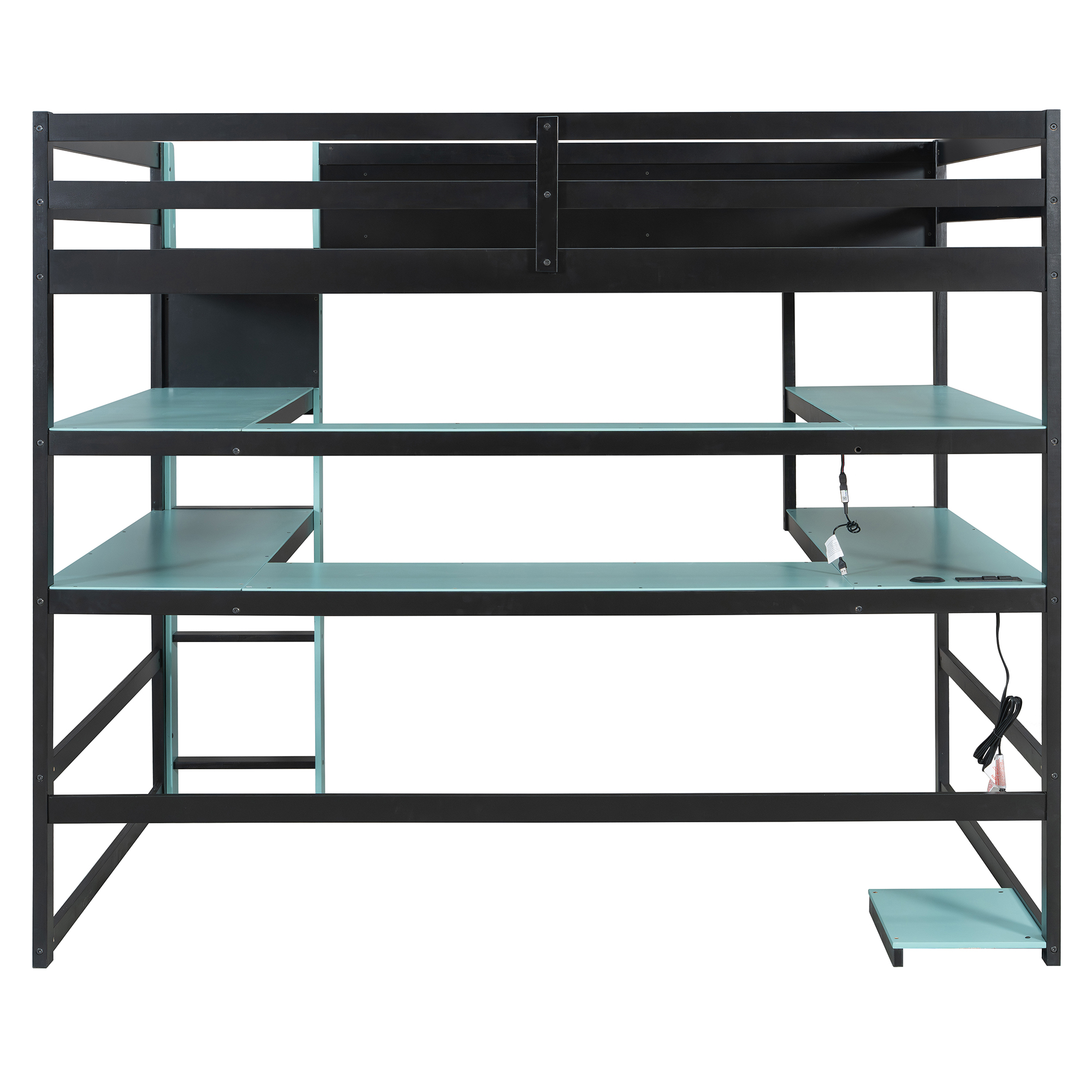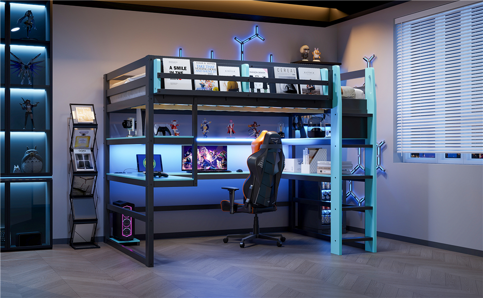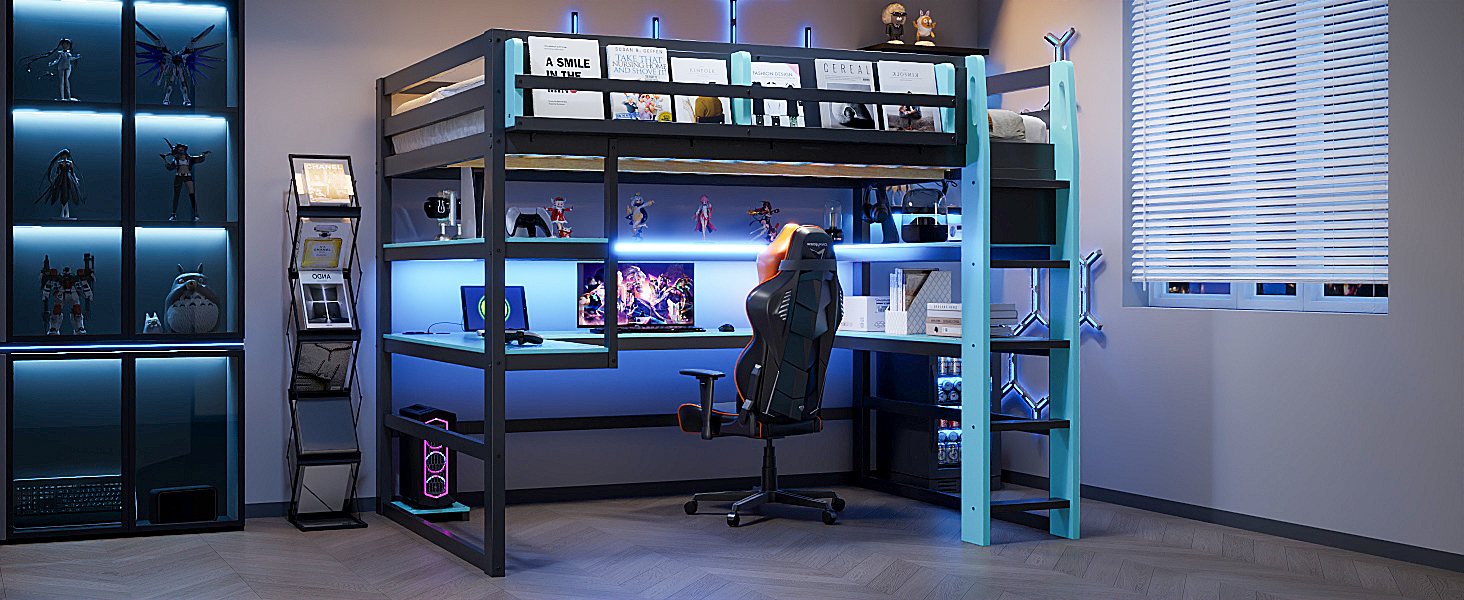 (Price Includes Shipping, No Tax Fee.)Upgrade your bedroom or gaming room with this Gaming Wood Loft Bed. Designed for both functionality and style, it combines a sturdy wood construction with a trendy black-red, black-green, black-sky blue color scheme that fits perfectly in any modern or gaming-themed space.The loft bed comes with rich storage solutions: a circular double-sided storage platform under the bed offers large capacity for gaming gear, daily items and decorations, while the outer rail shelves provide easy access to books, headphones and small essentials.For added convenience, the bed is equipped with USB charging ports and LED light strips, allowing you to charge your devices anytime and enjoy a cool, immersive lighting environment. Whether for study, rest or gaming, it meets all your daily needs while saving space and enhancing room style.
