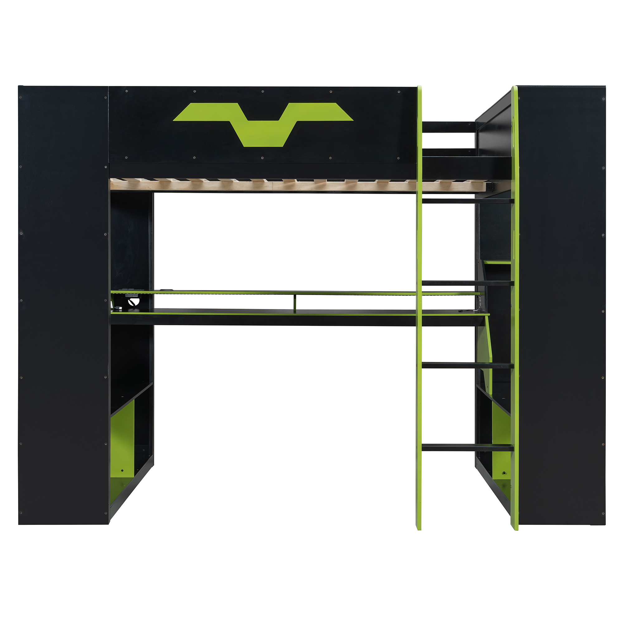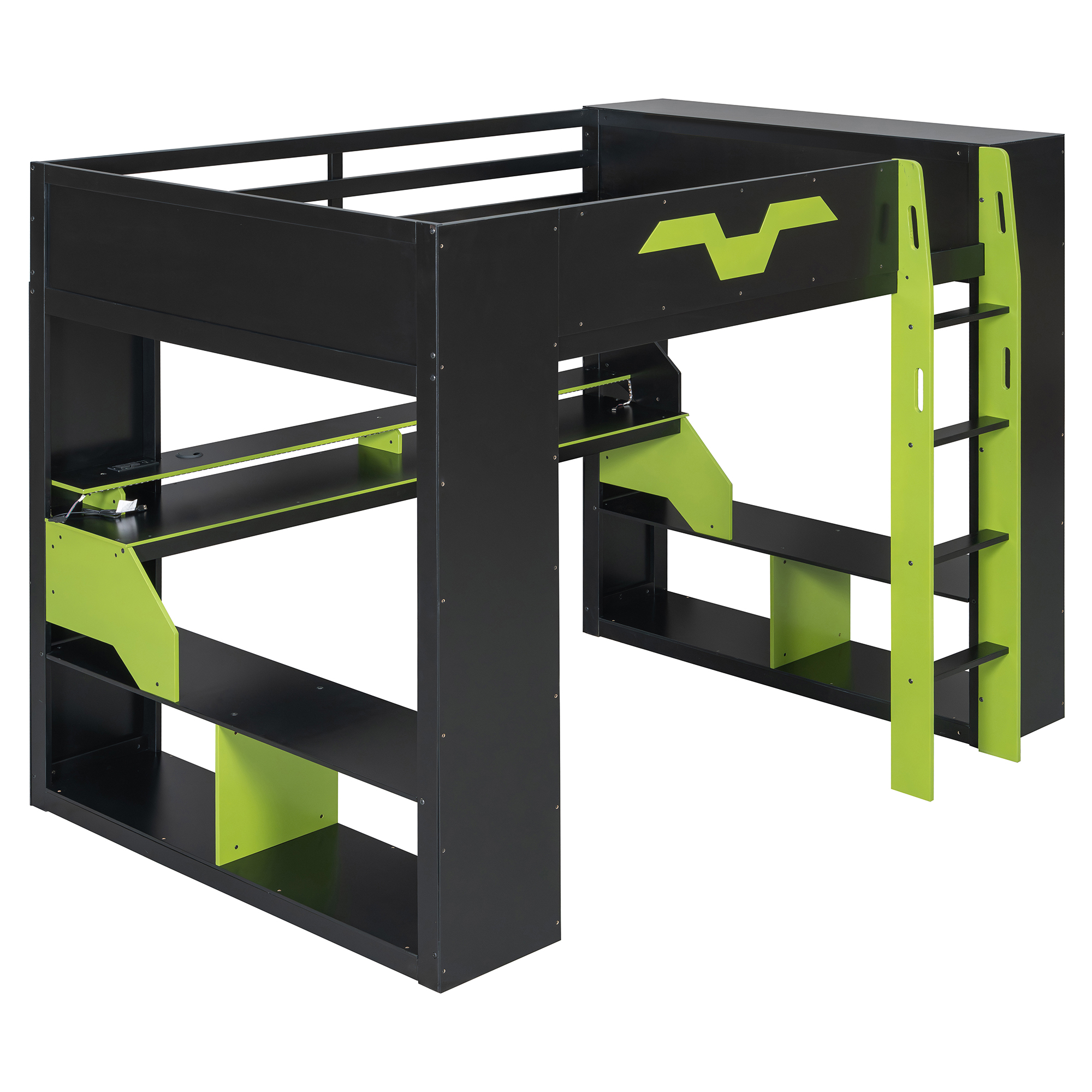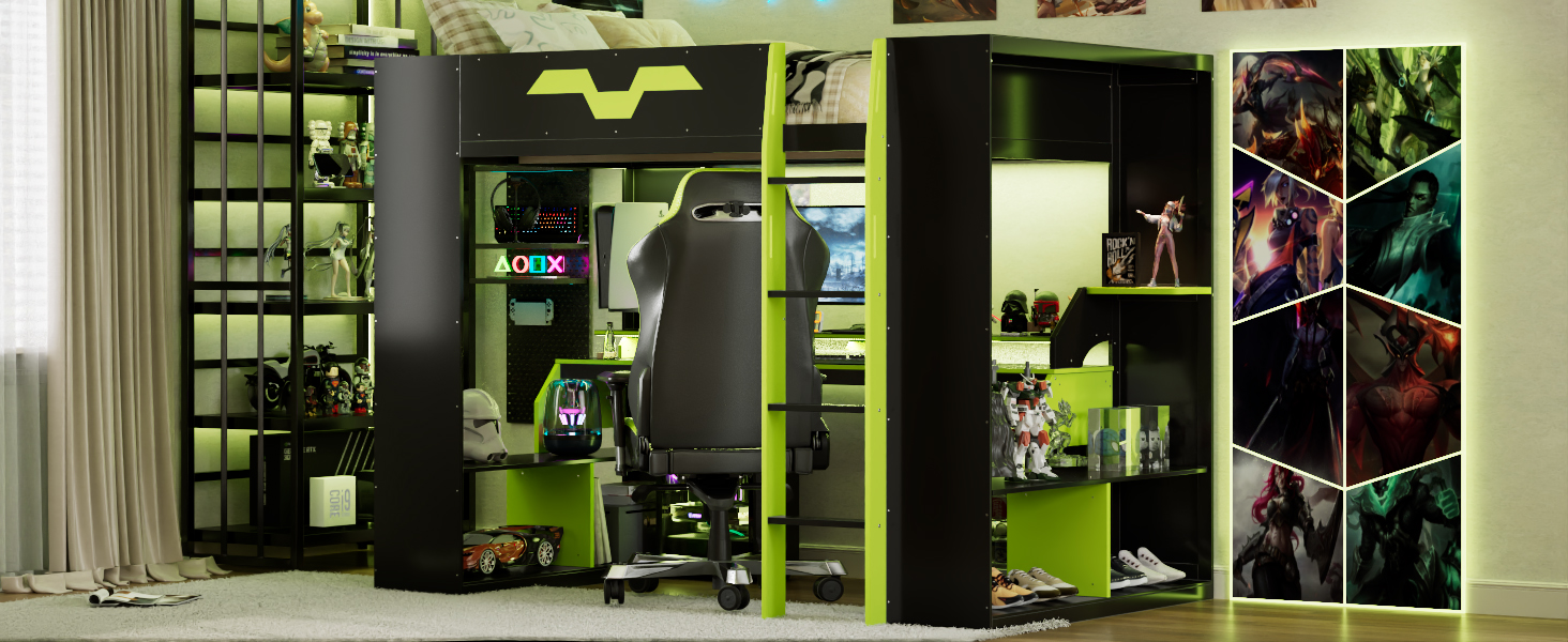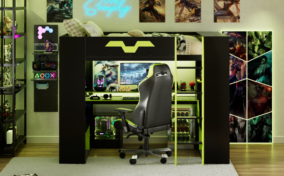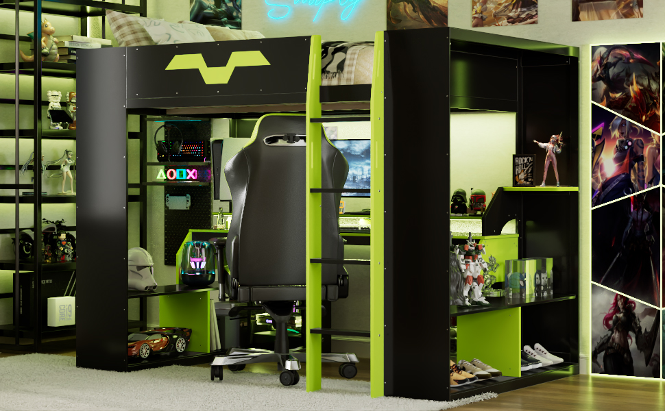 - [Ergonomic Workspace & Multi-Tier Storage] Designed for productivity and comfort, the spacious desk includes a raised monitor shelf to help maintain a healthy posture and reduce neck strain. Two-tier storage shelves on both sides of the bed, plus additional side pockets near the desk, provide ample room for books, collectibles, and gaming gear, making every inch of the room work harder for you. t’s the ideal solution for small bedrooms, apartments, or dorms looking for a modern, high-tech upgrad