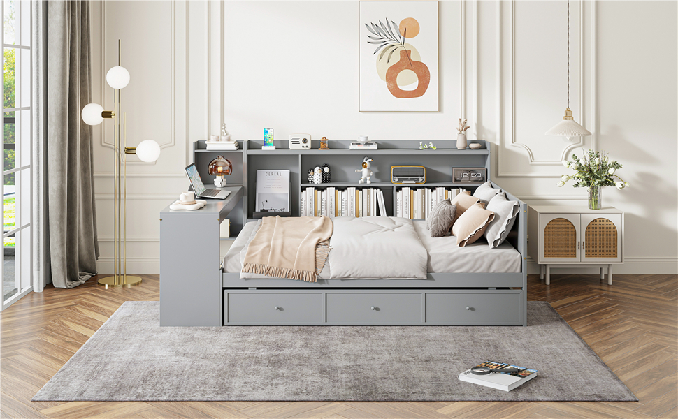 (Price Includes Shipping, No Tax Fee.)Transform your bedroom with this versatile pine wood bed frame, designed for comfort and style. Made from high-quality pine, it offers exceptional durability with 10 supportive slats, eliminating the need for a box spring.Maximize your space with three spacious drawers for storing clothes and linens, keeping your room organized. The side compartments are perfect for books or small items, and the top surface is ideal for decorative pieces.A standout feature is the integrated desk, equipped with USB ports and power outlets, making it easy to charge your devices while you work or study. This multifunctional design combines a bed and a desk, perfect for smaller spaces.With overall dimensions of 92.1″L x 63.7″W x 42.5″H, it fits various bedroom layouts.
