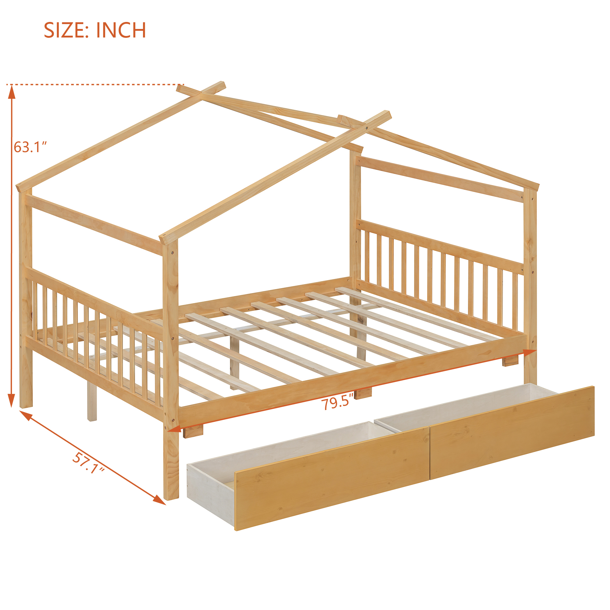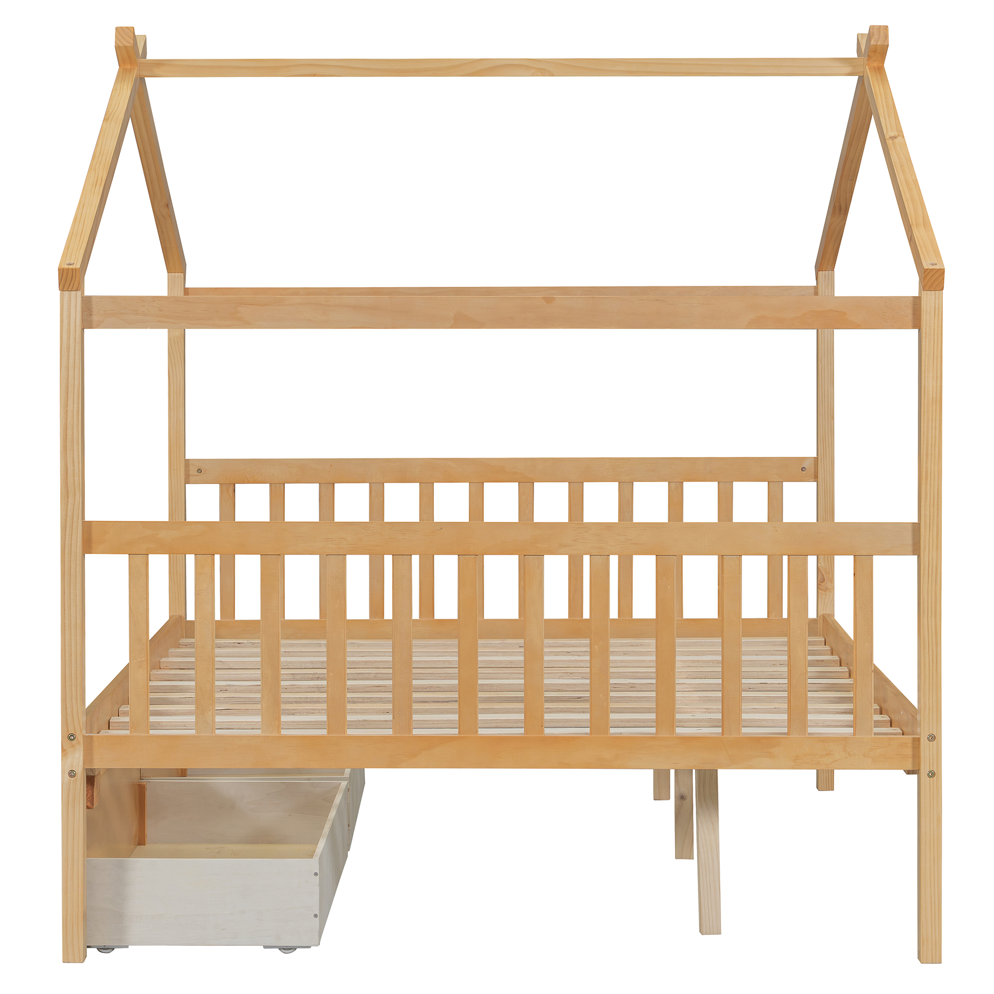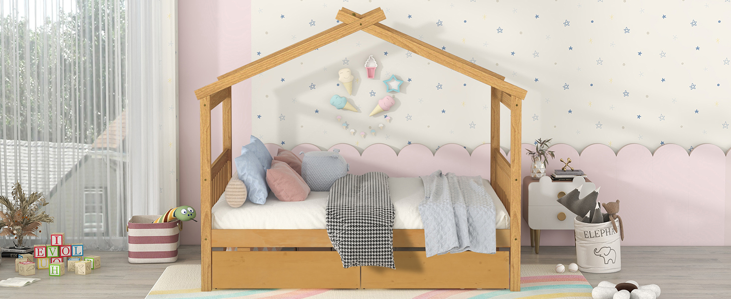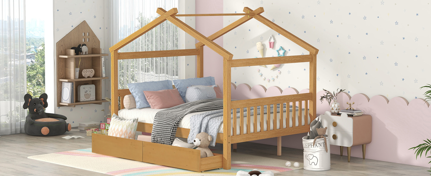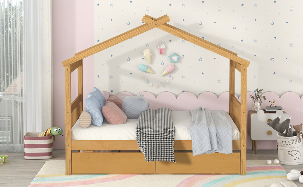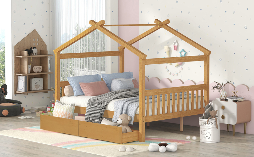- [Spacious Storage] The wood house platform bed with two drawers offer storage space for clothes and toys, Maximize space and help to develop your child’s habit of storage. It’s a perfect space-saving solution to you.