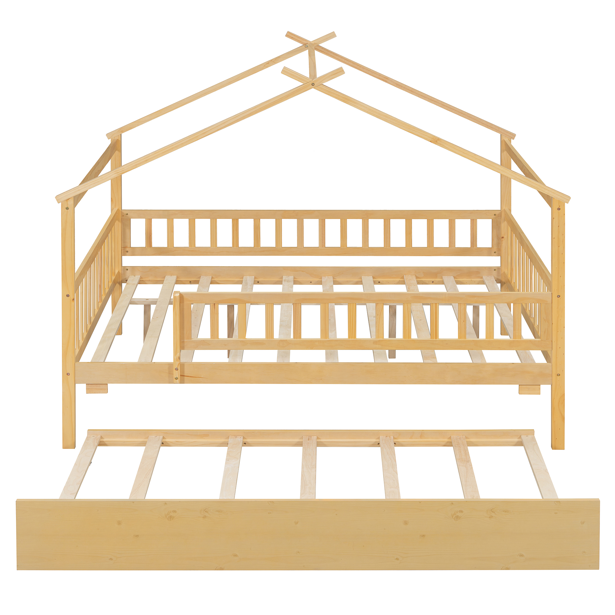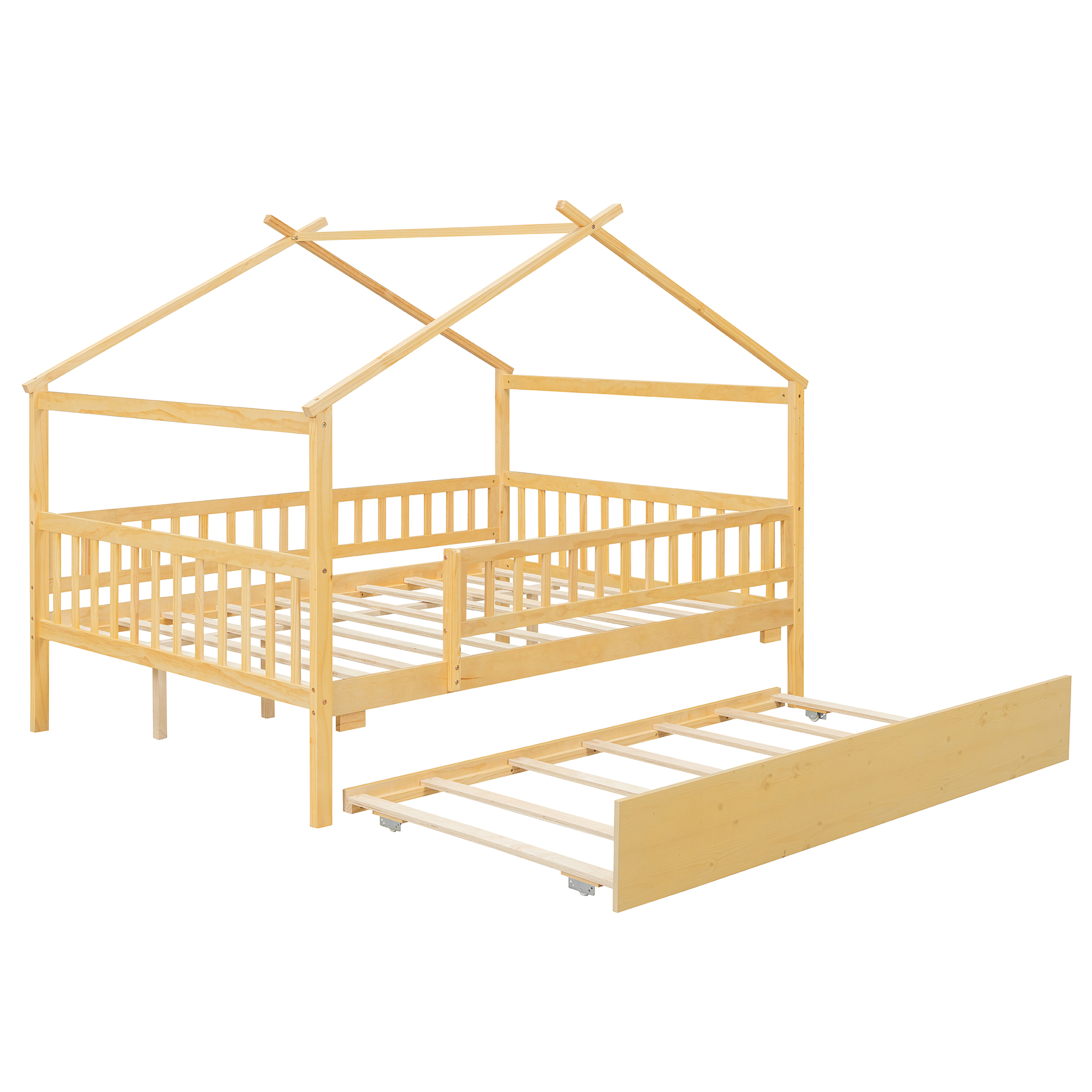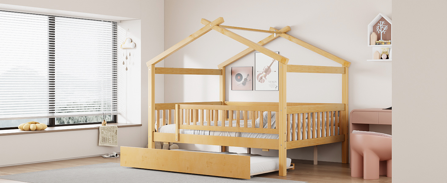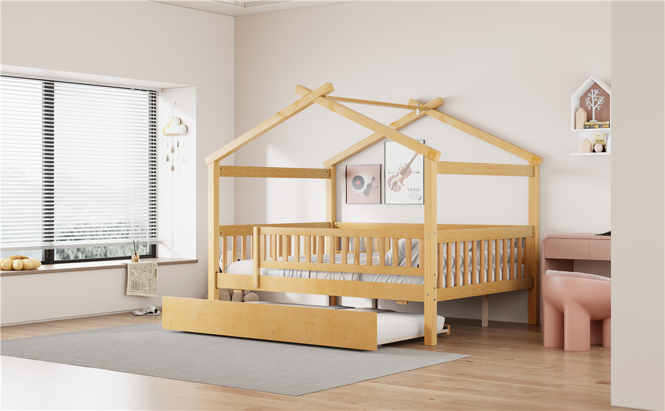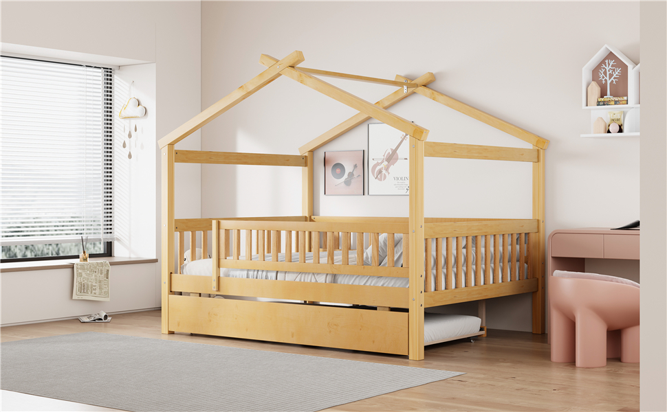 - [Spacious Storage] The wood house platform bed with trundle offer extra sleeping space for sleep-over. Simply just roll out when needed and roll in when it’s not in use. It’s a perfect space-saving solution to you.
