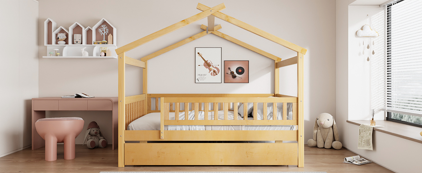 - [Creativity House Bed] The kids house bed featuring a classic house-shape, this imaginative bed is equipped with a whimsical sky roof for a fun bedroom environment that your child will love.