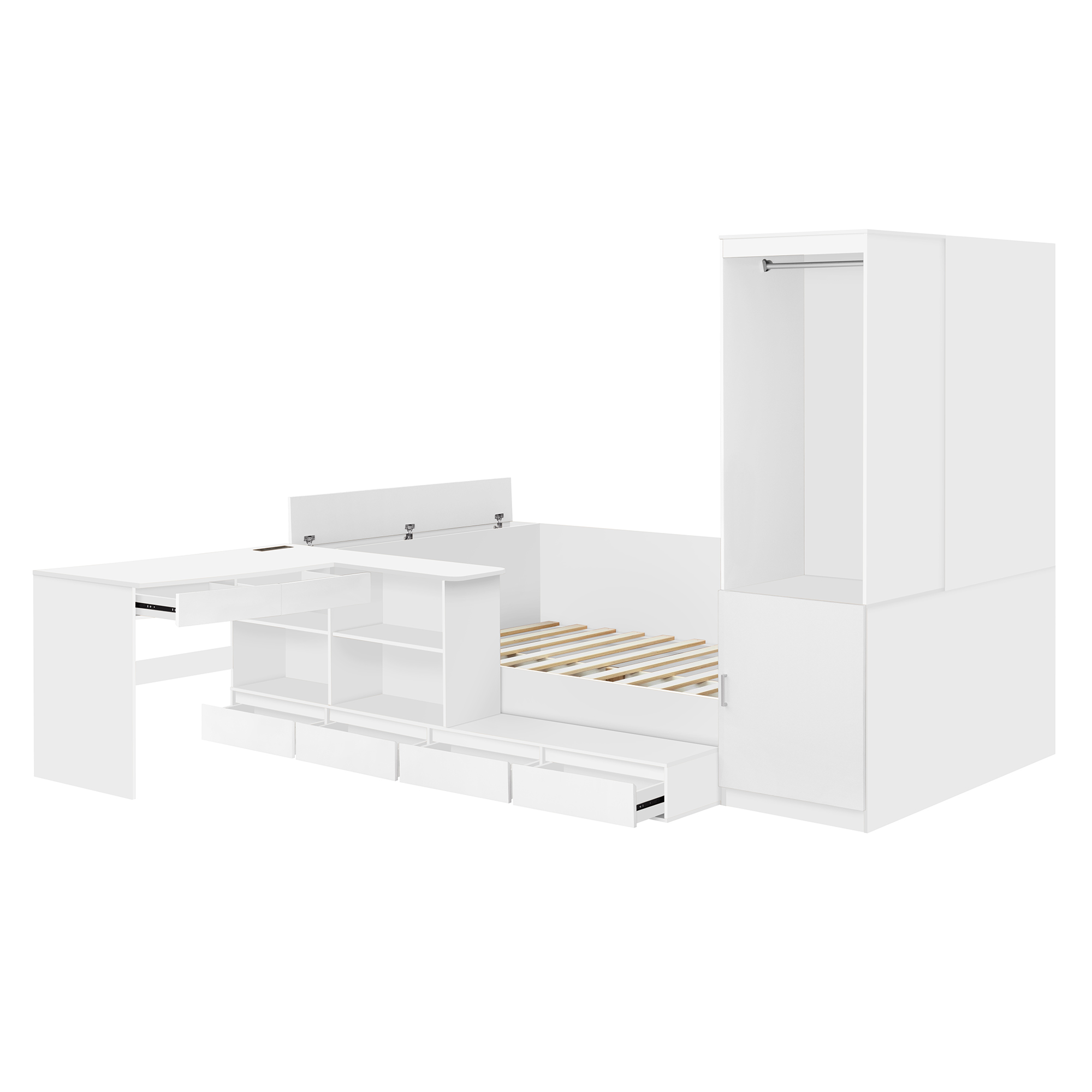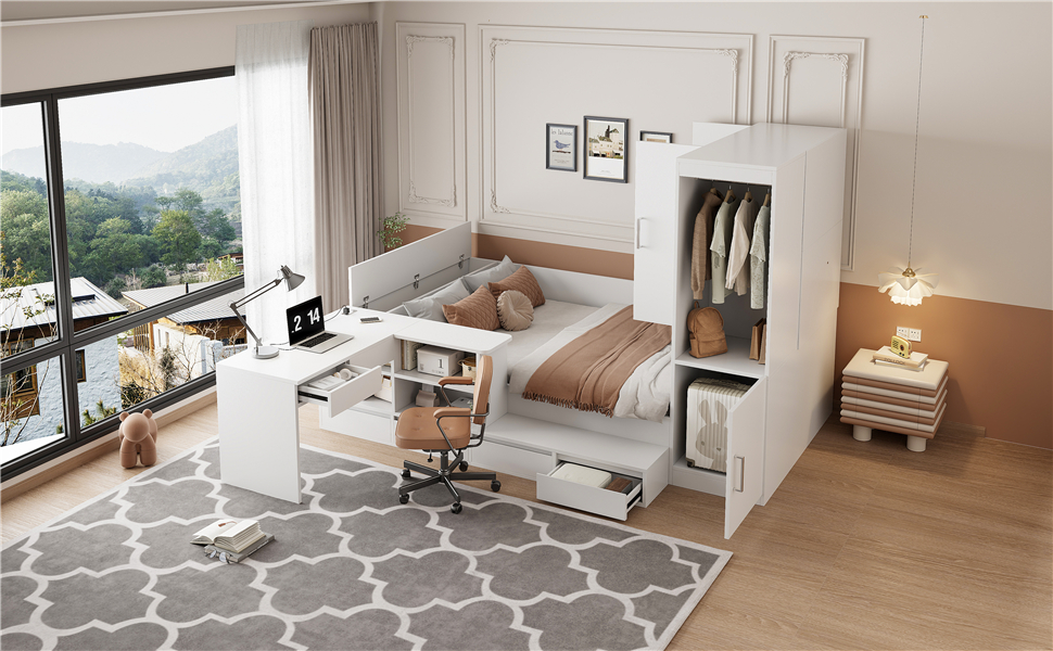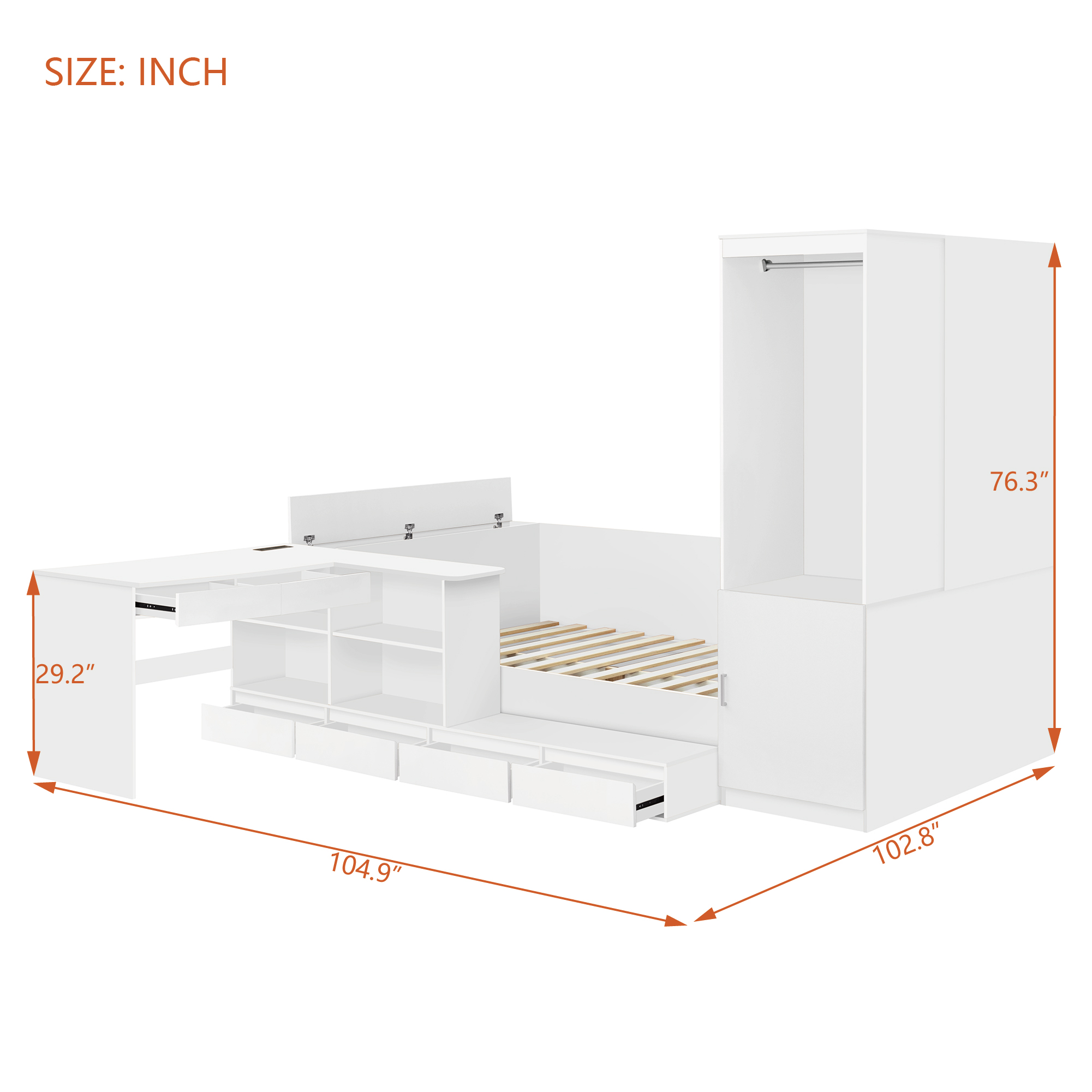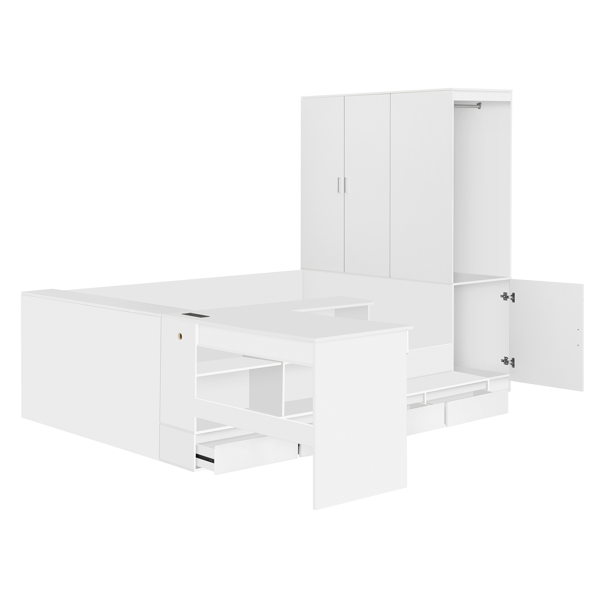 Wooden Full Size Platform Bed With 6 Drawers, Shelves, Desk And Wardrobe