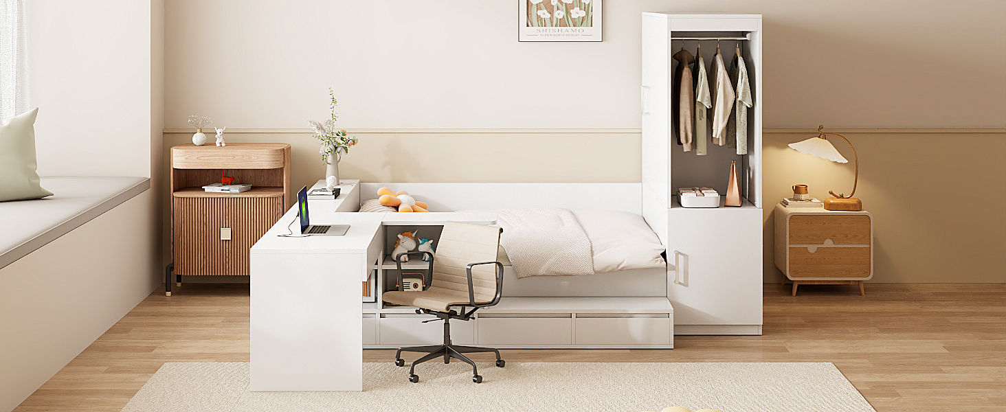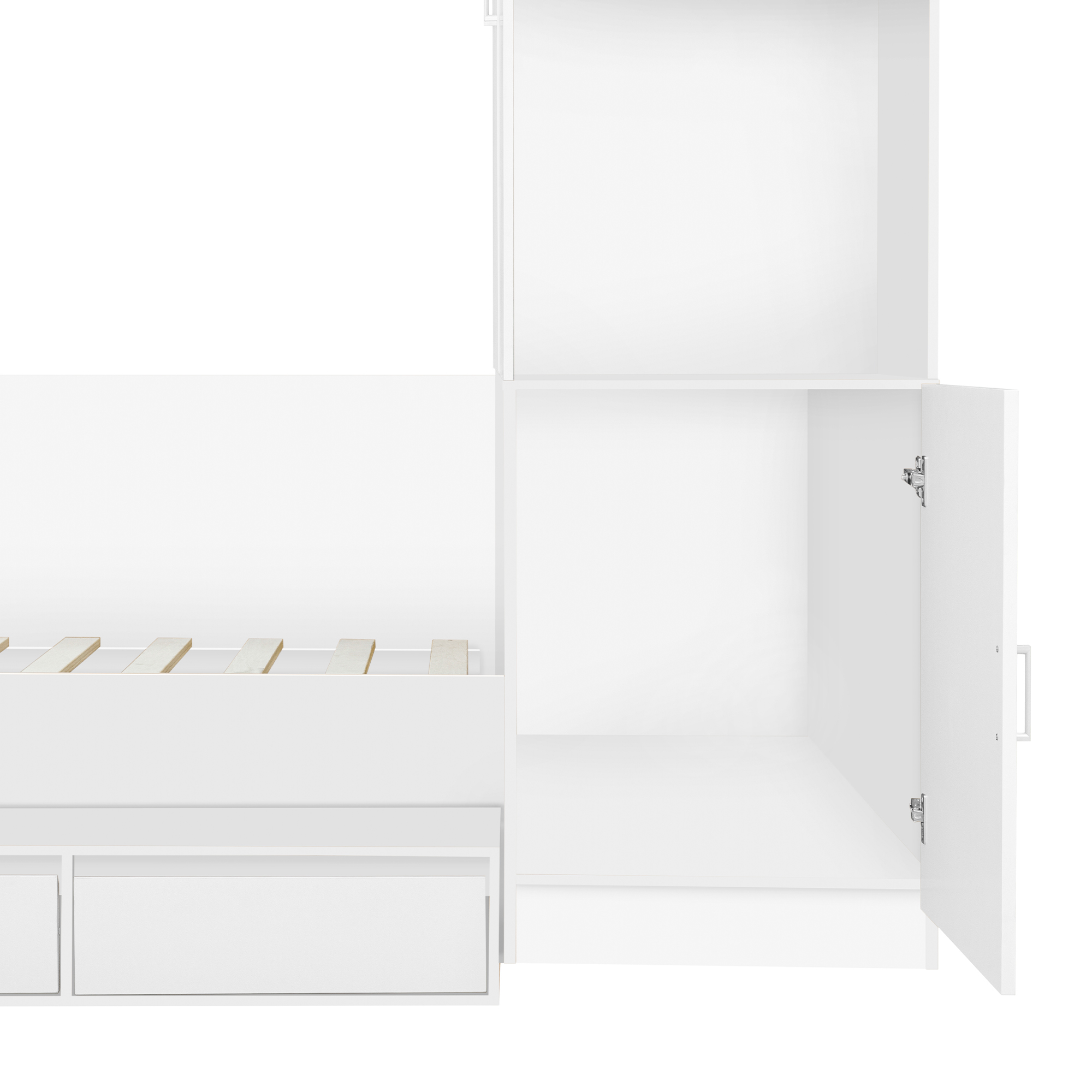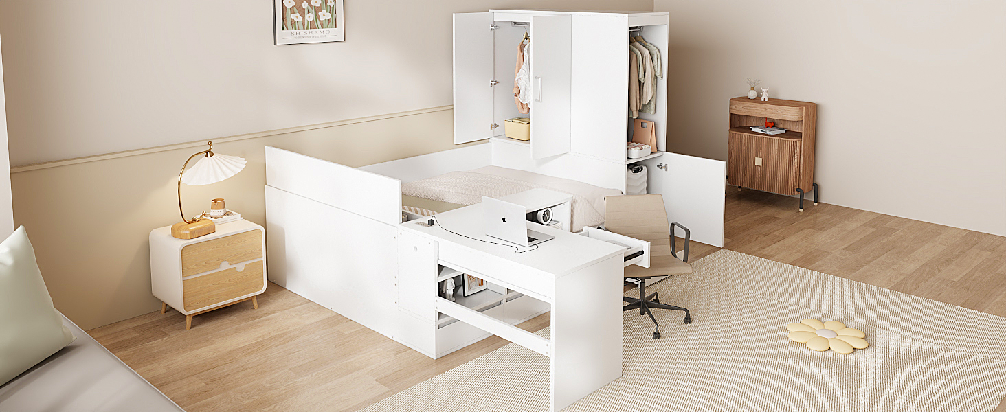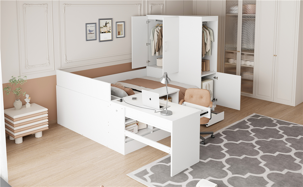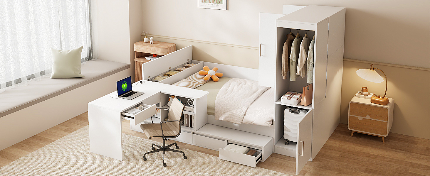 Wooden Full Size Platform Bed With 6 Drawers, Shelves, Desk And Wardrobe