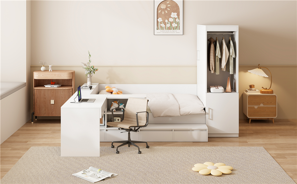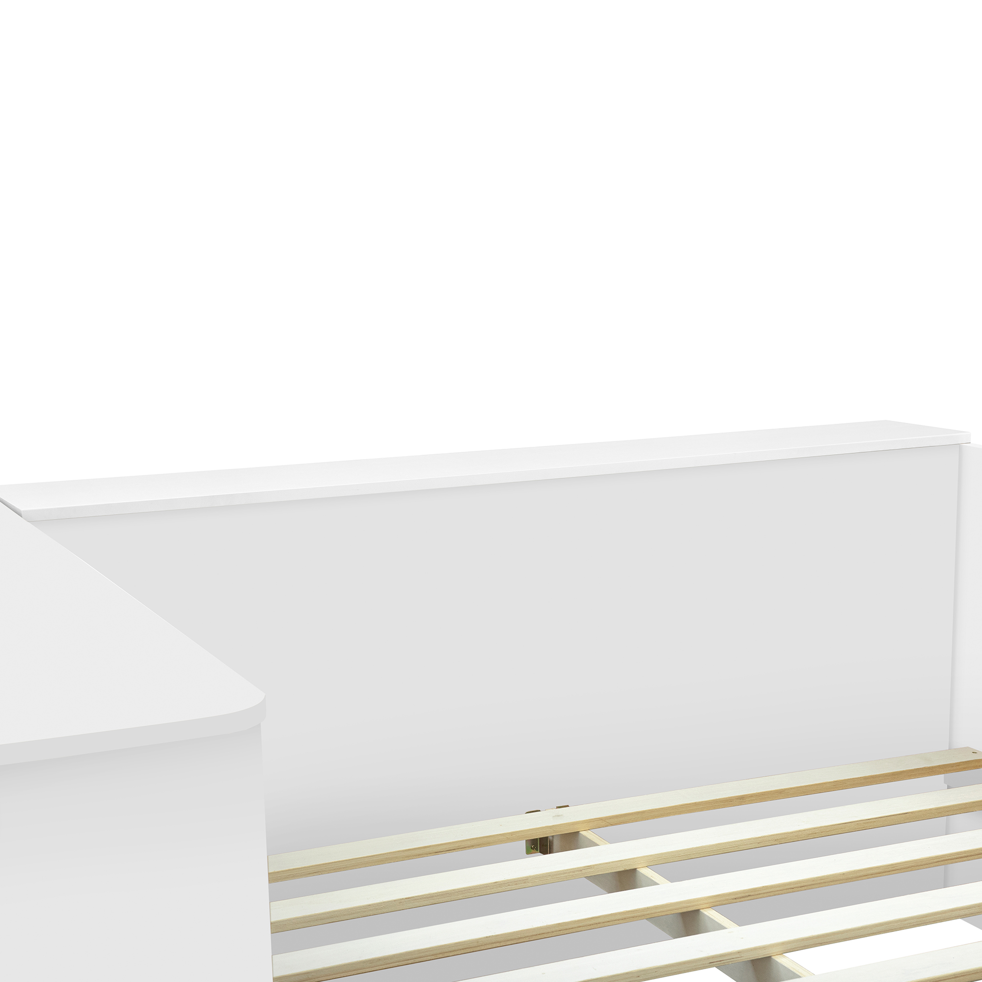 Full Size Wooden Platform Bed With 6 Drawers, Shelves, Desk And Wardrobe