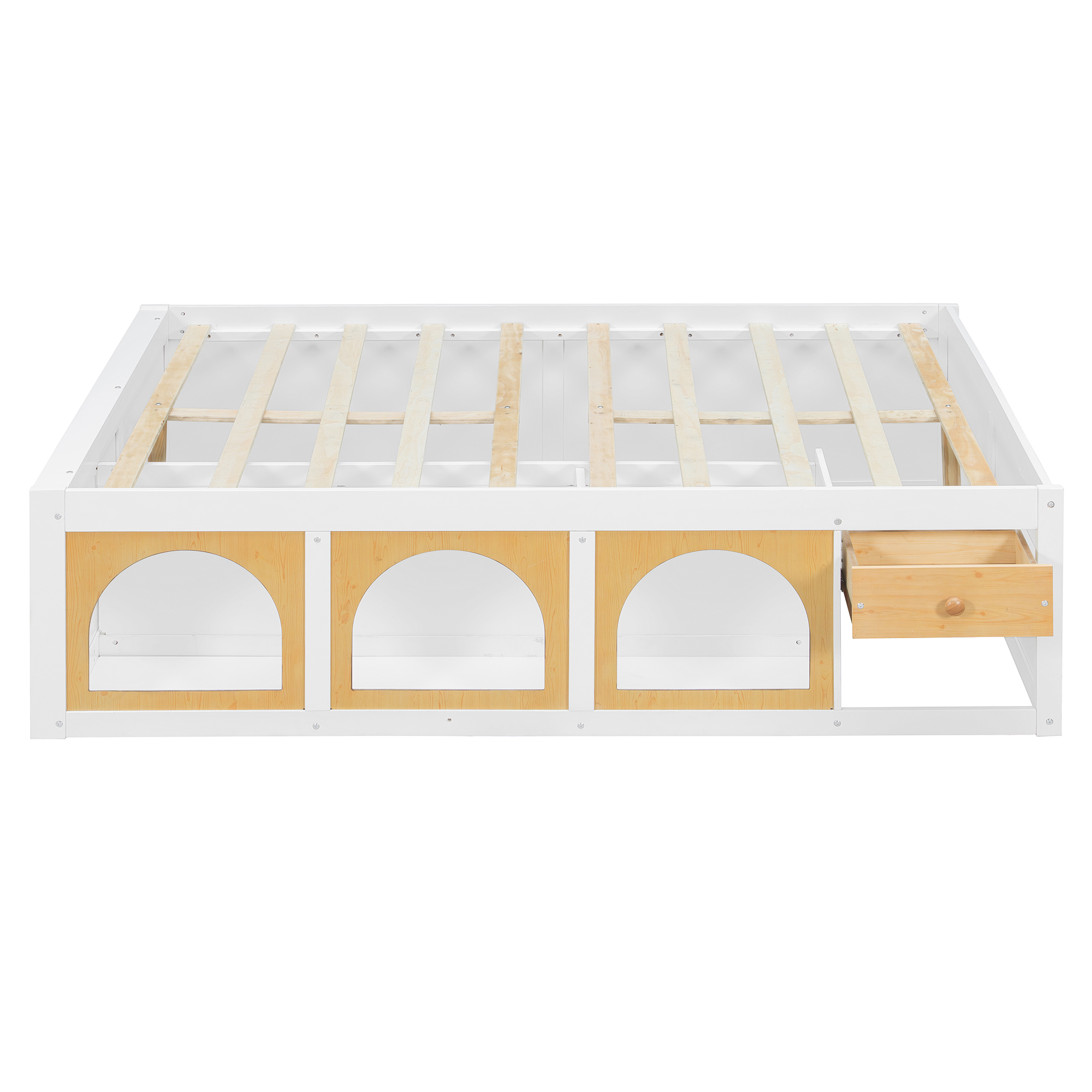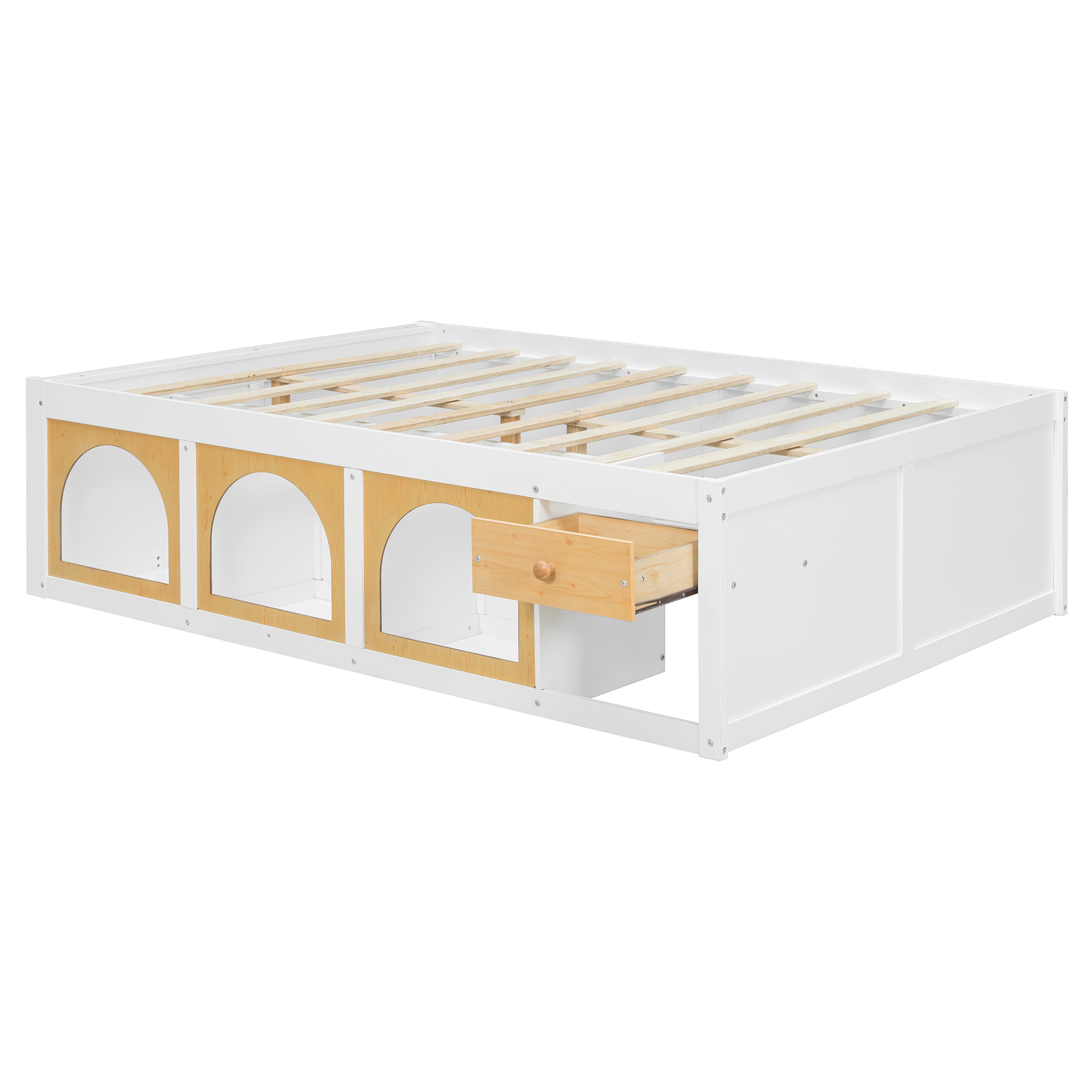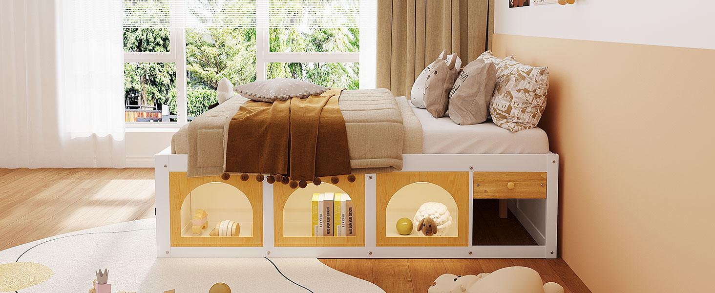 This wooden platform bed offers a perfect blend of functionality and modern style. Designed with a bookshelf at the foot of the bed, it keeps your books neatly organized and within easy reach. The side display cabinet offers additional space to store or display your favorite items, and the LED lighting adds a touch of warmth and charm to the room. The bed features a simple yet practical drawer, providing extra storage for small items. Choose from two color options – White+Natural or Pink+White – to match your unique bedroom style. Available in both Full and Queen sizes, this bed is a wonderful addition to any modern space.
