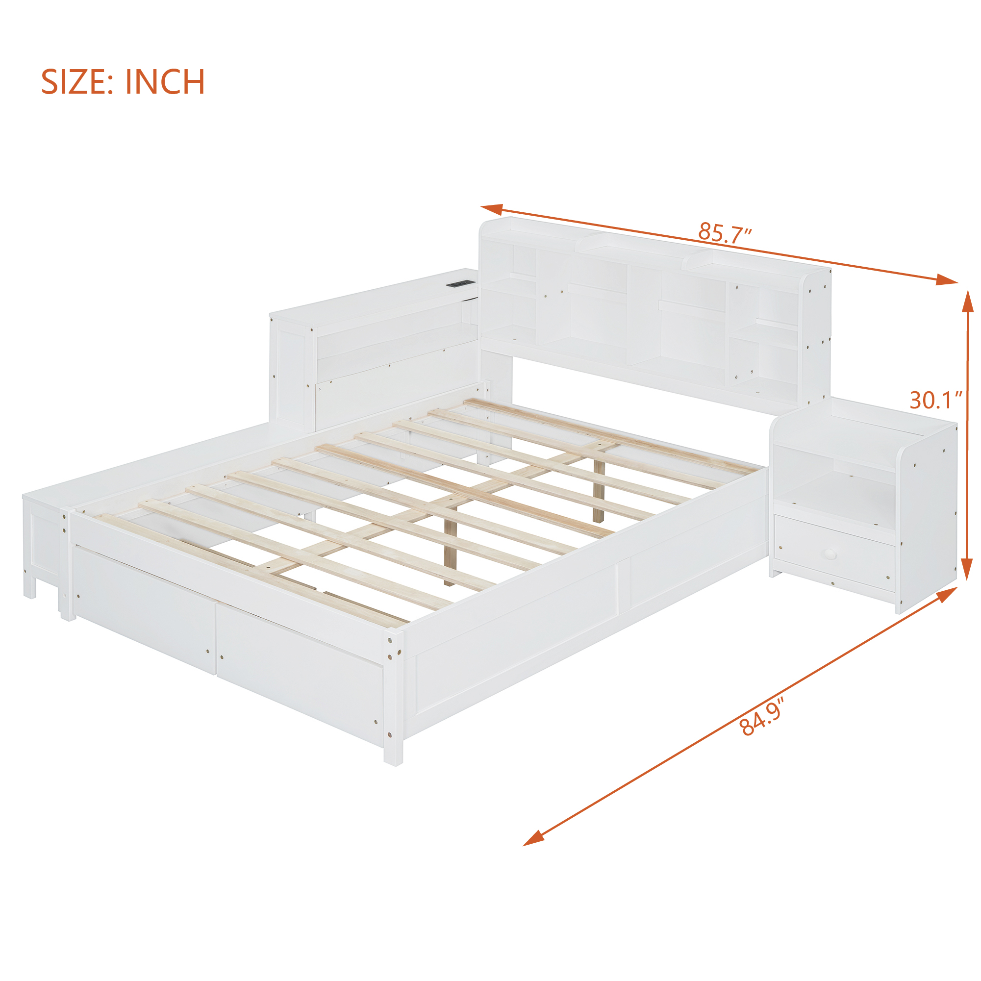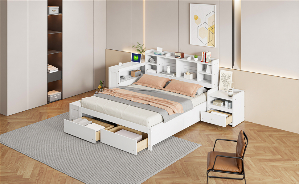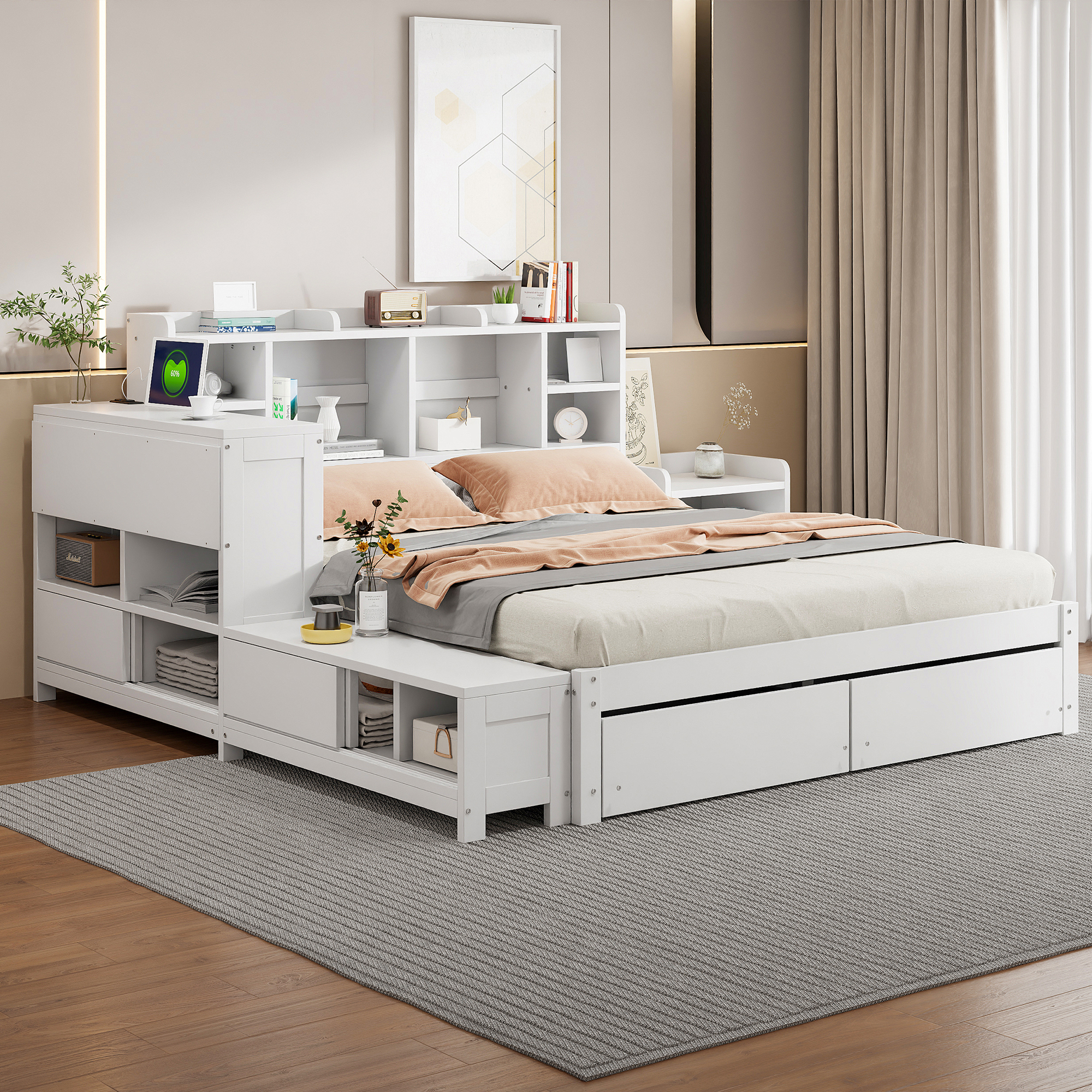 (Price Includes Shipping, No Tax Fee.)Transform your bedroom with this sleek and functional wooden platform bed, designed to combine style and practicality. Featuring a headboard with multi-size storage compartments for your essentials like clocks, glasses, and phones, this bed keeps your items within easy reach. A built-in desk on the side offers a convenient space for work or study, with a USB charging port to ensure your devices stay powered up. Below the desk, ample storage options are available. The bed also includes a nightstand, and two storage drawers at the foot of the bed to meet all your daily storage needs. With this multi-functional design, enjoy a clutter-free and convenient living space.