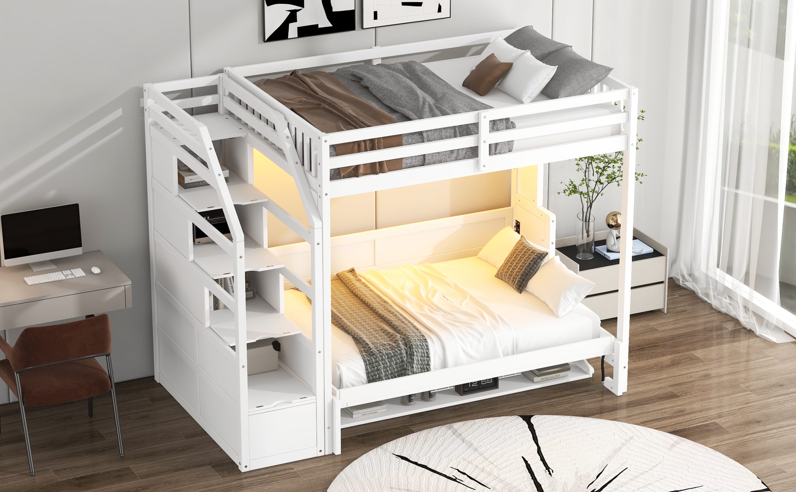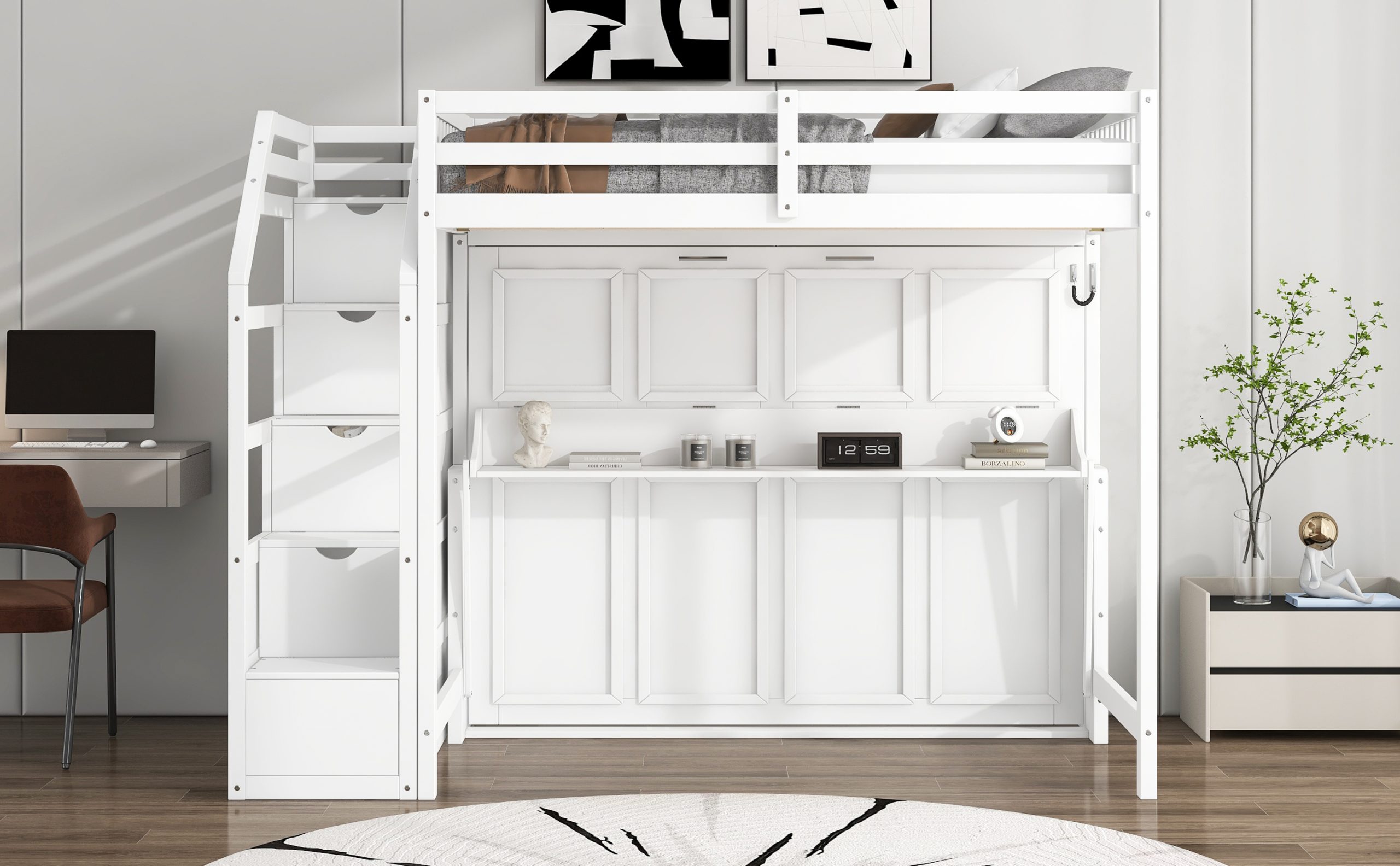 Full Xl Size Loft Bed With Storage Staircase And Full Size Murphy Bed With LED Light