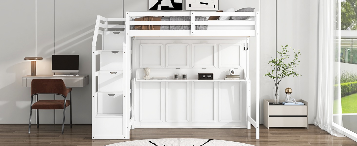 (Price Includes Shipping, No Tax Fee.)This loft bed is a clever space-saving design that will make a great addition to your child’s room. It features a full-size, full-length guardrail single bed and a storage staircase for books or other items. We really like the storage compartments built into the staircase leading up to the bed. The entire bed is made of high-quality solid pine and MDF, making it sturdy and durable. The clean lines and style of this loft bed complement any bedroom style. The Murphy bed on the lower level is the perfect solution for small spaces. When the bed is folded up, it can save a lot of space for your daily activities. The wooden board on the outer surface of the bed can be used for temporary office or storage.