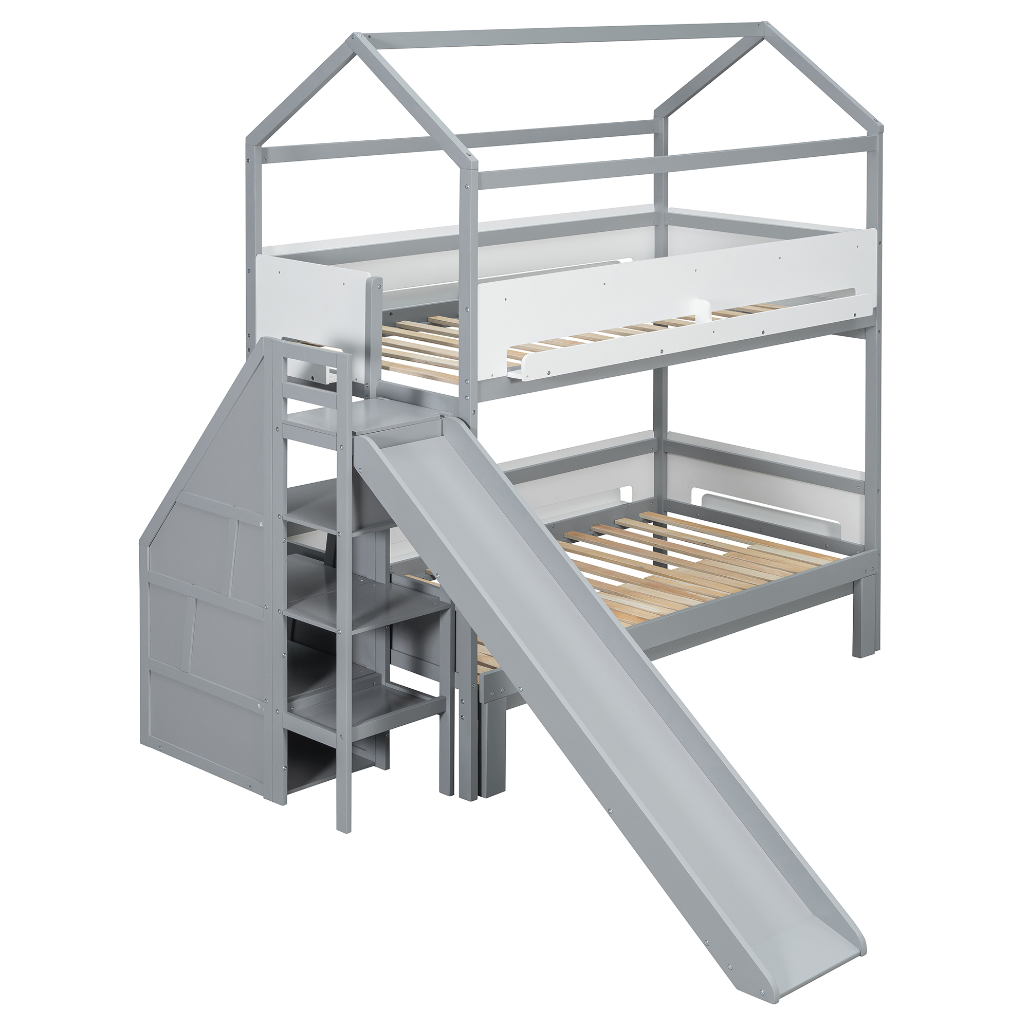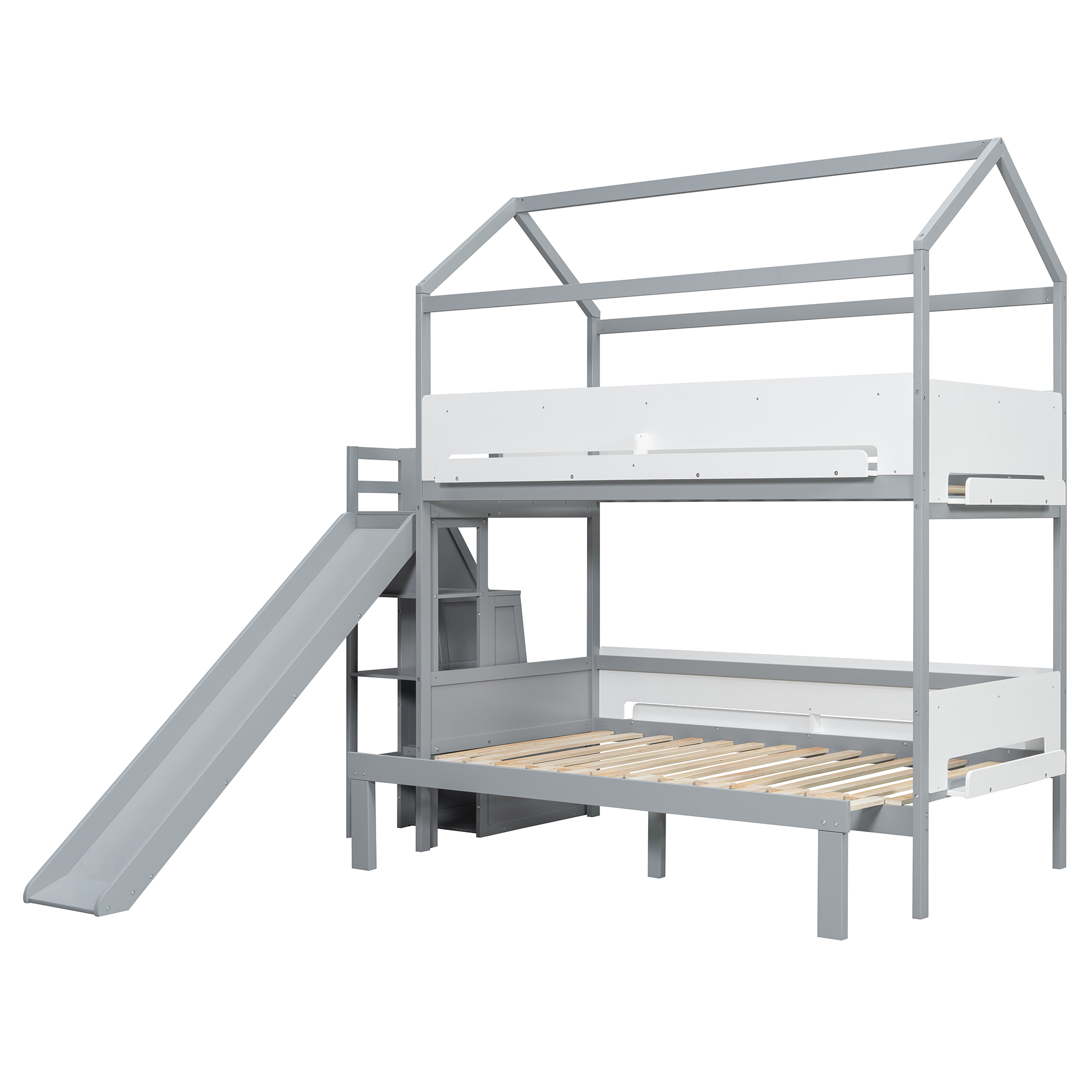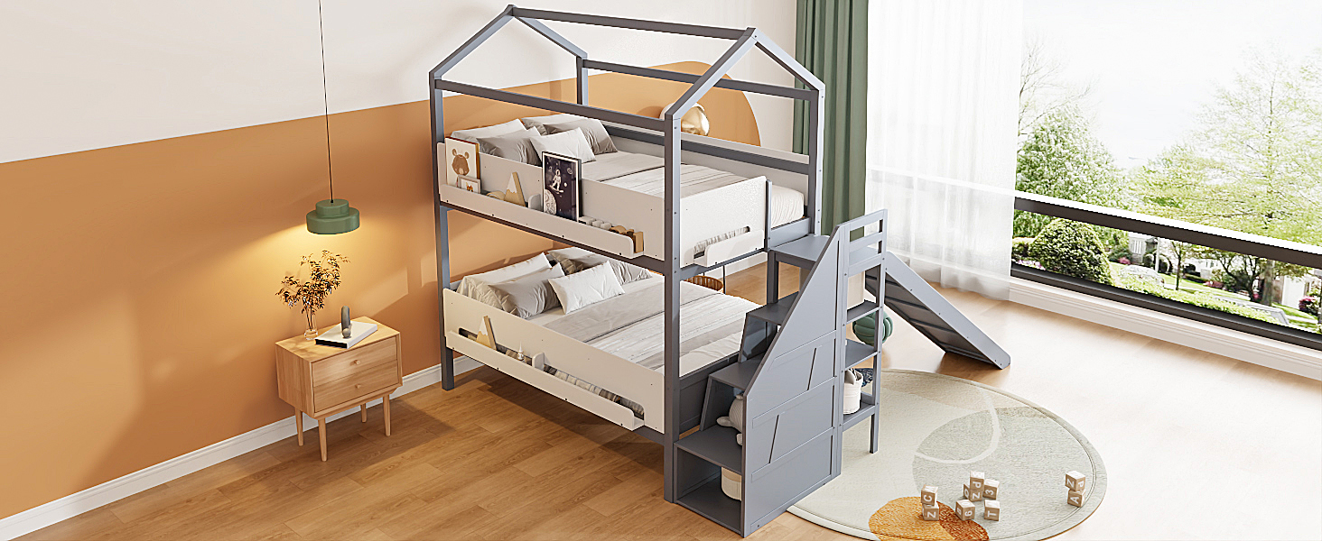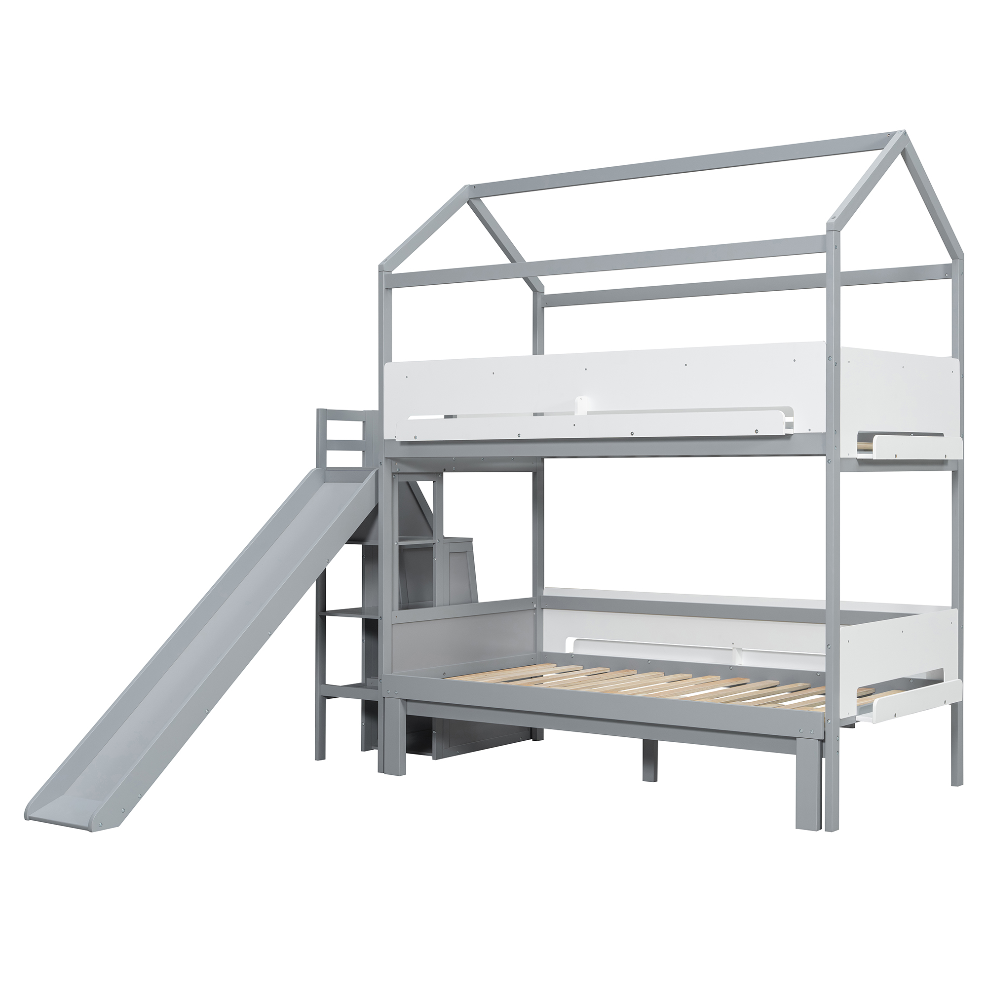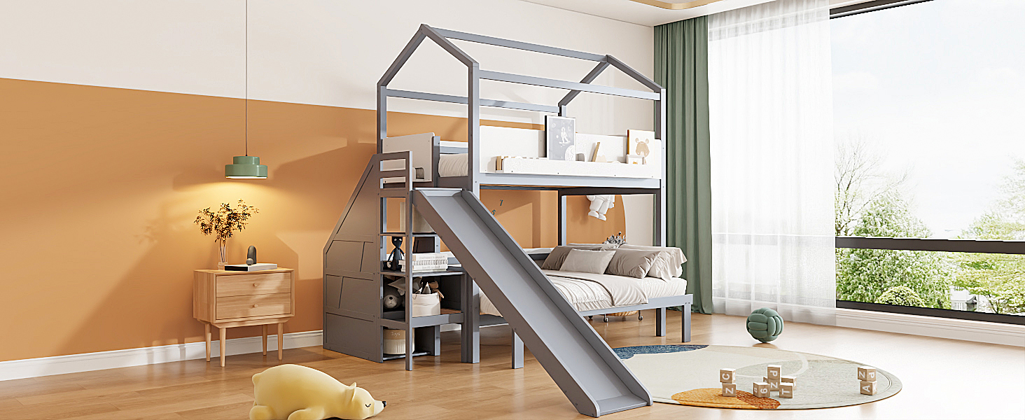 House-Shaped Wooden Bunk Bed with Slide & Storage Staircase