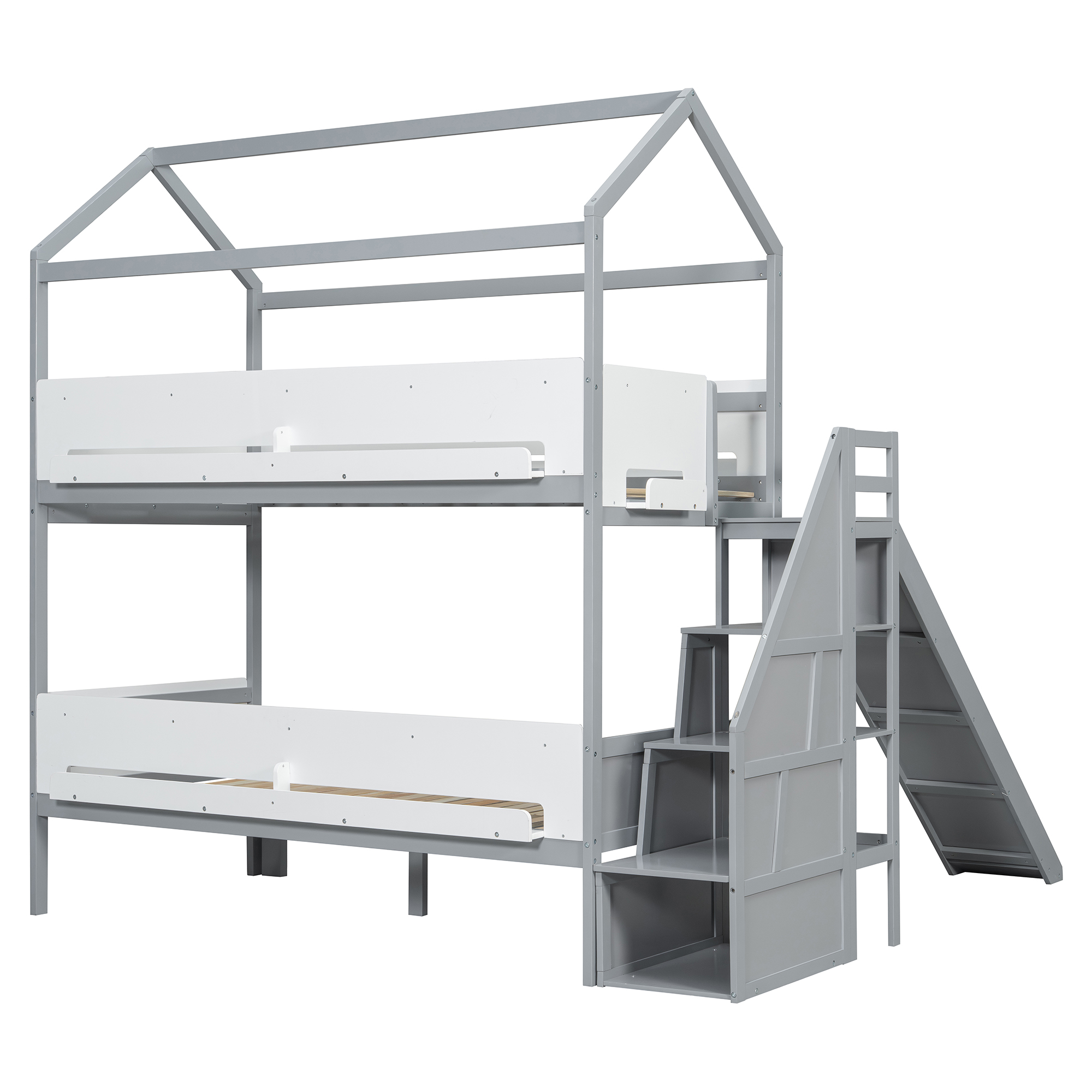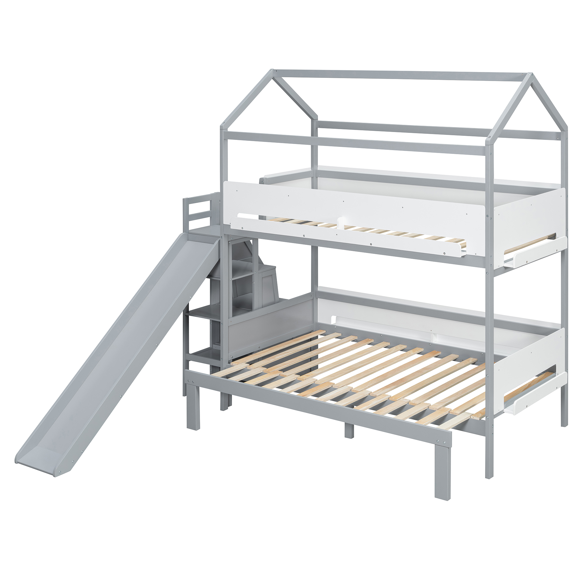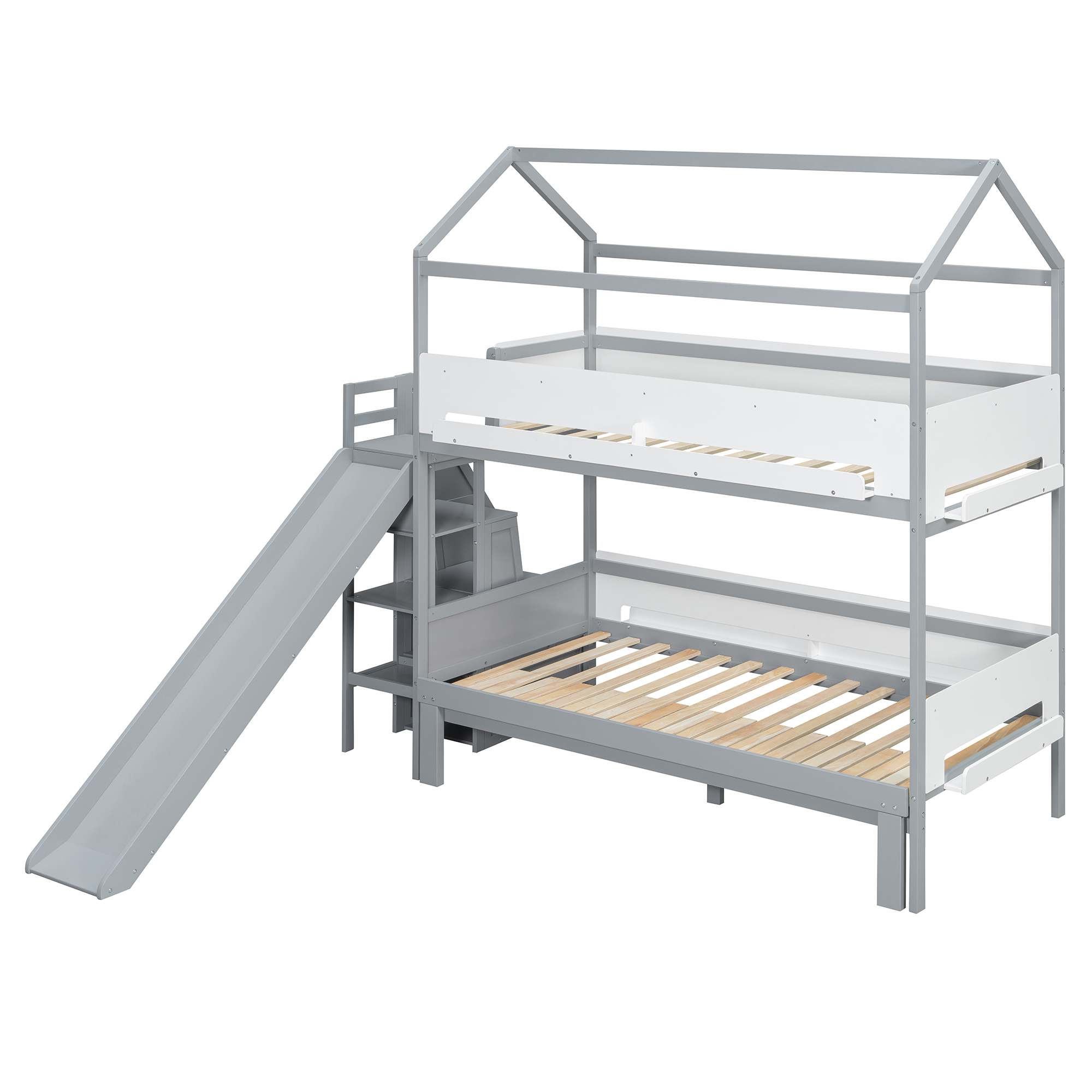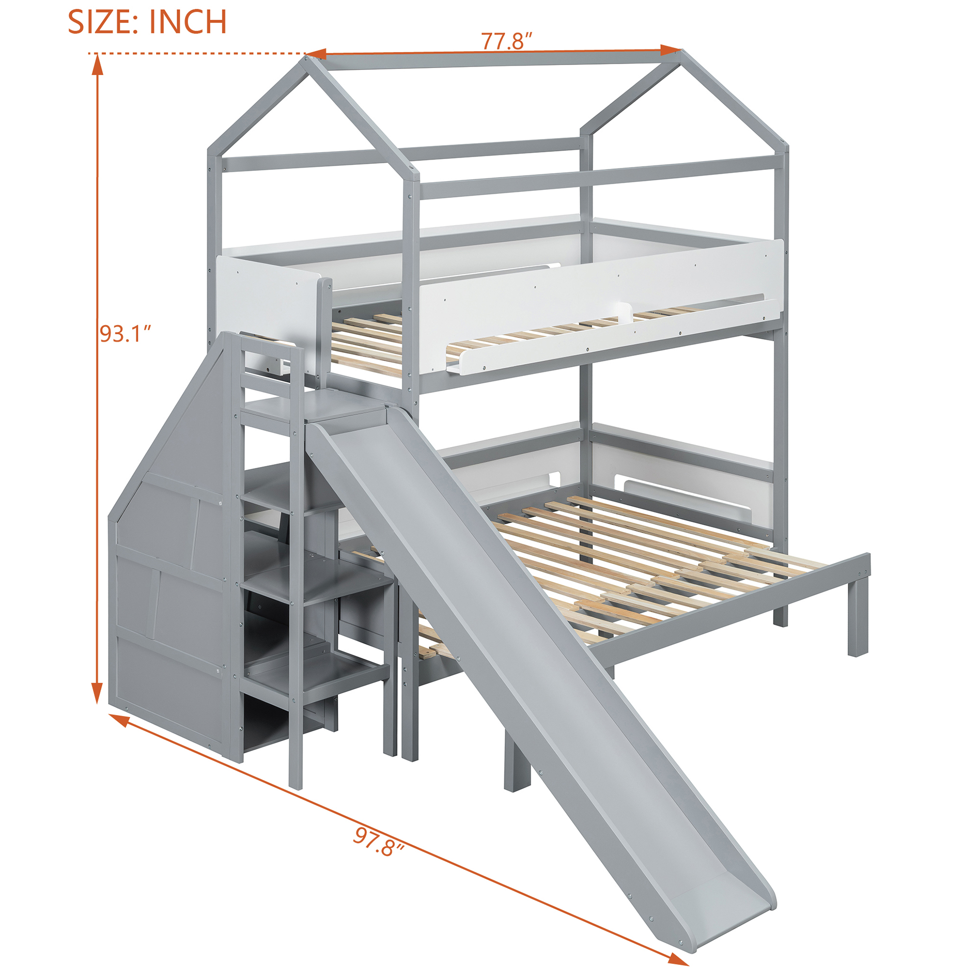 House-Shaped Wooden Bunk Bed with Slide & Storage Staircase