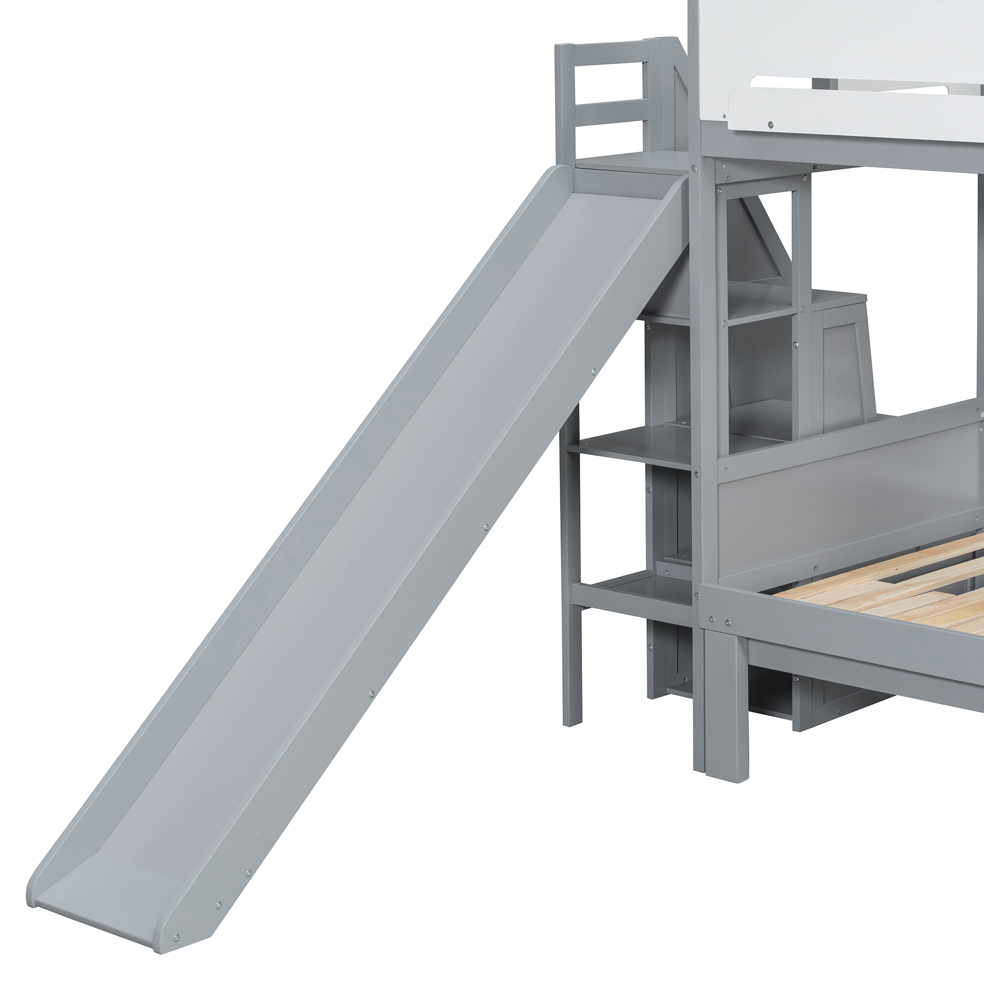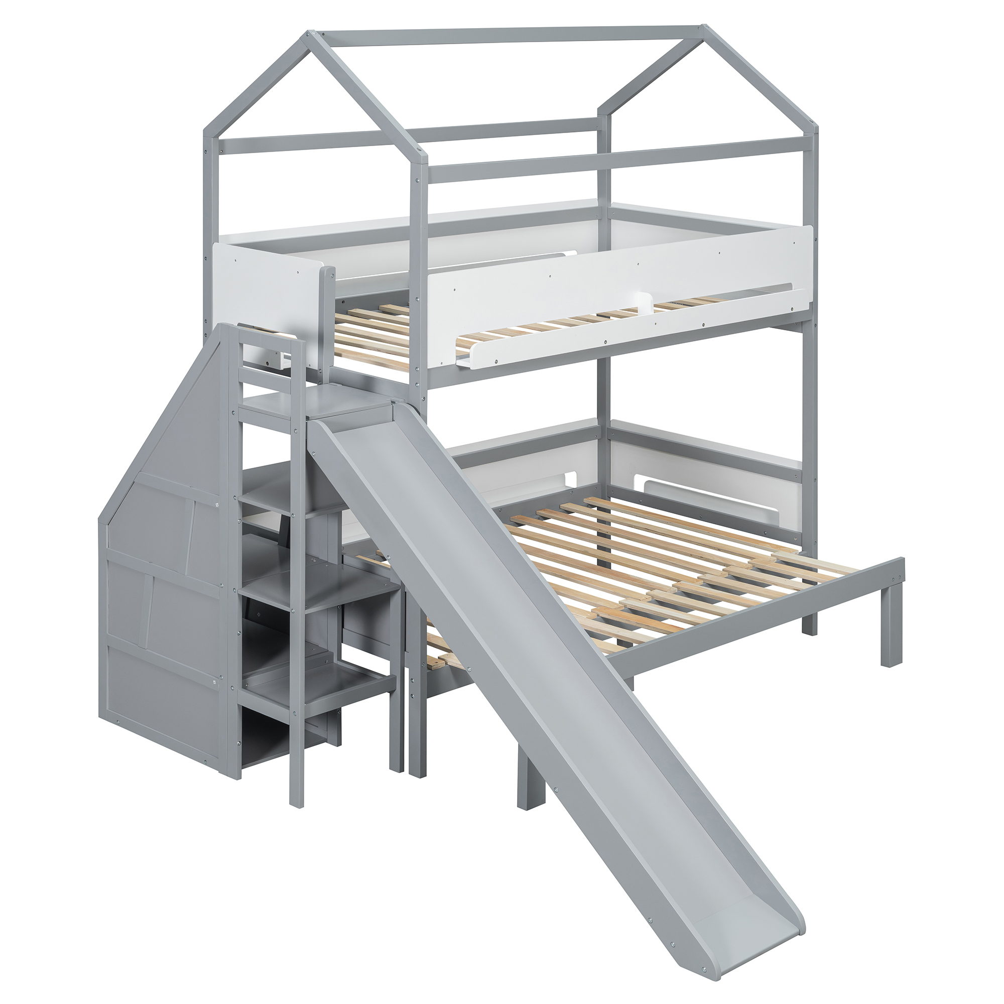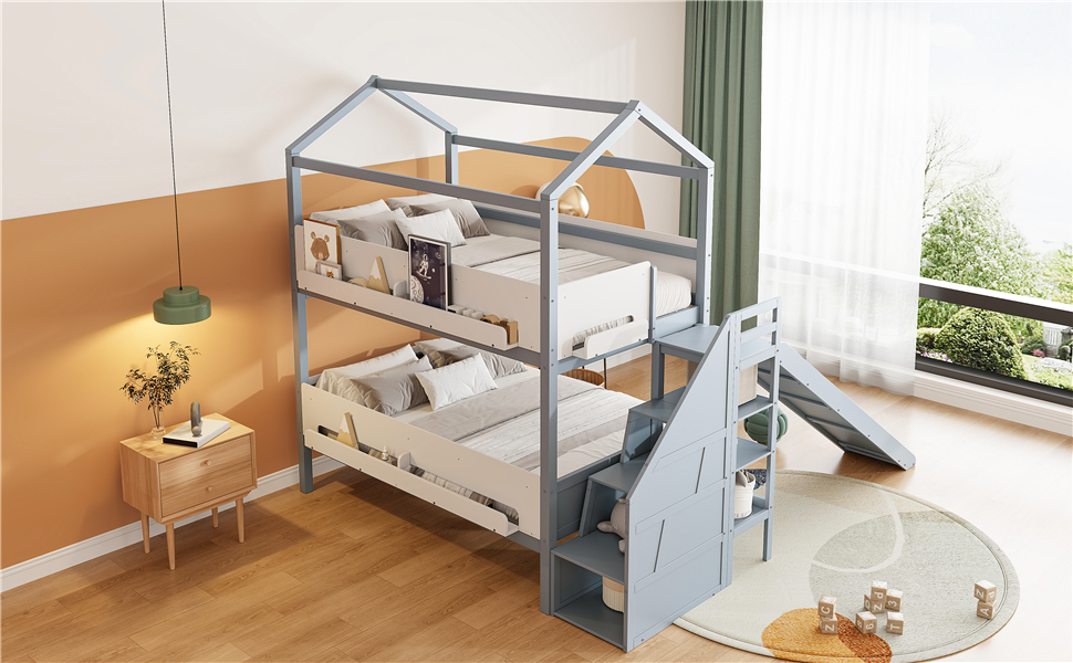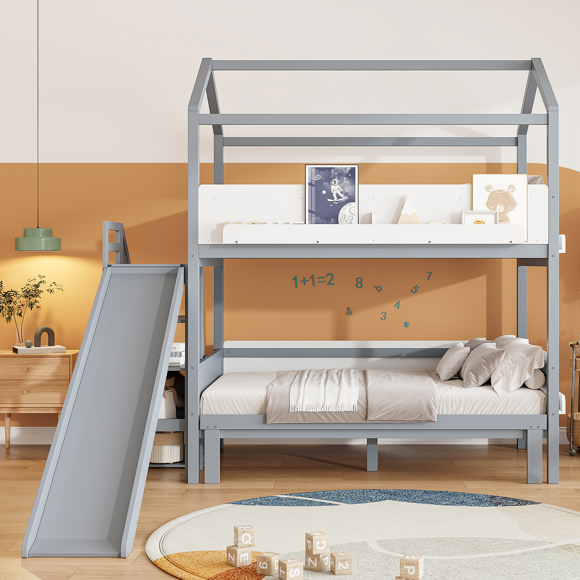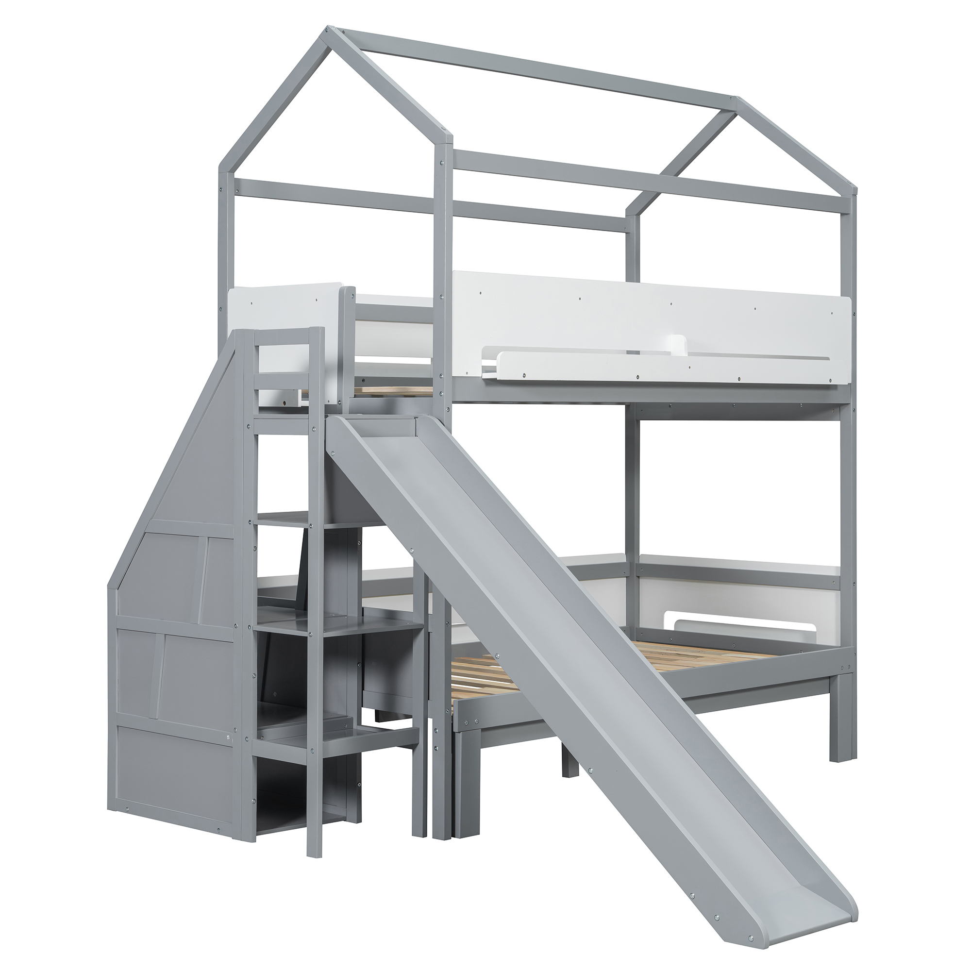 House-Shaped Wooden Bunk Bed with Slide & Storage Staircase